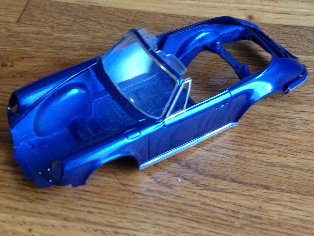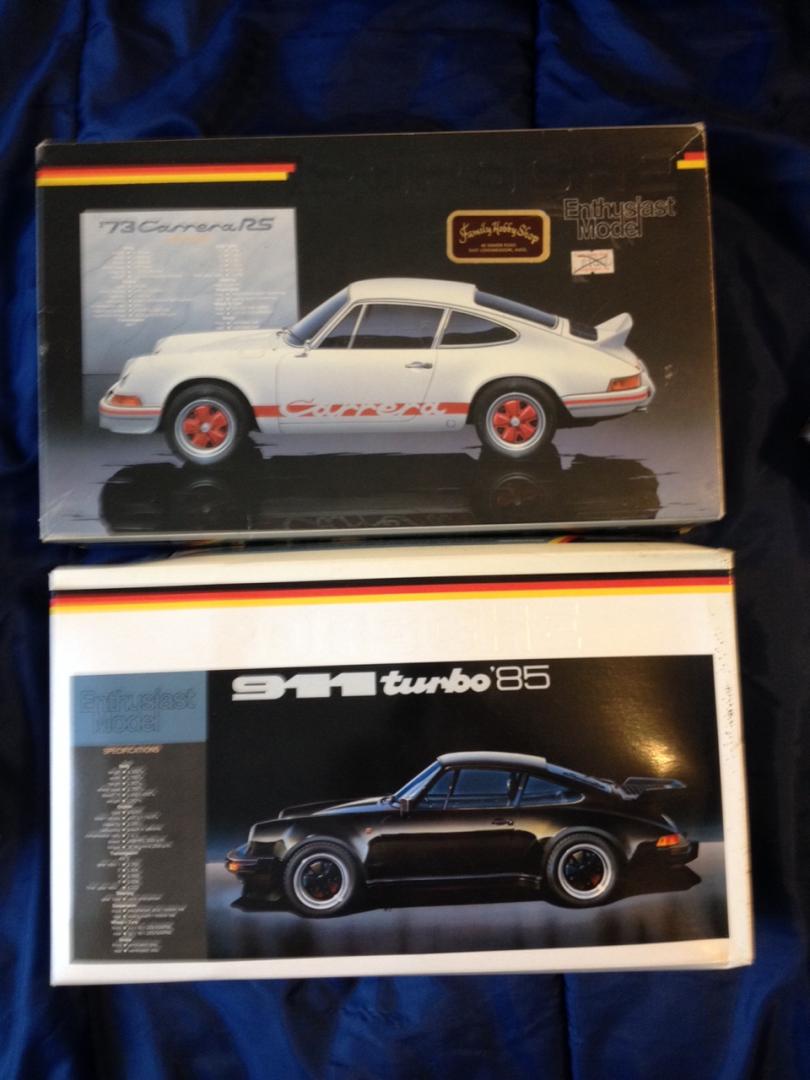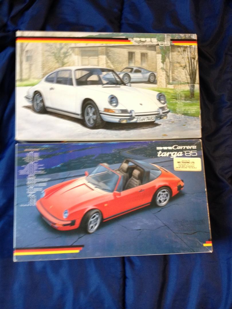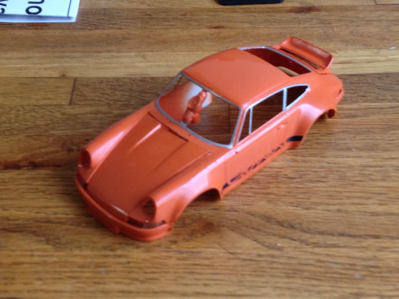 Fujimi makes the 911 in all three body styles - narrow, SC flares, and wide body - as well as kits with the newer impact bumpers as well as the original 911. BUT they only sell a few versions or combinations of each. I've always preferred the pre "impact bumper" long-hood 911s but anyone wanting to expand their model range in this direction has to do so by mixing and matching Fujimi kits. The two I have in the works now - just painted- are an orange '73 911 Carrera RSR, and a blue '73 911 Targa, The Carrera RSR combines the long hood, front and rear bumpers of the Fujimi '73 Carrera RS with the wider body, wheels and tires of the '85 911 Turbo. I'm also using the intake from the Fujimi '67 911R, and straight exhaust headers from Scale Production, which makes a number of Porsche 911 resin parts. The Targa combines the long hood, front and rear bumpers of the Fujimi '69 911 with a Fujimi '85 Targa kit. Kit combinations and painted bodies shown.