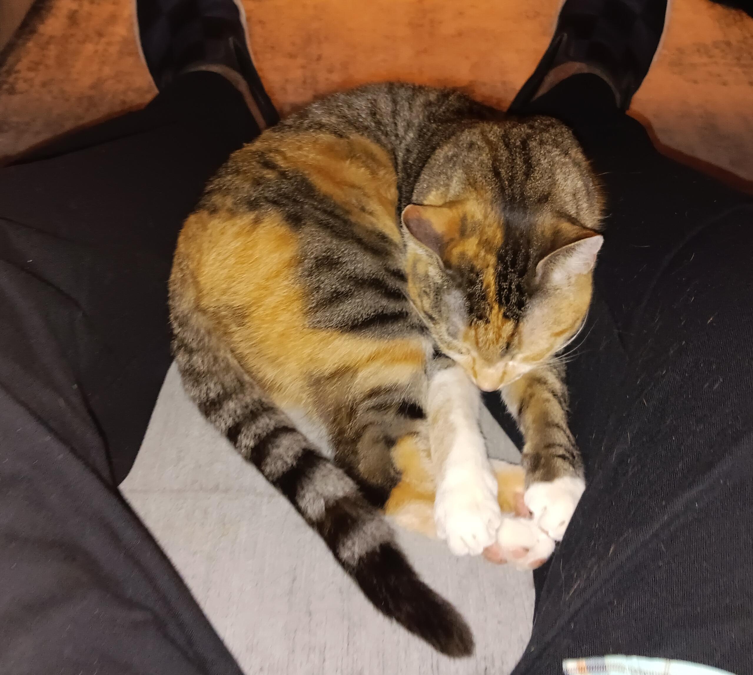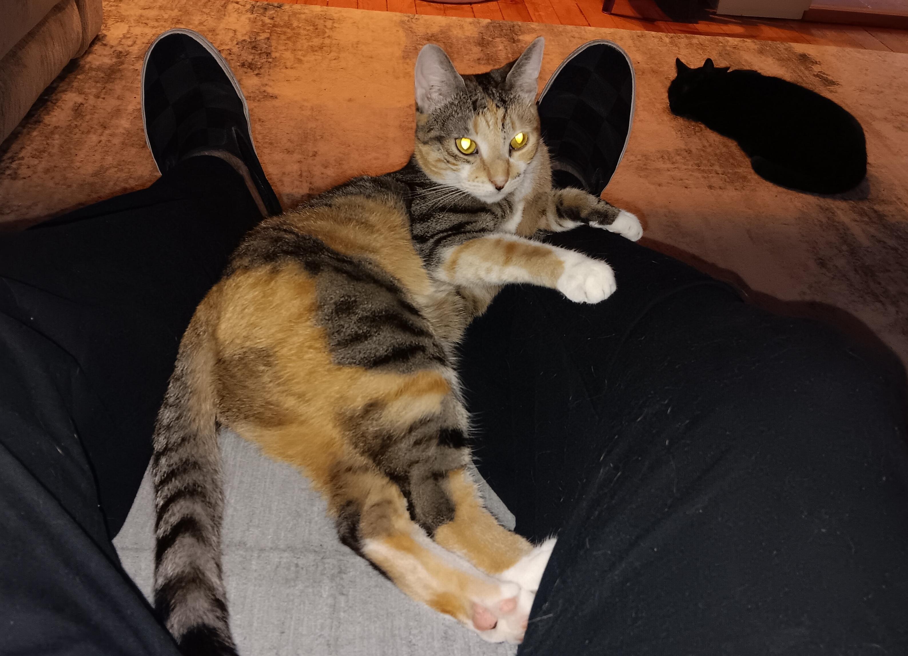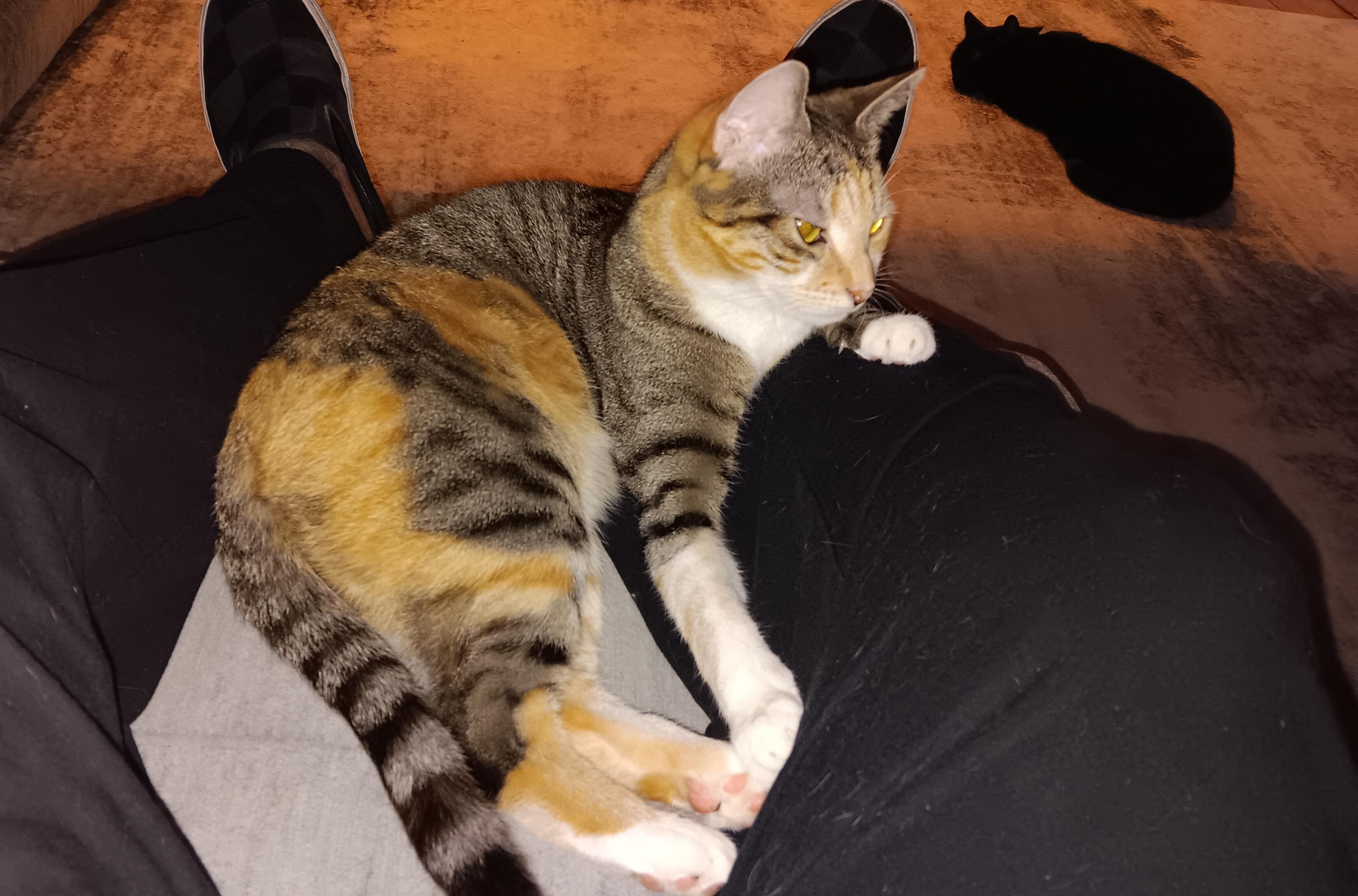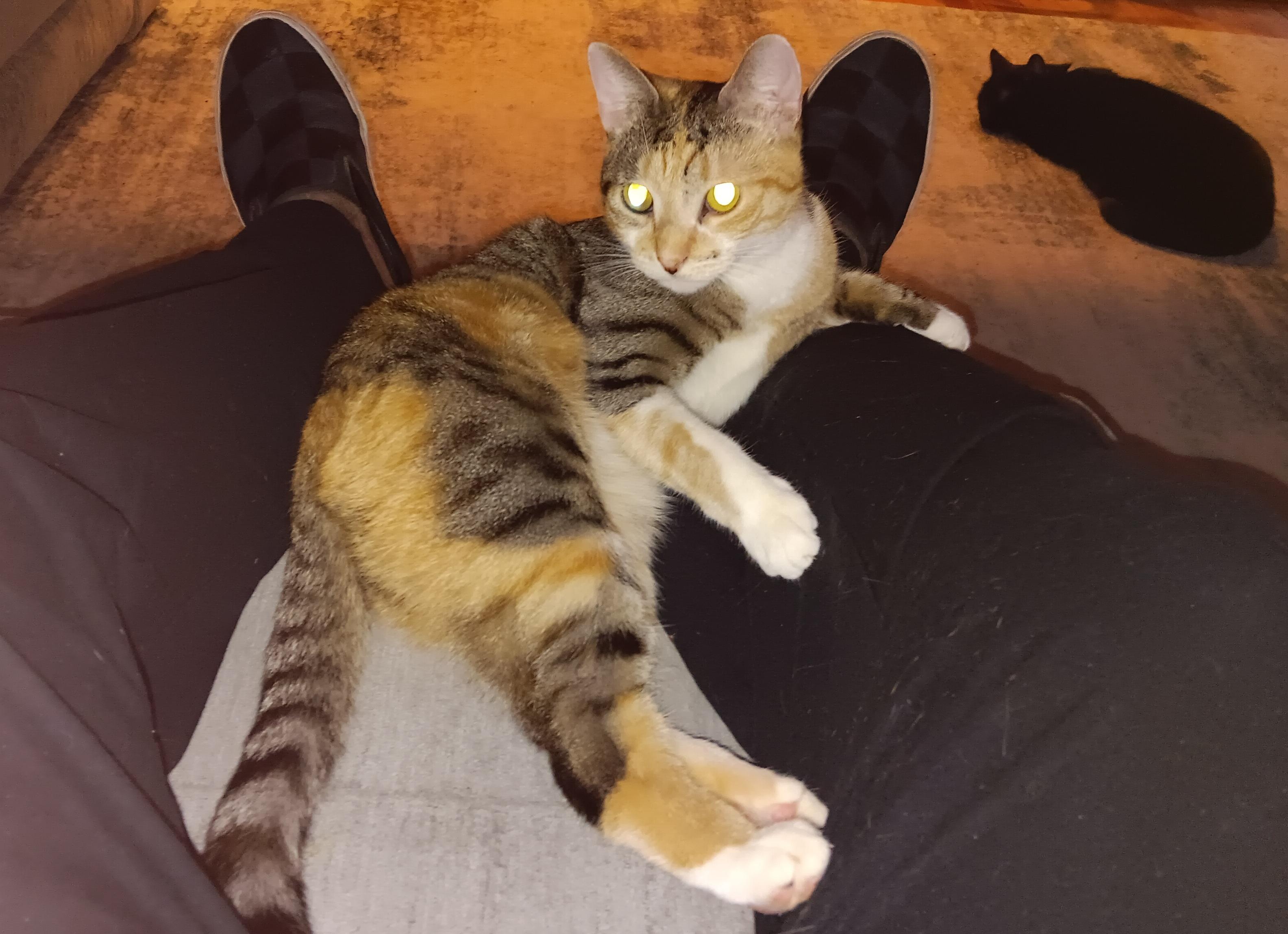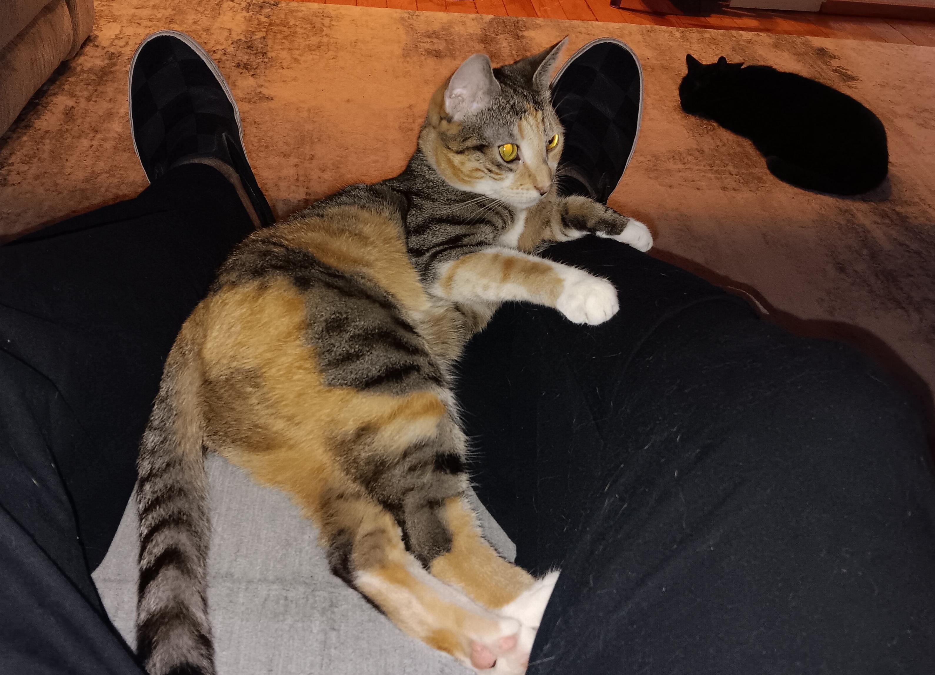 I agree, she is stunning. She was at the shelter with her sister, who is a straight up striped tabby with some red patches on her. That one is on the shy side. I'm not sure if she is a calico or a patch-tabby. I'm thinking patch-tabby. Our departed Chloe was a patch-tabby, great colors too. Like Chloe, this one has a brindle coat, not smooth at all.