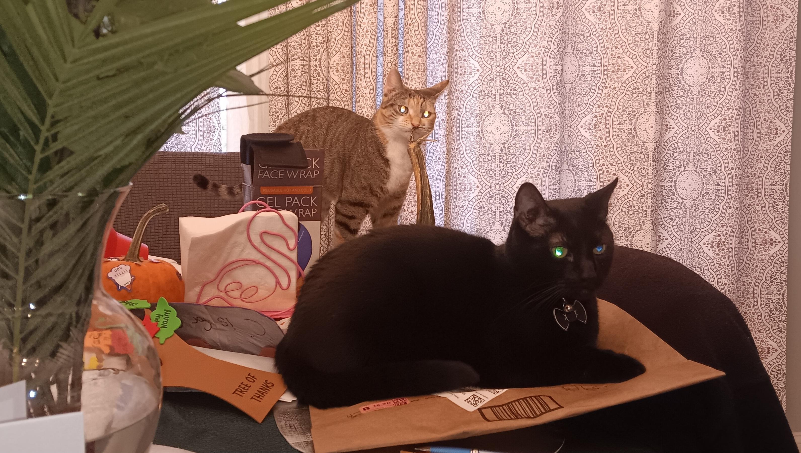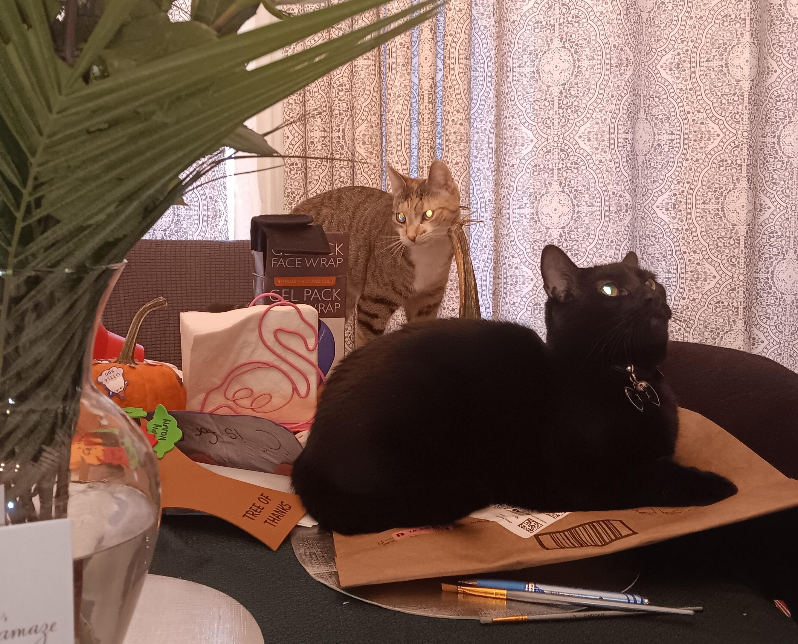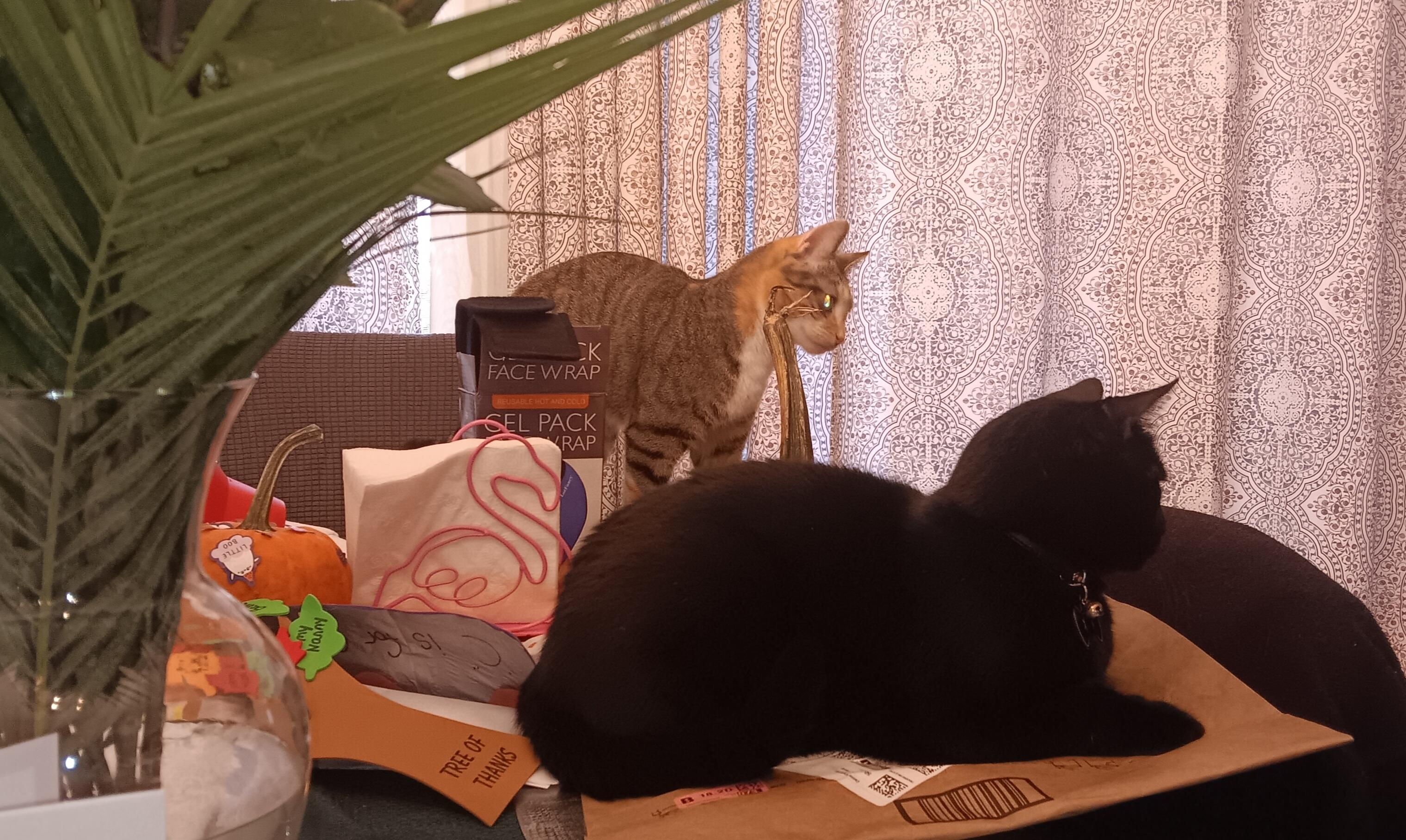 Brie and Mr. Beers on the table. I brought in the Amazon package inside, put it on the table and Mr. Beers promptly claimed it as HIS.