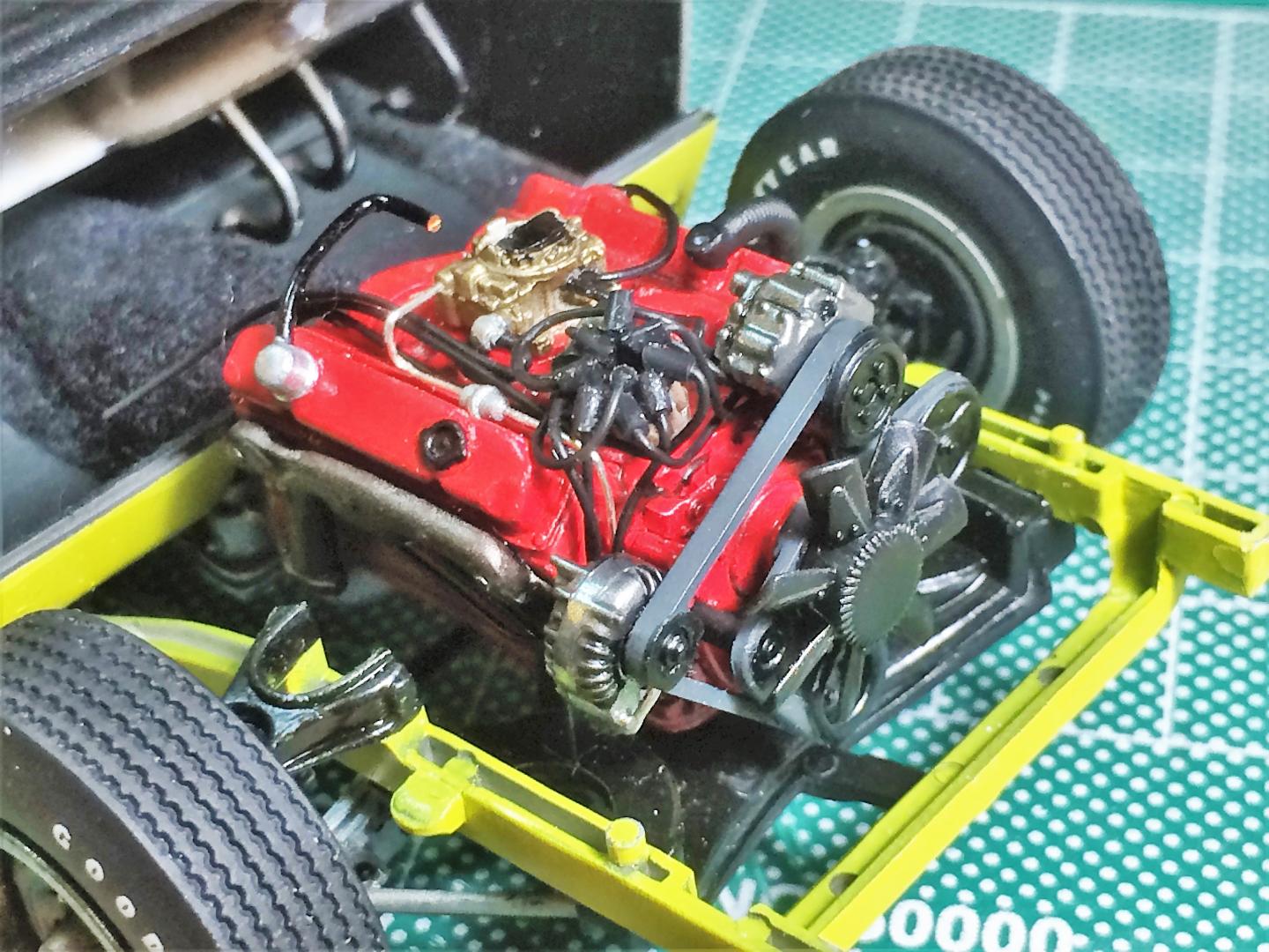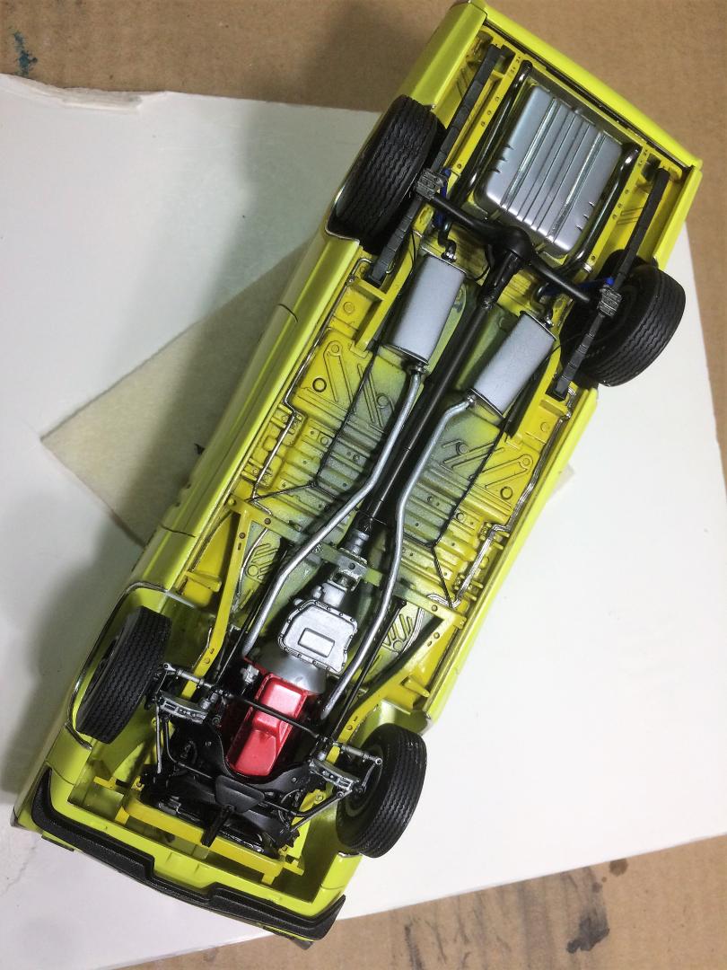 - Paint is Citron Yella with 2-part clear coat, both from Gravity Colors. Inteior is Mr. Color Tyre Black, which to my eyes is a very convincing black leather (has that lightish hue that leather always seems to have). Other paints are Testors, Mr. Color, and Alclad II metallics. All chrome parts were stripped and re-chromed with Alclad II.