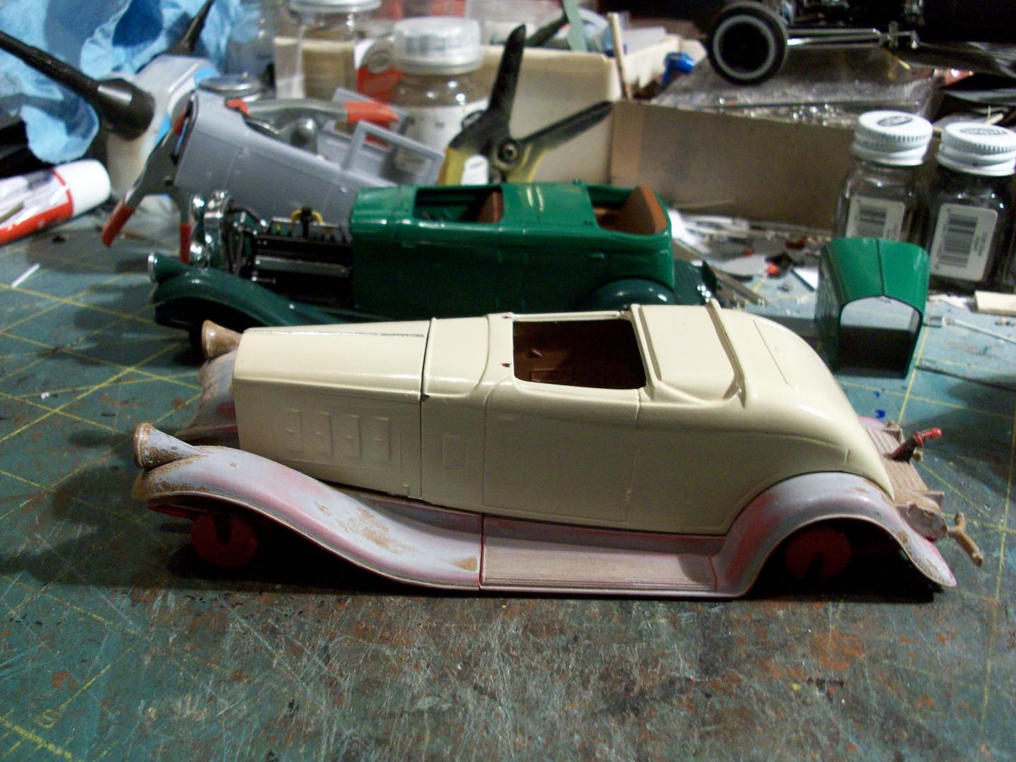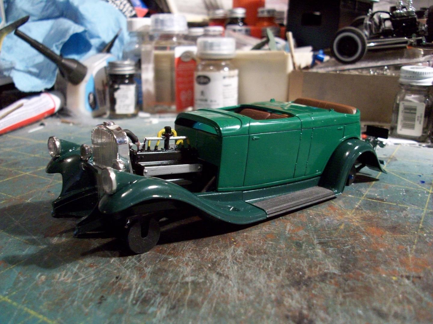 Many moons ago I started building the Pyro 1/32 scale 1932 Pierce Arrow kits, both the Convertible Phaeton and the Custom Convertible. For some reason I don't remember, I put them both back in their boxes barely started. With a resurgence in my interest in these Pyro classics, I dug them out and vowed to finish them both. So here we go... starting with the Custom Convertible. The first picture shows my lack of progress when it went back in the box. After some fine sanding to remove any "crud", today I got some paint on the fenders. The second model is the Convertible Phaeton and it was pretty much in the same stage as the Custom Convertible This is how it looked out of storage: ... and after adding paint to the body and installing the engine and most of the chrome parts today. These classic Pyro kits are excellent for their age and go together extremely well with no fit problems. They are fun to build and represent some vintage and classic automobiles that are not available in any other scale. More to come. Tony