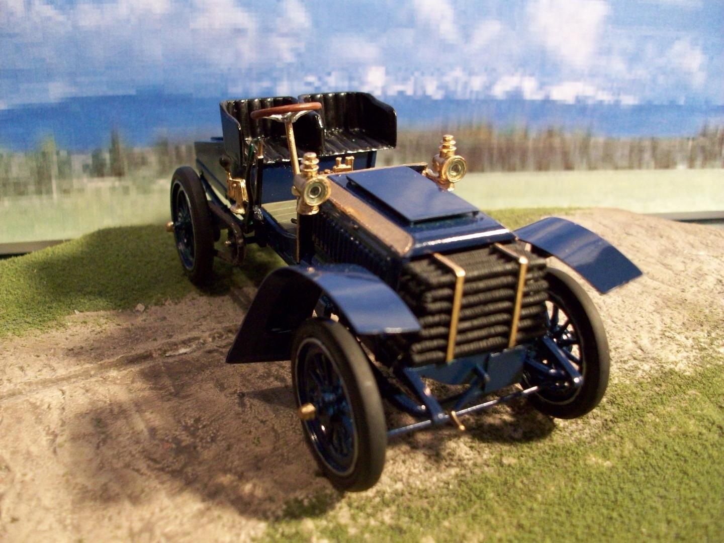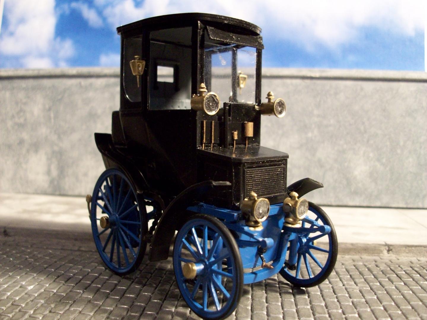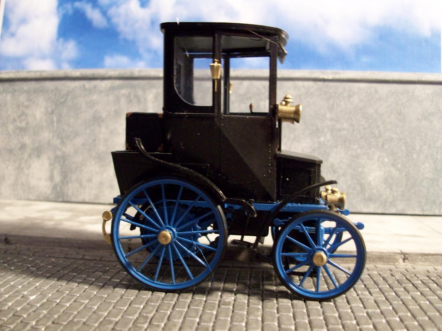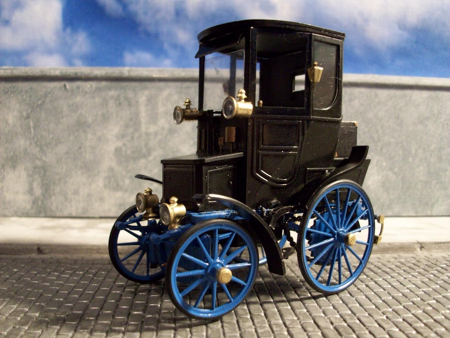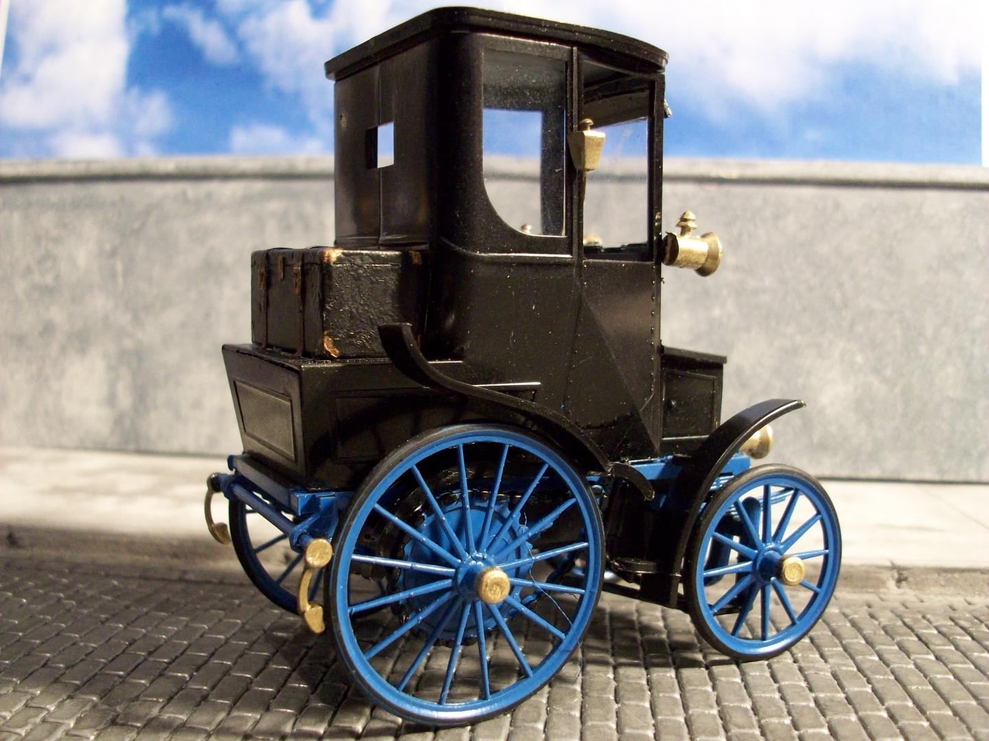 This is another one of those fairly rare 1/32 scale "Europe" kits, the 1895 coupe. I am only aware of three kits in this Panhard series, but there may be more. I added the scratch built trunk to sit on the rear "shelf" as it looked kinda empty without something. Hope you like it. Tony
