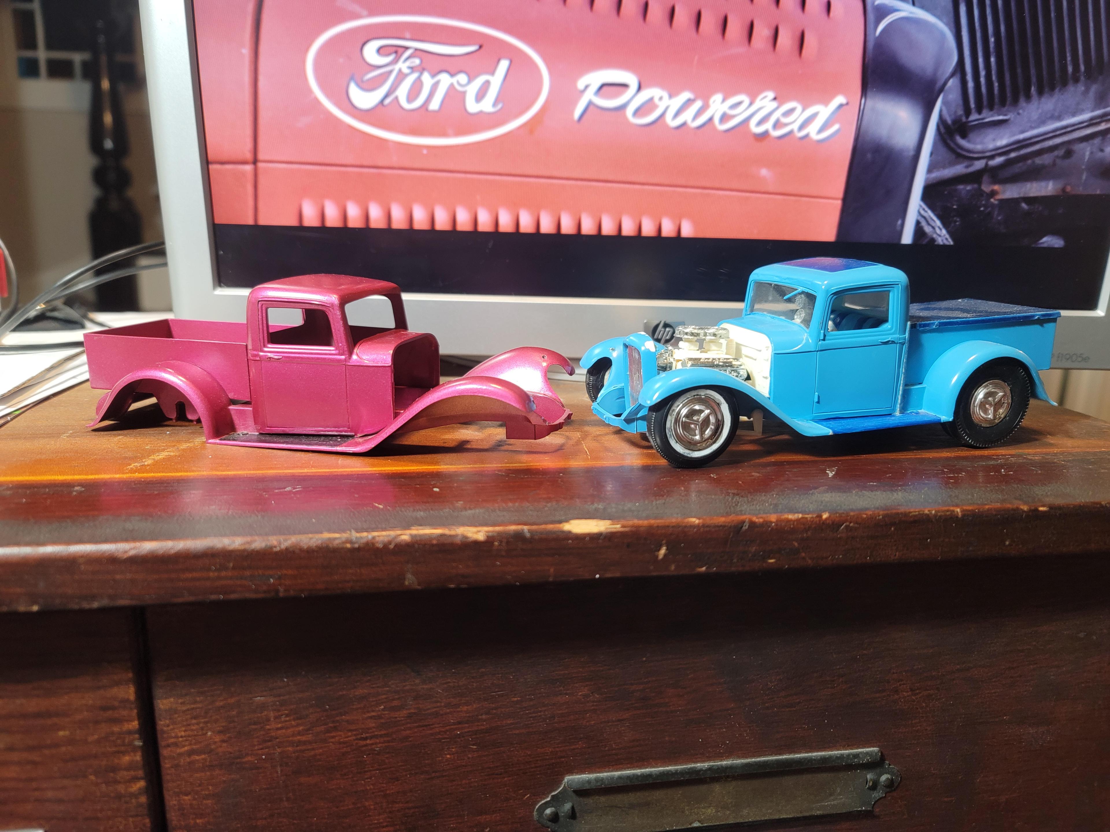 Lindberg 32 pick up.....so inaccurate, but it's definitely a cool piece of history. I've had the Blue survivor for awhile and I don't want to change it in any way. then I ended up with the pink body as part of a parts lot I got... A few of my friends dug out their versions (both old and new builds) and it made me break out my fresh kit. The boxy back half of these trucks don't match the curvy front half so I dug out a trailer from the Revell 37 and started cutting. the Rollpan is made from the roof of a monogram model A coupe. I did a quick Bob of the rear fenders to lighten them up. I also cut the canvas top out. Next step will be the chop and then I have to decide how to blend the fenders into the "bed". After that, it's time to get a quad headlight assembly in there since this is all about a 60s custom rod. -