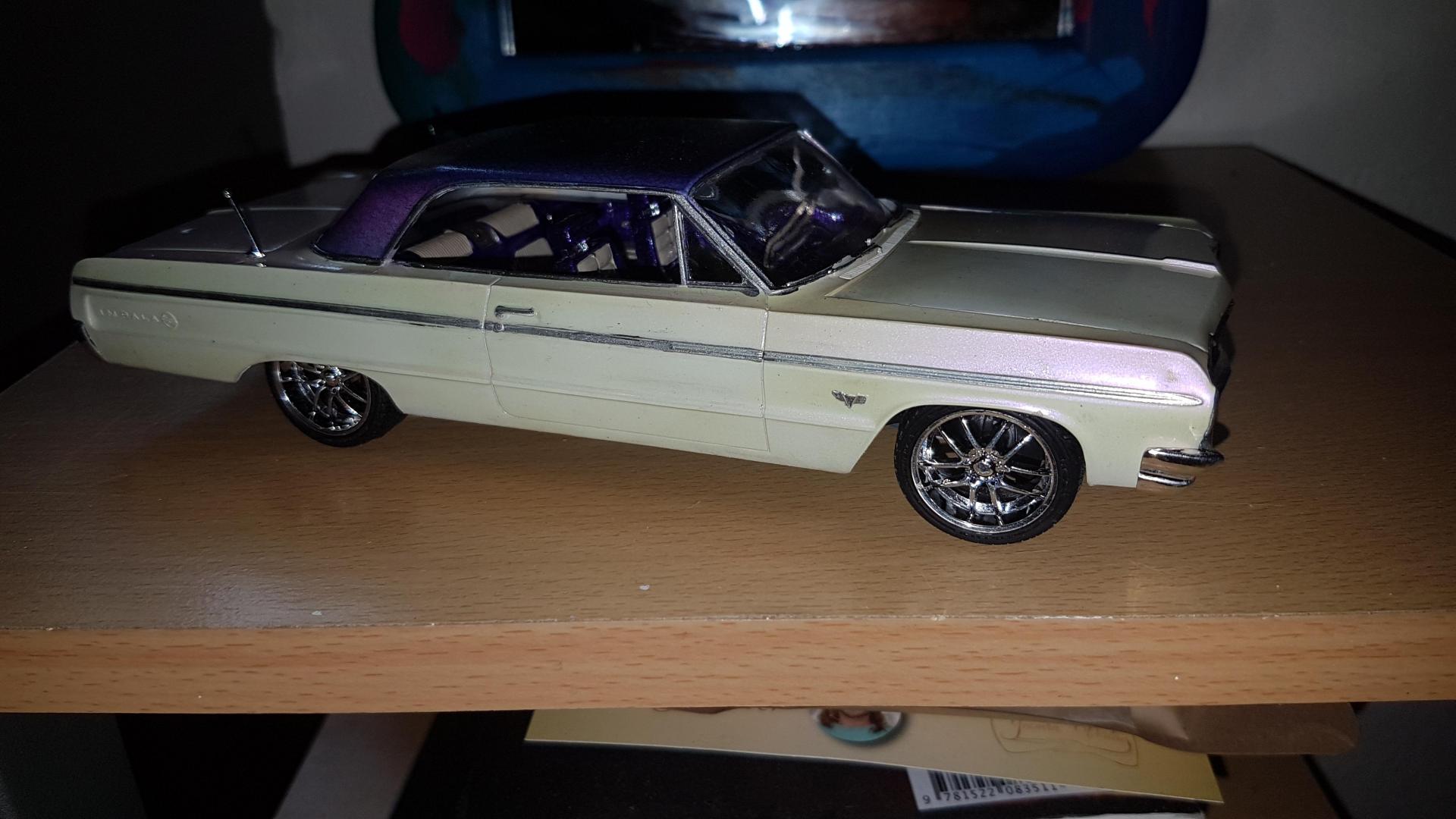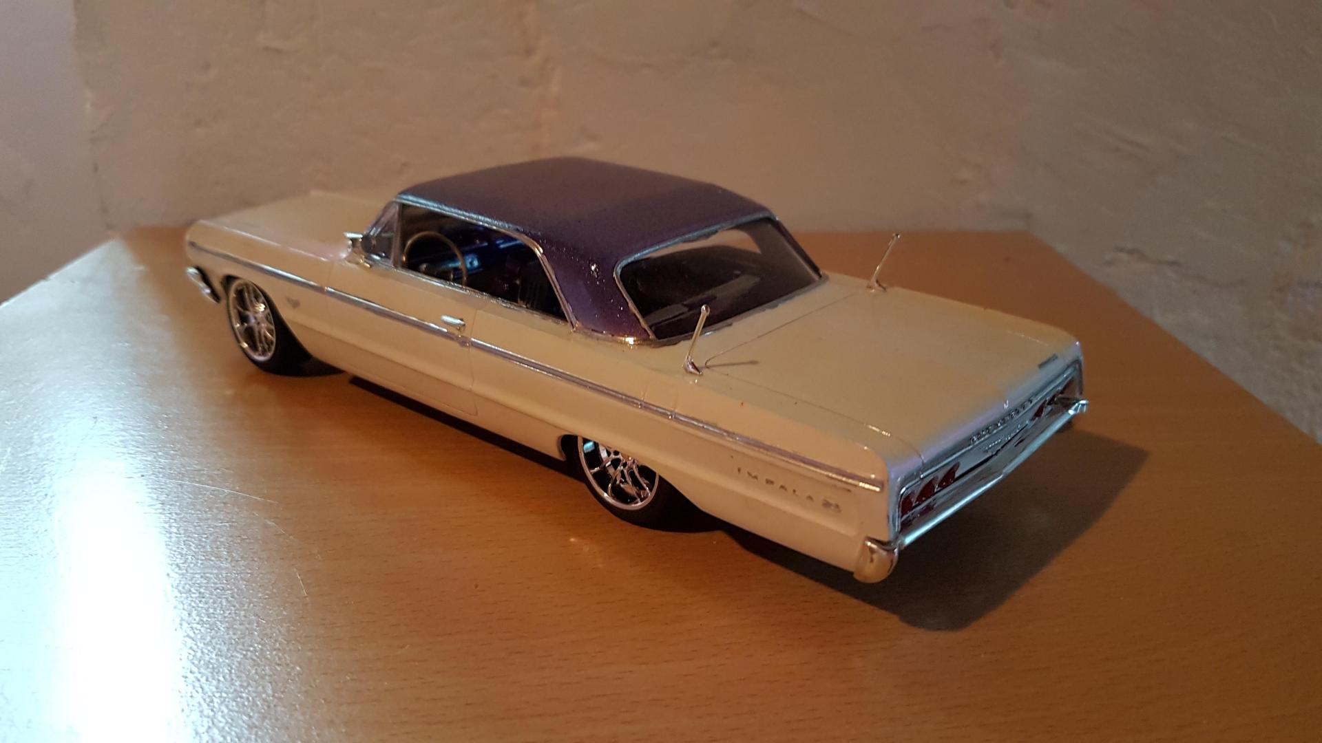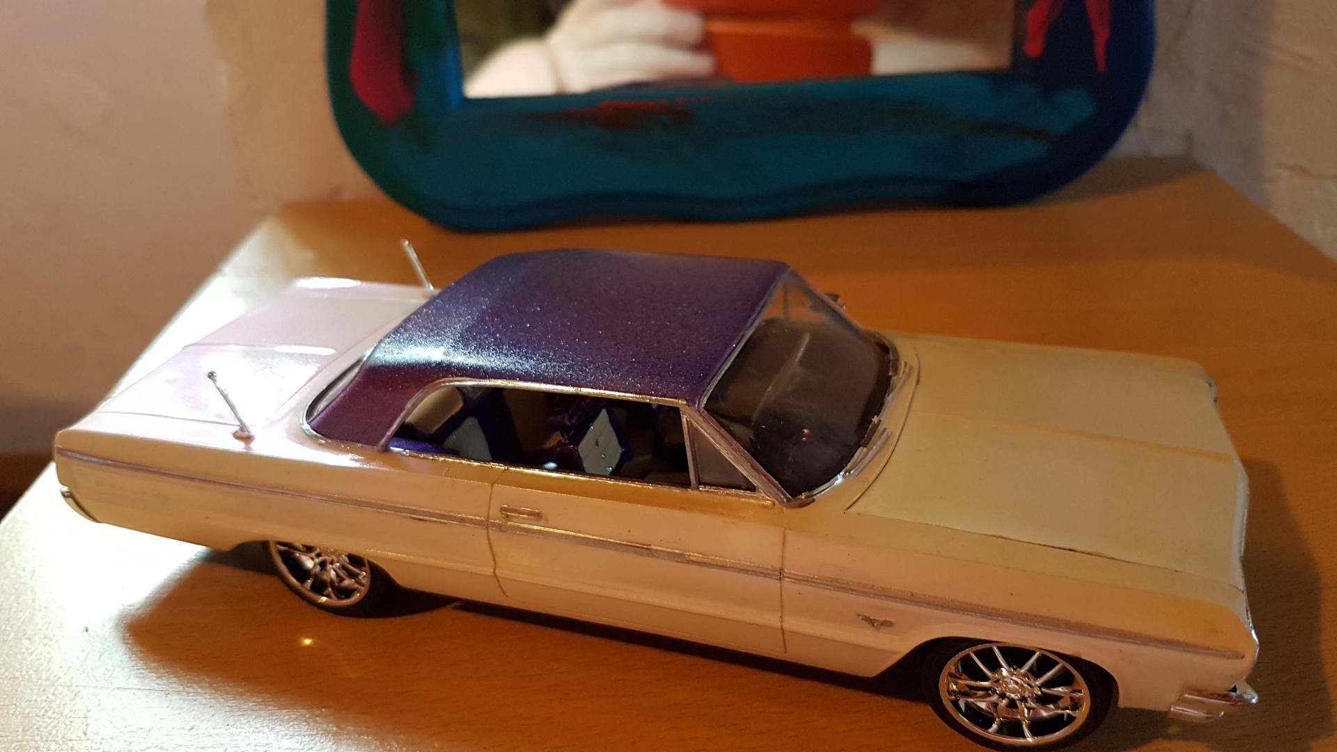HI Folks ! The kit from AMT got a slightly different interior and wheels and tires from Fujimi. Lacquered with white base coat over it violet iridescent nail polish. The roof in silver, above a mixture of blue and red for a slightly violet effect with silver flitter paint. Greetings from Jan