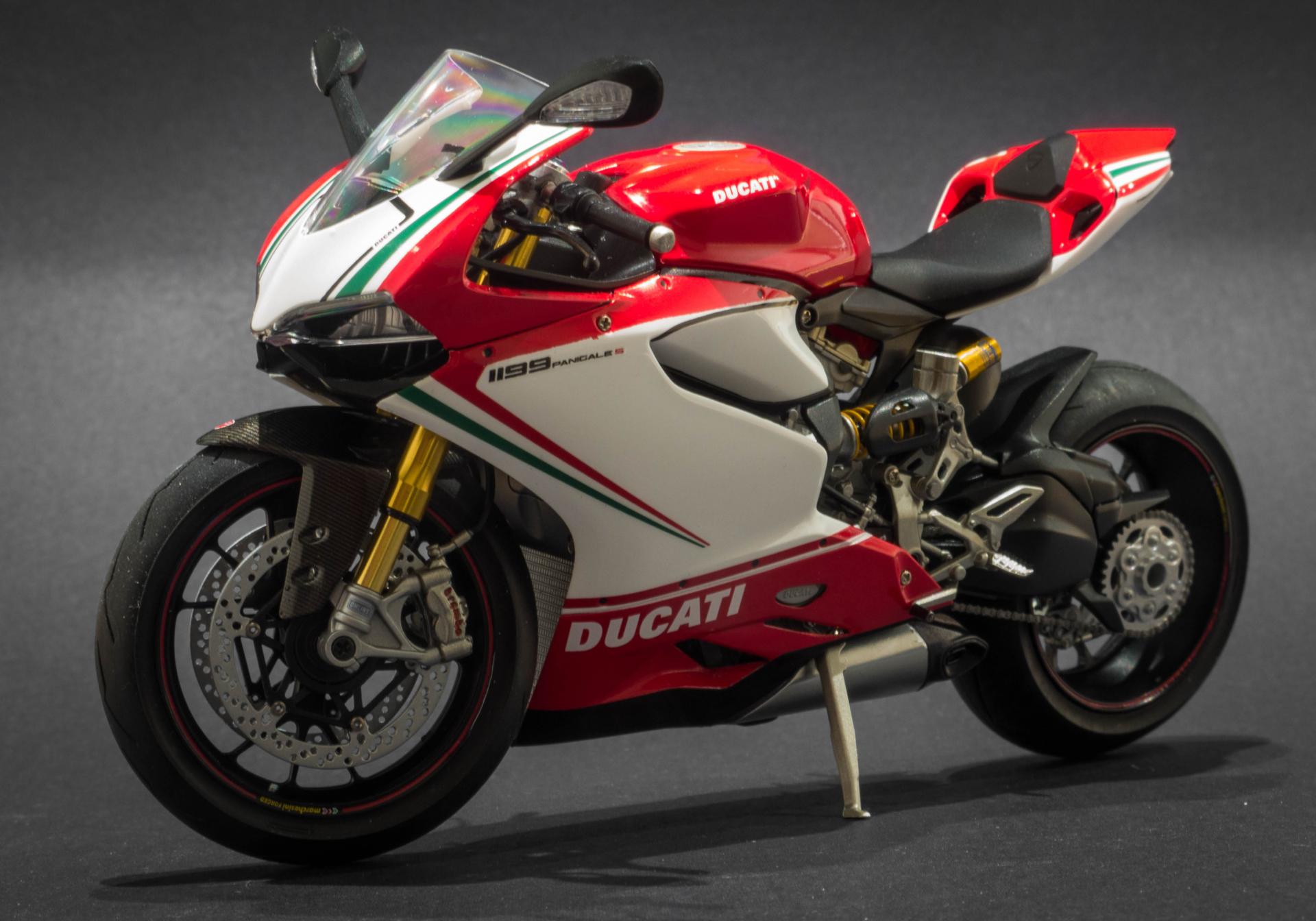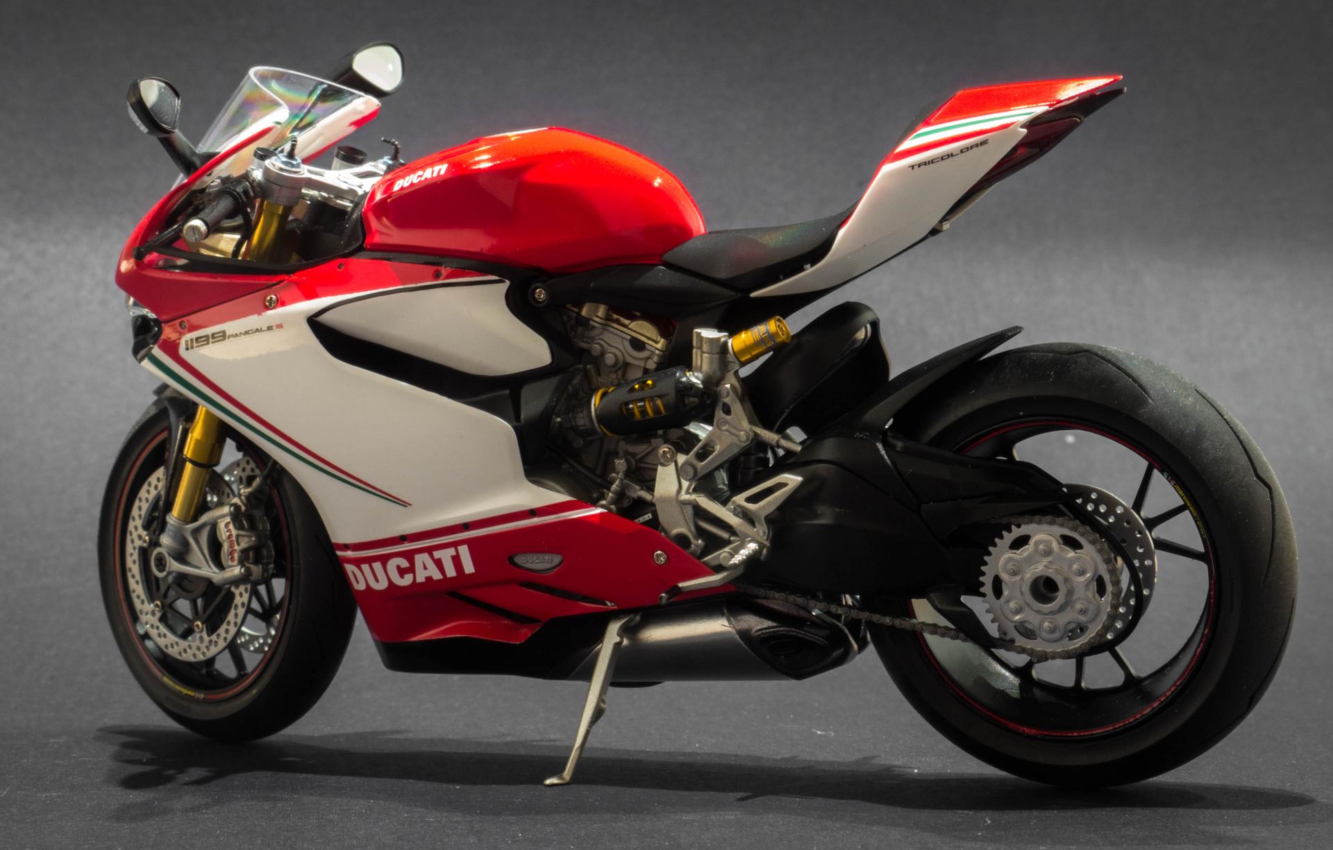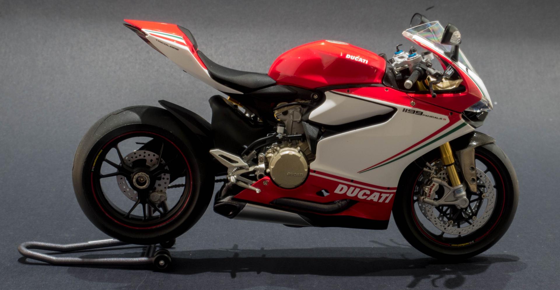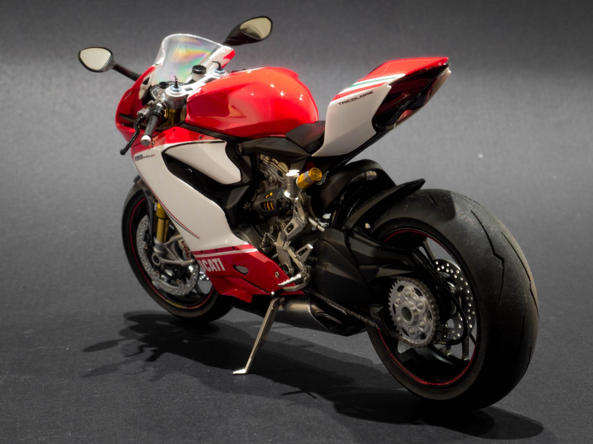 Hi all, Here is my first ever attempt at a motor bike kit. The kit in question is tamiya's Ducati 1199 Tricolore in 1:12 scale. This is my favourite motorbike, I really like the design of it and how everything is packaged so neatly in the body. The kit was very easy to work with, very little modifications had to be made. In addition to the kit, i got the detail up set from tamiya which adds metal suspension forks, rear suspension oil resivoir and disc brake rivets. for the little bit extra cost, I highly recommend getting this, as the added detail is unreal. Anyway, enjoy the photos below. Thanks