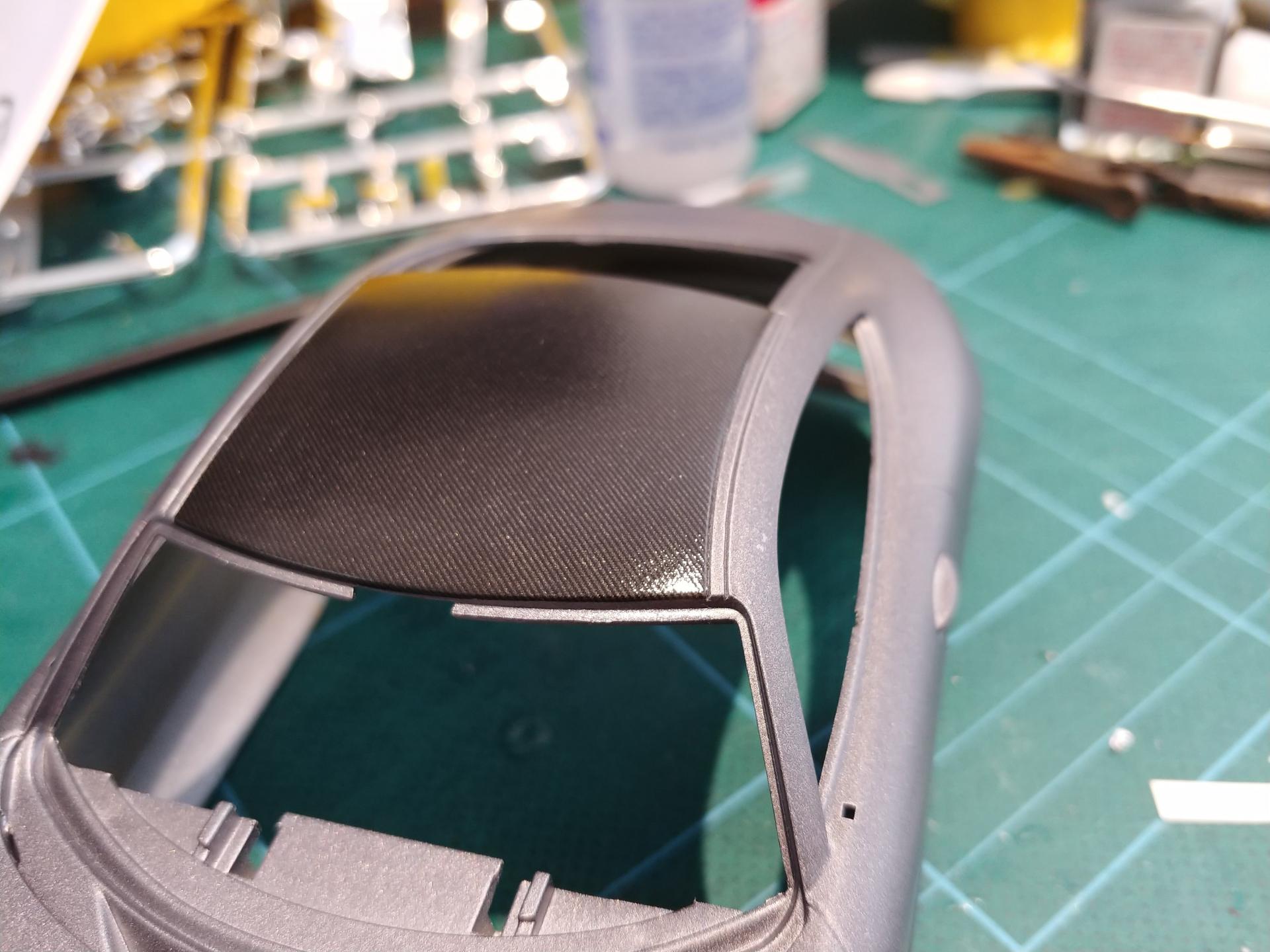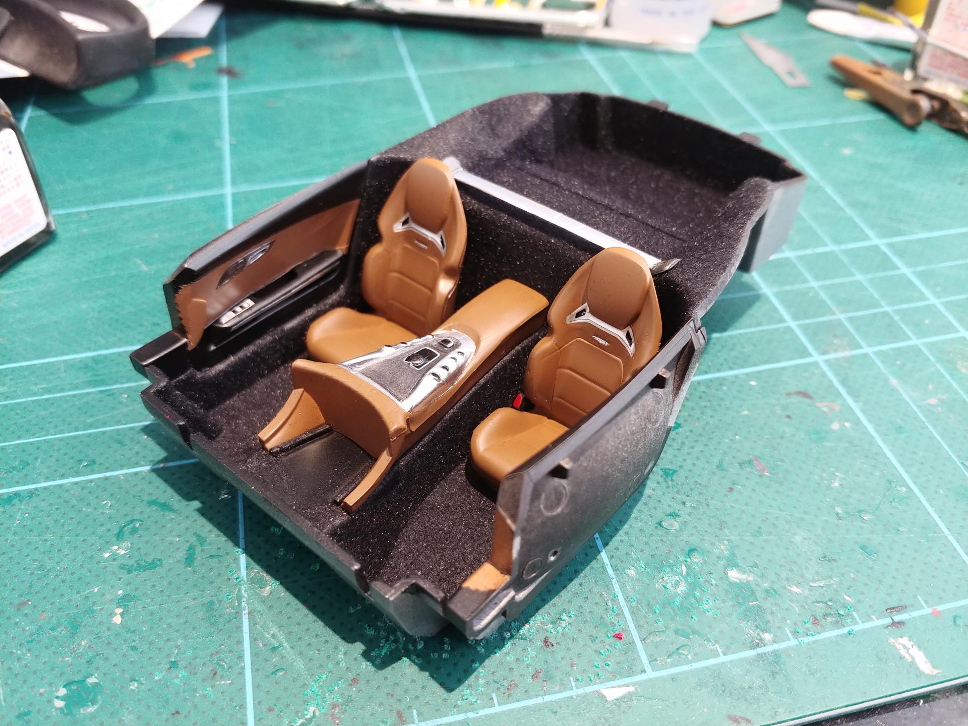 Hi All, I got a lot more done on this kit today. First up I flat clear coated the body. I'm relatively happy with how it came up. It was an experiment doing this type of finish, but probably not something I will do again. I do think it suits this particular car though. (i forgot to take a photo of this step) While the body was drying, I started on the interior. The last few models I have done ,have had black and dark grey materials. I wanted to do something different for this build, so i had a look online to see what colours the car comes in, and I found one with brown & black leather. I really liked the look of this. So I went to the LHS and got some tamiya TS-1 Red brown. I think It came up quite nice Certain parts of the interior are really nicely detailed. I was particularly impressed with the detail of the decals. They give the interior a really good finish. During the assembly of the interior, I masked off the dry body and gloss clear coated the carbon fibre parts of the car (roof and the front & rear bumpers) The contrast of gloss and matte finishes looks really nice, and will look even better once I polish those sections The final part that i did today was the engine cover and part of the engine bay. The engine cover is meant to have a small carbon fibre accent on it, but no decal is provided with he kit, so I made a template and made one using some scale productions carbon fibre decals.