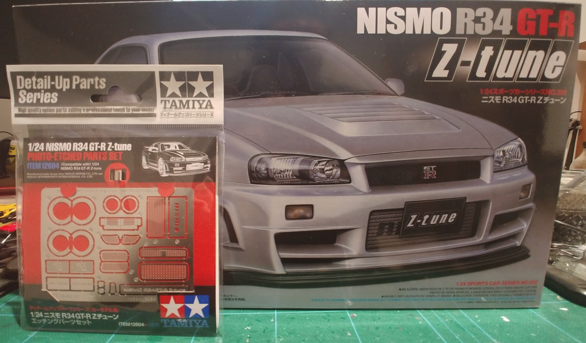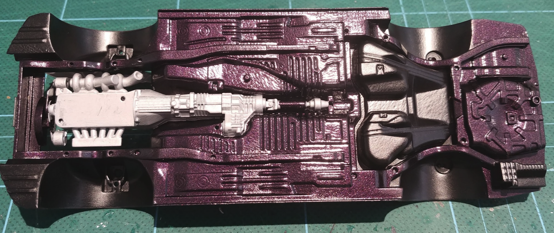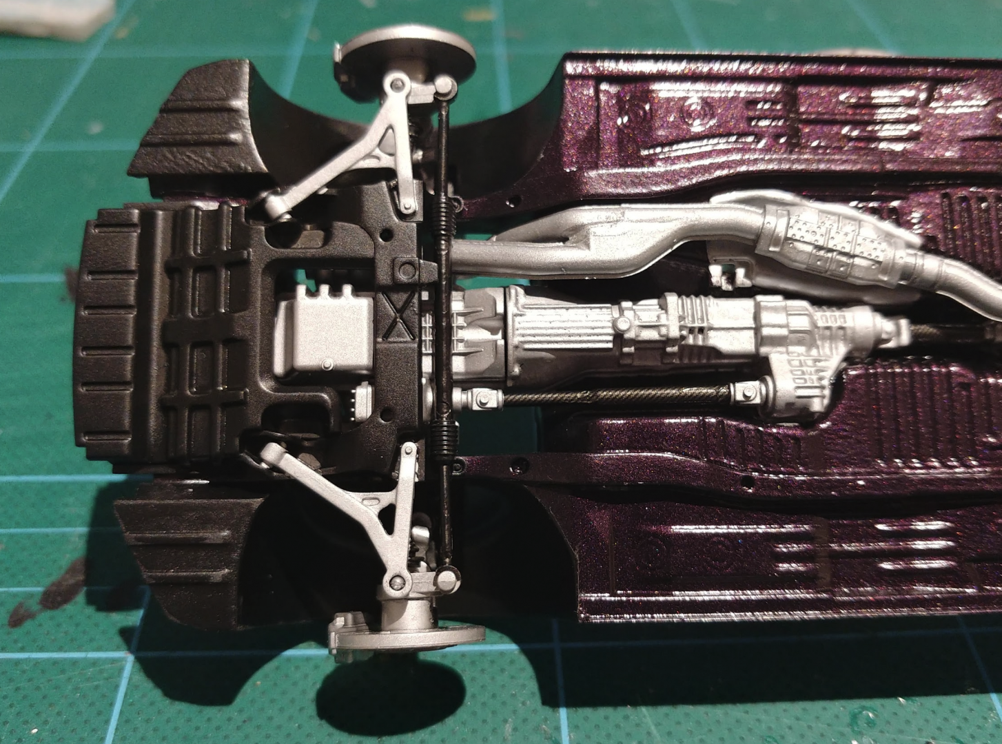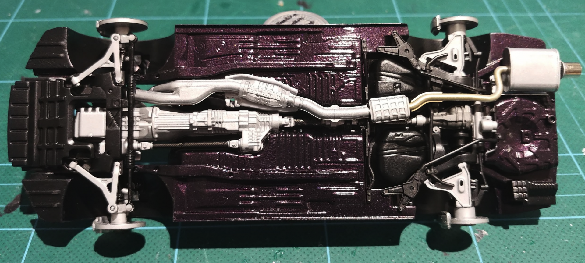 Hi All, I recently started my next project which is the Nissan Skyline R34 GTR Z-tune by Tamiya. Along with the kit, i bougt the tamiya detail up set for a bit more detail and realism. The Z-tune is my favourite version of the R34 skyline, and also the most rare, with only 19 produced worldwide. 18 of the 19 were produced in silver, but one was built in Midnight Purple. This is one of my all time favourite car colours. It apprears black in shadows, and purple in the light. In order to get this colour, I had to go to the autostore, and get them to mix me a can of touch up spray paint to the correct paint paint code (Nissan LP2) I know that zero paints make their own version of this colour, but its not available in Australia (and i dont have an airbrush...) so spray can it had to be. Unfortunately, the spray nozzle didn't allow the paint to lay very flat. There was a fair bit of orange peel in the body & chassis. The body can be fixed with a sanding and then polish, but that will have to wait until it is properly cured. While the body cured, i got working on the chassis. Most of this had to be the same as the body colour. Again, because of the spray nozzle being too blotchy, the finish didn't come out great, but it looks ok. A few areas were masked off and semi gloss black was applied. The orange peel in the purple actually helped with the black, to make it look like a textured black finish that is often found on the underside of a car. The moulded in engine and gearbox were hand painted in flat aluminium paint. Next up was the front and rear suspension sub assemblies. These parts were very accurately detailed and went together perfectly. (like all tamiya kits) From some research i did, i found that some of the paint insrtuctions were a bit off, and i found that the drive shafts are actually made from carbon fibre. so i made those changes, and added some carbon decals. Im really happy with how the brakes came out. the PE disk rotors look really realistic. I added some black paint to the slots, and sanded back the face to look like they had been used. Final Chassis assembly. Thanks for looking, Nathan