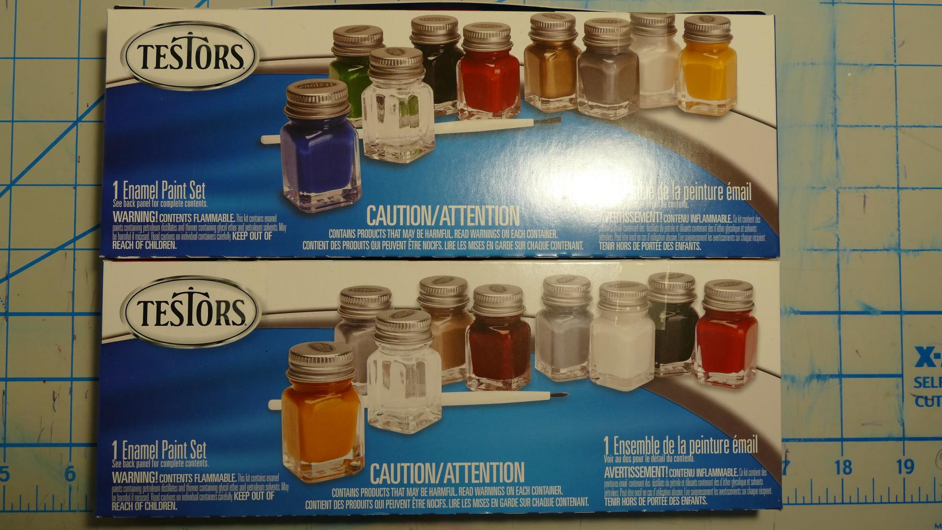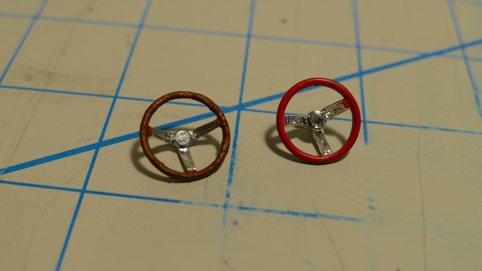 It's fine, it was very informative. My main reason for wanting to use a spray booth is so I don't have paint fumes in my house, I want a way to get them outside, like through a window or something. I know which booth I want to get, I just need to set up an area in my house near a window. Here is some progress. The steering wheel on the left is the stock steering wheel, which I painted with acrylic brush paint. I never liked the texture of acrylic paint, so I got some enamel brush paint. The steering wheel on the right is from a long-lost Maisto die-cast car. I plan to use it instead because I like the look of it better. I will use my new enamel paint to paint the rim of it either black or brown. Here are my new paint sets: