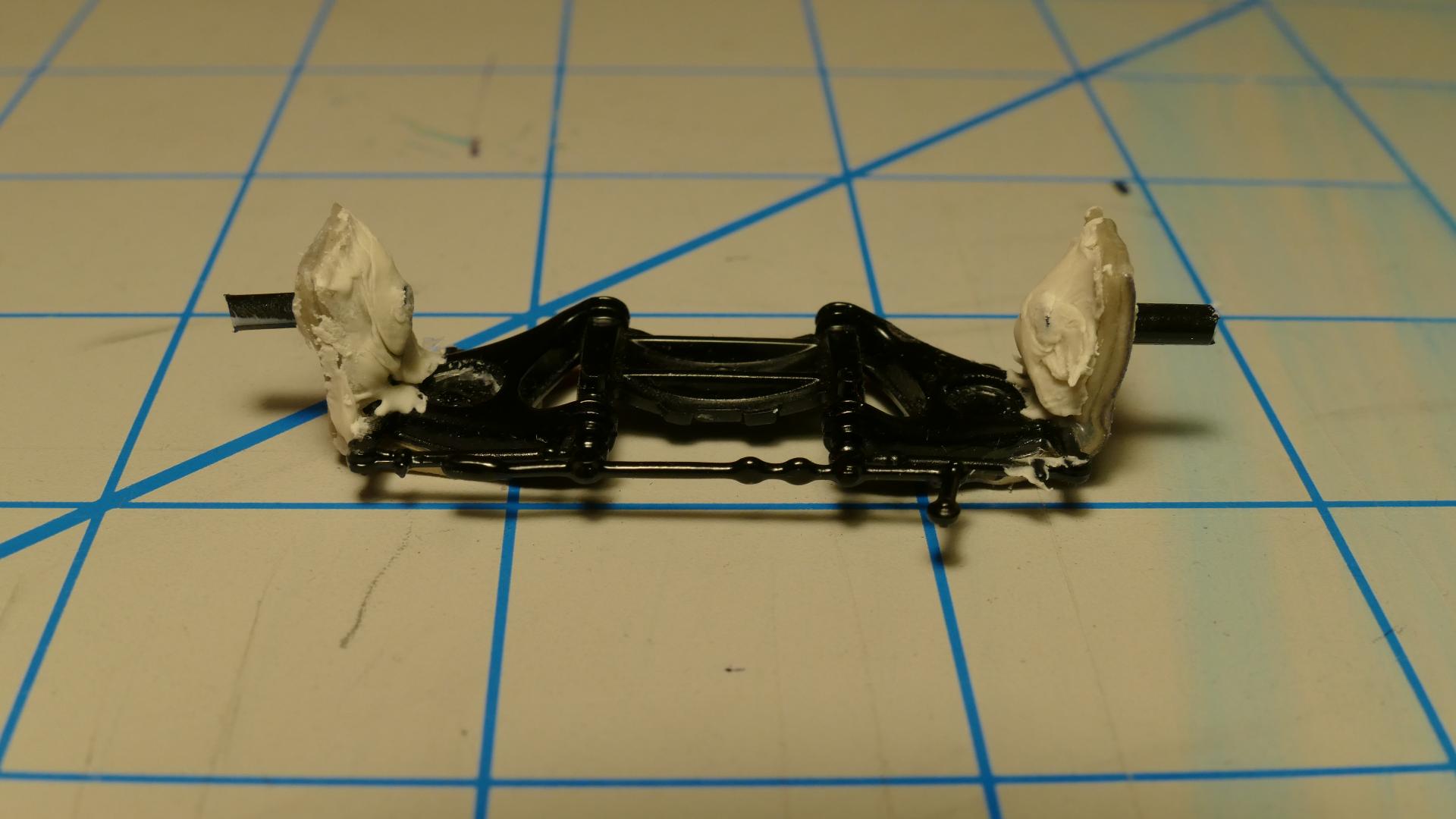 It's snowing outside, so I can't spray paint anything. However, what I can do is work on the "mechanics" of the Corvette. Here's an update on the spindles... Rather than use my only drill (which is big, heavy, and probably too powerful), I decided to use a body reamer to make holes for the axles. For those who don't know, a body reamer is a tool that has a cone-shaped blade; when you twist it onto a surface it creates a hole. Usually, this tool is used to create body mount holes for radio-controlled cars. But not today! After the holes were snug enough for the axles, I covered the inside ends with Testors putty. Over time the putty will harden, and I'll have a solid fix for broken spindles. Here's a mock-up of the tires sitting on the axles. After I've painted the spindles black, I'll probably put some putty on the axles since the wheels fit very loosely. That's all for now. Stay tuned!