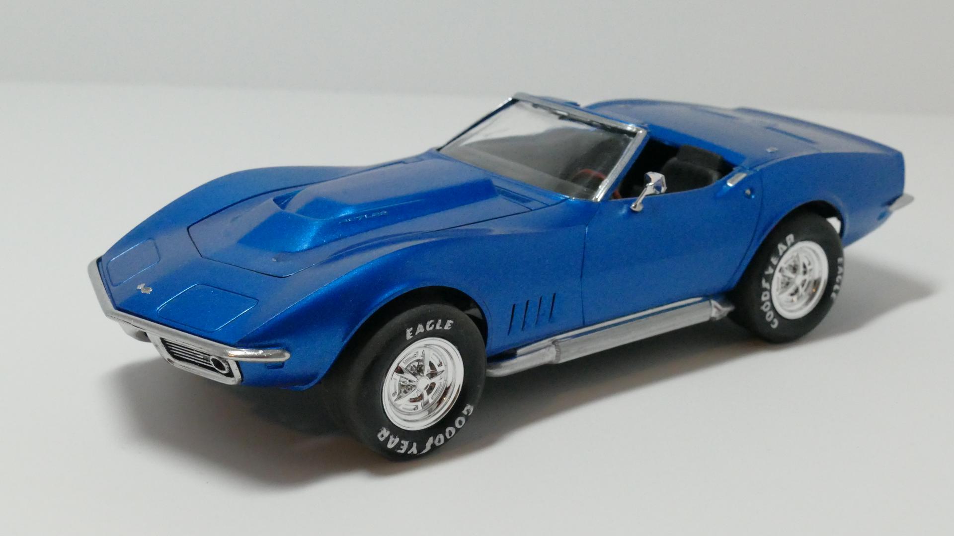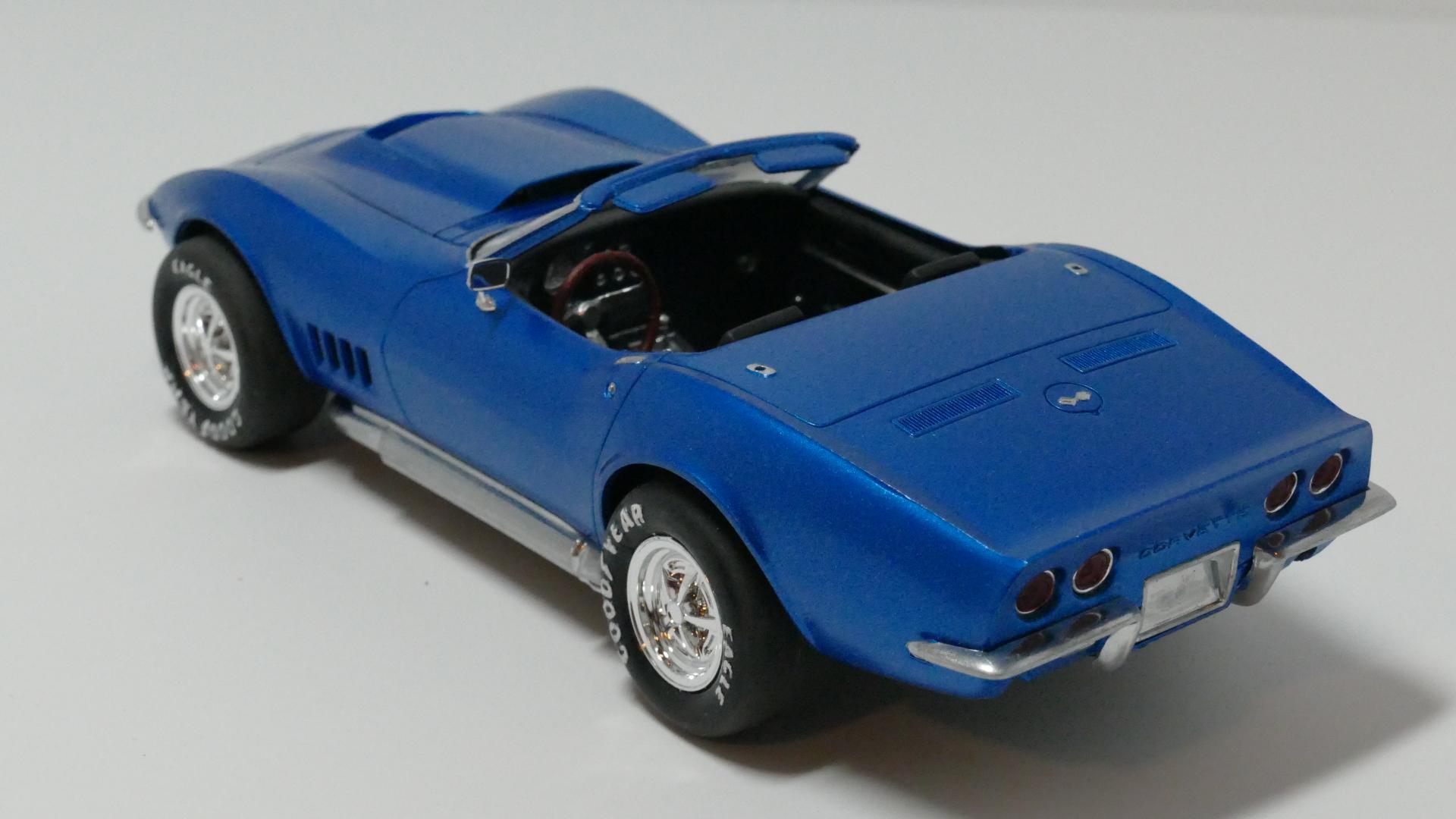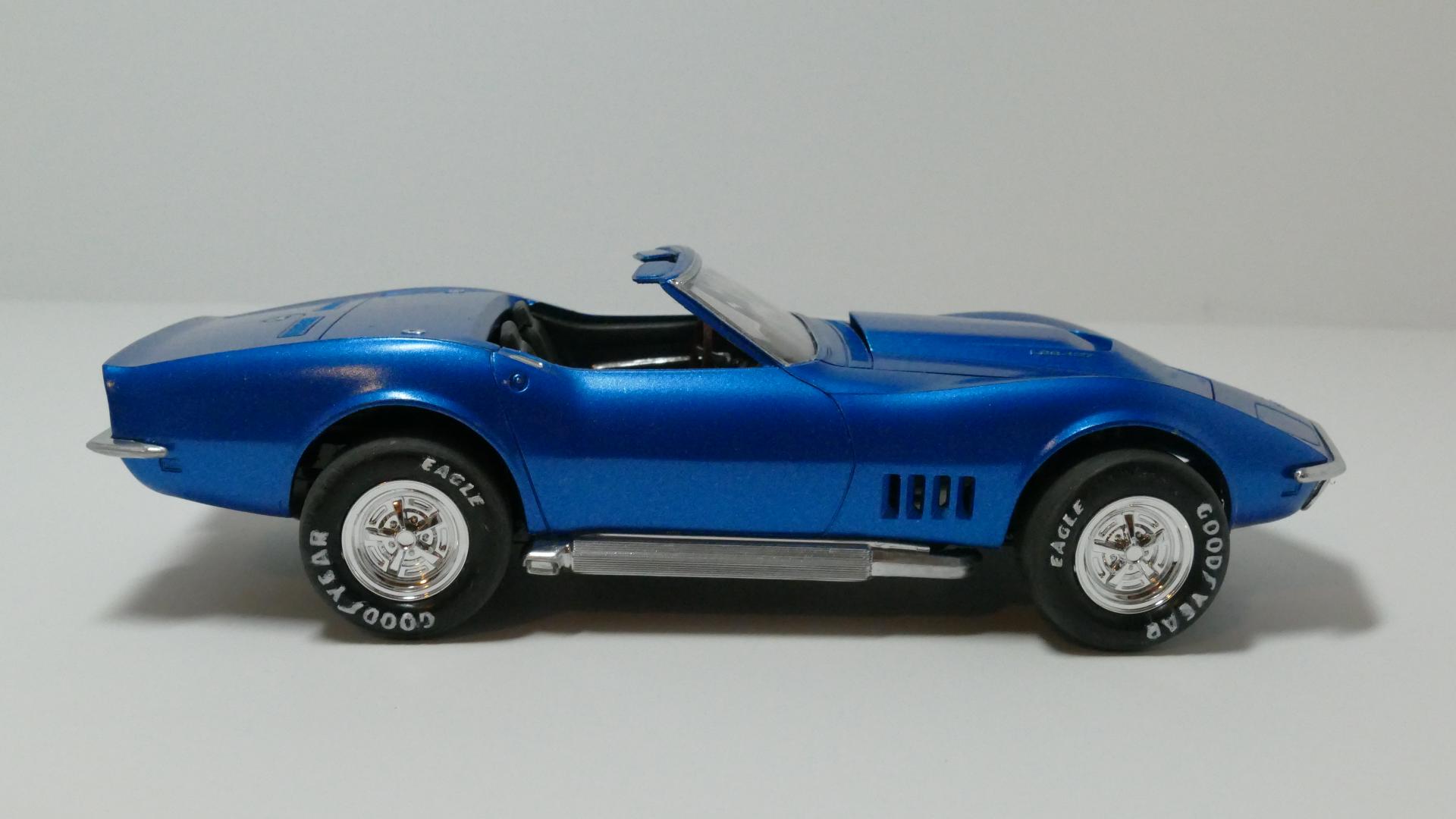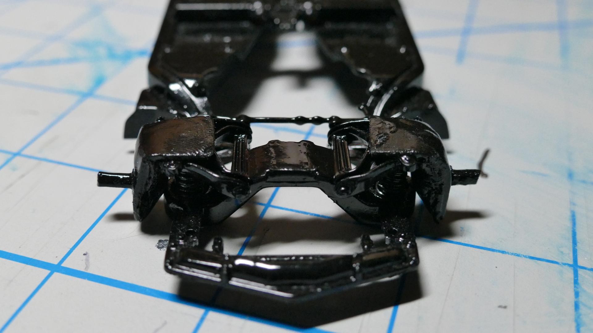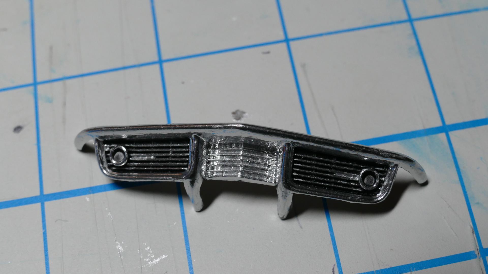 Okay, finally. Where I live, it's spring at last - which means decent weather for spray painting my model car parts! So yesterday I spray painted the last actual "part" of this build that needed it; the main body piece. I will post pictures of the body's overall outcome, after the rear bumpers are firmly glued on... I spray painted the front bumper/grille piece matte black previously. Now I have given it chrome using my Molotow chrome pens. The short lines of chrome coming from the circular lights (turn signals?) located in the "valleys" of the grille, was an accident on one side; so I decided to make it even on the other side. Overall I'm pleased with how this part came out. Next, I added the chrome trim to the roof piece, again using the Molotow pens. However I probably won't have the roof on very often. Because Corvette. Lastly (for this update), I put both the front and rear axle assemblies onto the chassis. If you've been following this thread, you probably know that the rear axle assembly is completely my design, because the original one broke. The front assembly also broke but I kept most of it and fabricated the axle portions myself. That's all for now. As a side note: I don't plan on entering this build into any shows or contests, it will be a shelf model. If it were a real car, I would use it as a daily driver.