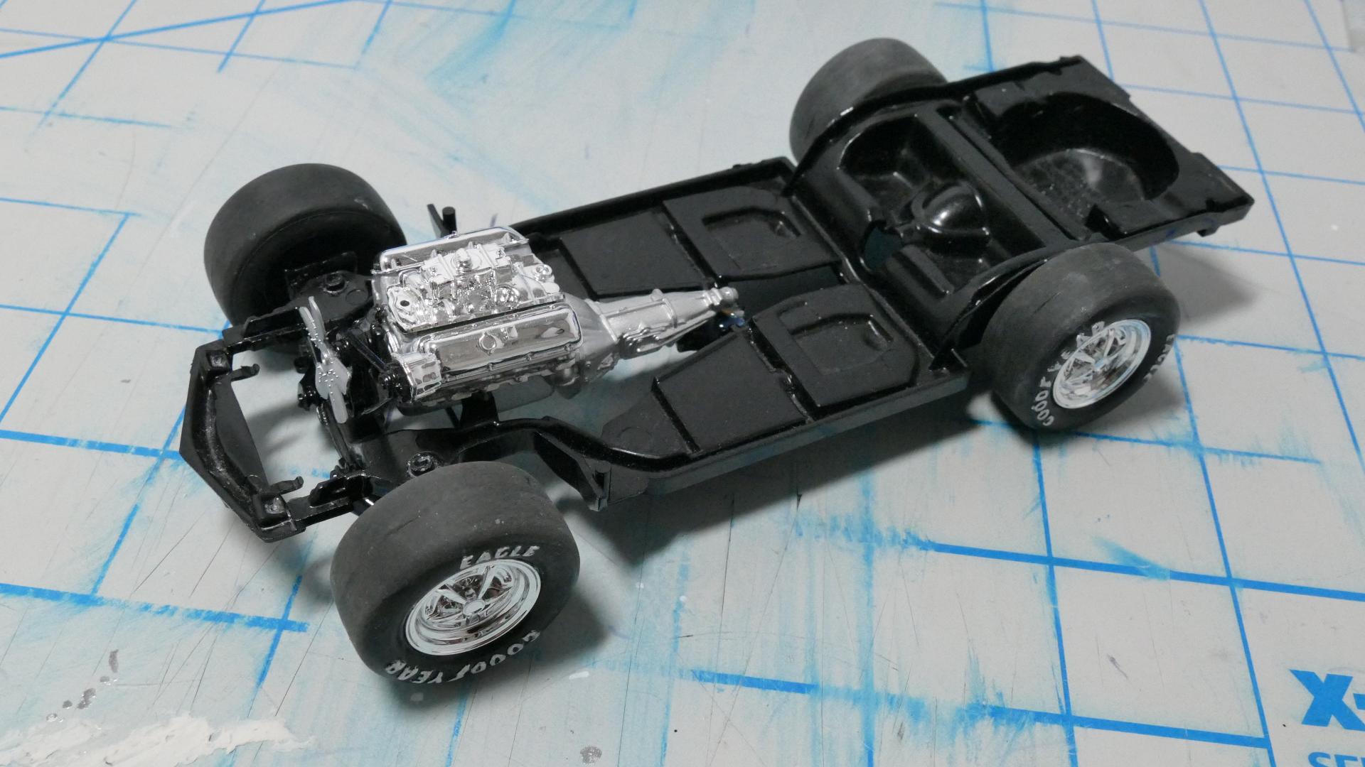 Here is a little more progress. I am nearing completion. I decided to use the stock taillight pieces. The '58 T-Bird ones just wouldn't fit. I also decided to use the stock steering wheel and save the nicer looking ones I have for another build. Lastly for this update, the chassis is as complete as it's going to get. I don't want to add any more detail. Like I said before, this will just be a shelf model; nothing fancy. Only a few more things to do for this build. I'm hoping that the next kit I build will turn out better and more detailed.