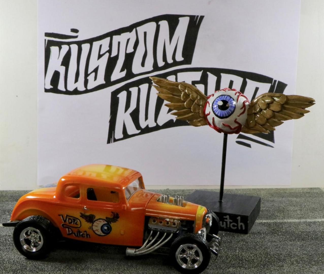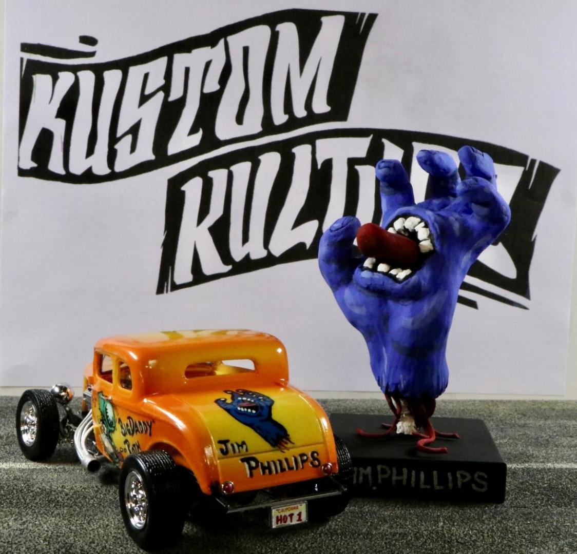 I built a Revell 1932 Ford 5 window coupe that has been chopped and channeled. All the graphics are hand painted in honour of my Favourite Kustom Culture icons: Big Daddy Ed Roth for his custom car and weirdo tee shirt designs, Von Dutch pin striping and custom painting, and Jim Phillips for his Surf and skate board art and Doctor Cranky and Eyegore for getting me back into model building ! The figures are made of polymer clay by me of their most famous art that they designed. I hope this will inspire you to build something for those who inspired you.