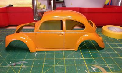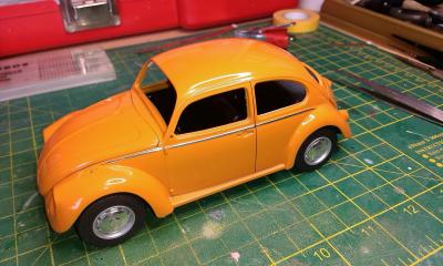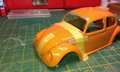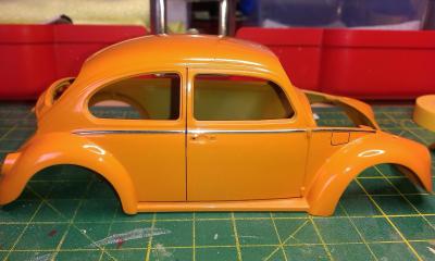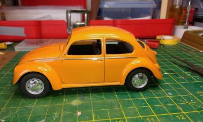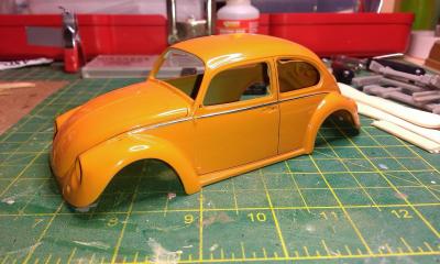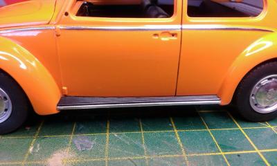 Well the commission build was finished back in June, one magazine article finished, still got another one to do, so after a break of around 4 months I thought it was about time I dug out the beetle kit, anyway the interior s finished, now I'm working on the body, so hopefully the body and chassis will be as one very soon, Revell do give some decals for the side chrome trim, but they look like silver decals which isn't good enough for me, so they were done using bmf.