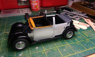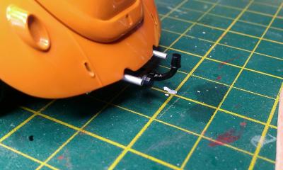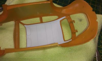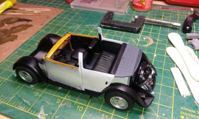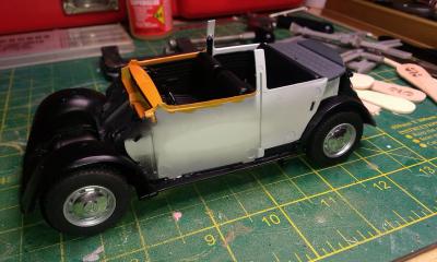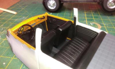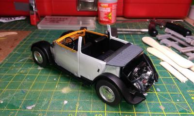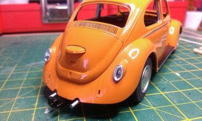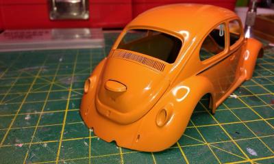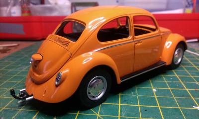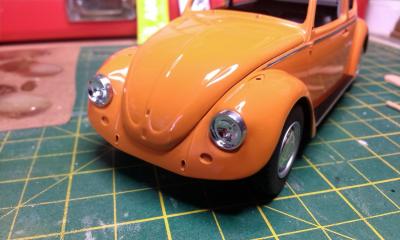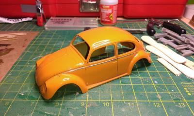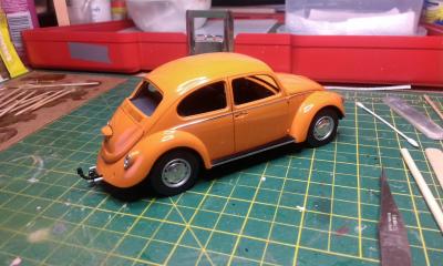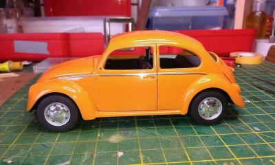 Starting to look like a Beetle now, although the parts fit has been 1st class up to now, when I come to put the interior pod and chassis together, they didn't want to go together, after a bit of grinding and sanding they finally went together, the main cuprit was the hump in the floorpan where the gearbox goes,