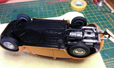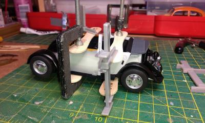 Got a little more done earlier, interior mirror painted and fitted, and then the body simply popped onto the chassis, it's held in place using slow setting epoxy on the inside of the running boards,