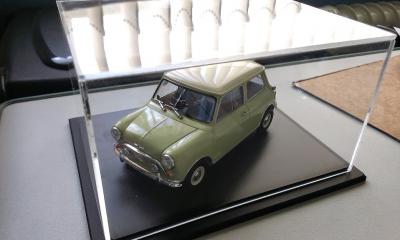 This one was commissioned 9 weeks ago, I got it finished 3 weeks under the time I had originally quoted, as the customer asked if it was possible to get it finished for June 15th, which over here is fathers day, it was painted in the original BMC colours of Fiesta yellow with an Old English White roof, the interior was done in the original colours of powder blue and light grey, the wheels were drilled out, just like the original Cooper wheels, and a couple of front spot lights were added to the grille, which the real car I was modelling had.