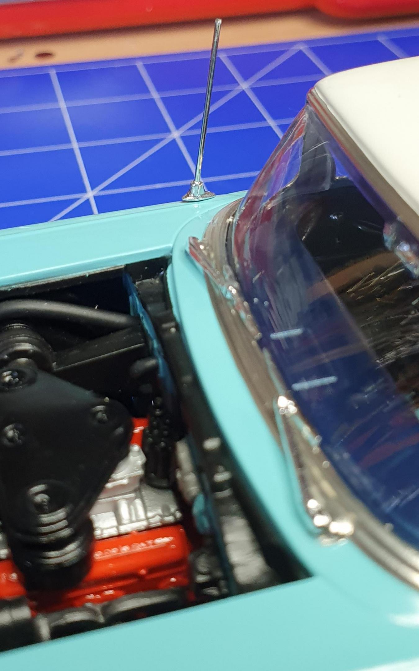 Radio aerial fitted, I didn't like the plastic mast as it looked a little over scaled, so I cut it off, drilled the base and inserted a cut down dressmaking pin, the base was then re-chromed using Molotow liquid chrome. Only thing left to do now is airbrush the front and rear scripts on the bonnet and bootlid in gold, and a few decals in the engine bay then it will be posted in the "Under glass" section.