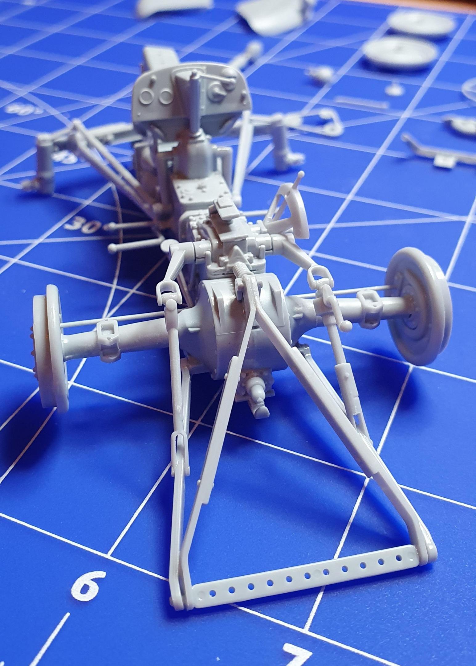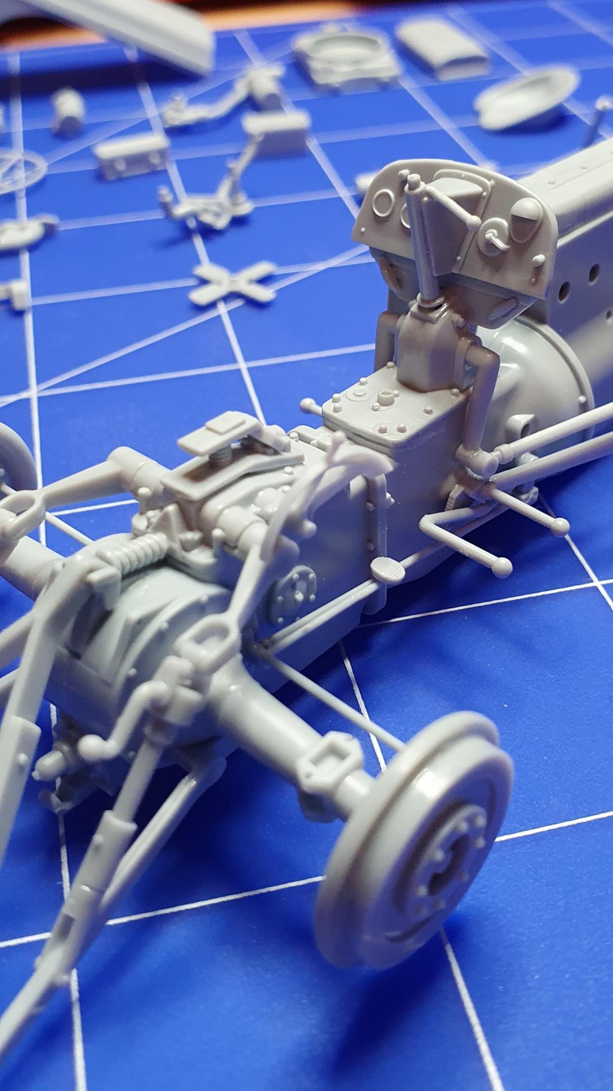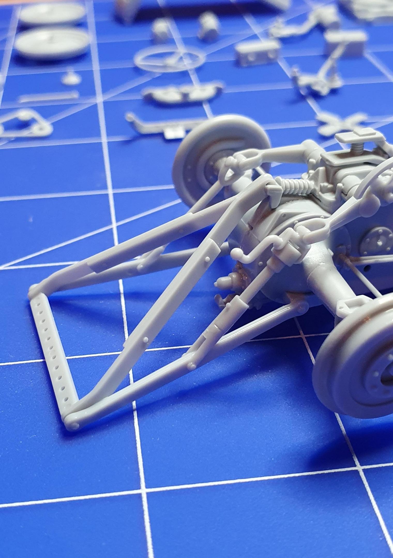 Brake rods and pedals fitted, these are items i deviated slightly from the instructions, they tell you to build them all together and then fit them to the model, I dry fit the foot pedal then add the rod, first gluing it first to the base of the pedal and then to the rear axle casing, and then a few drops of liquid cement to the pedal and pushing it flush with the chassis using a pair of tweezers, I also fit them after fitting the front axle support rods, and not before, doing it this way helps holding the pedal assembly in place as it gets trapped between the chassis and support rods. -
