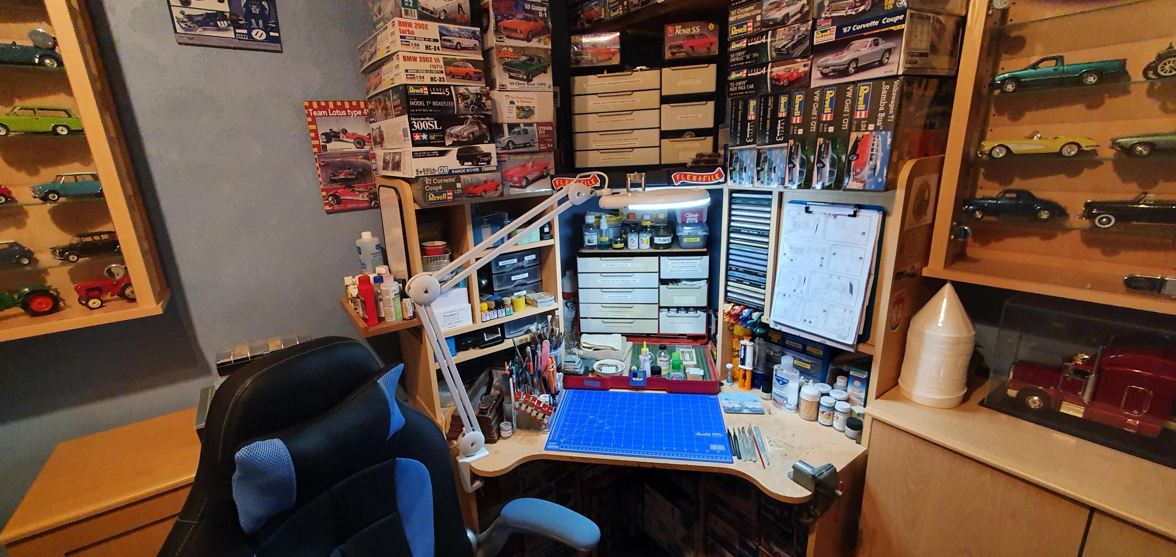 I only have a small building bench, but I can't stand or work in clutter, as I'm working on getting my new spray booth up and running, I'm unable to get any airbrushing done, so tonight I had a tidy up, bench is nice and clean now. -