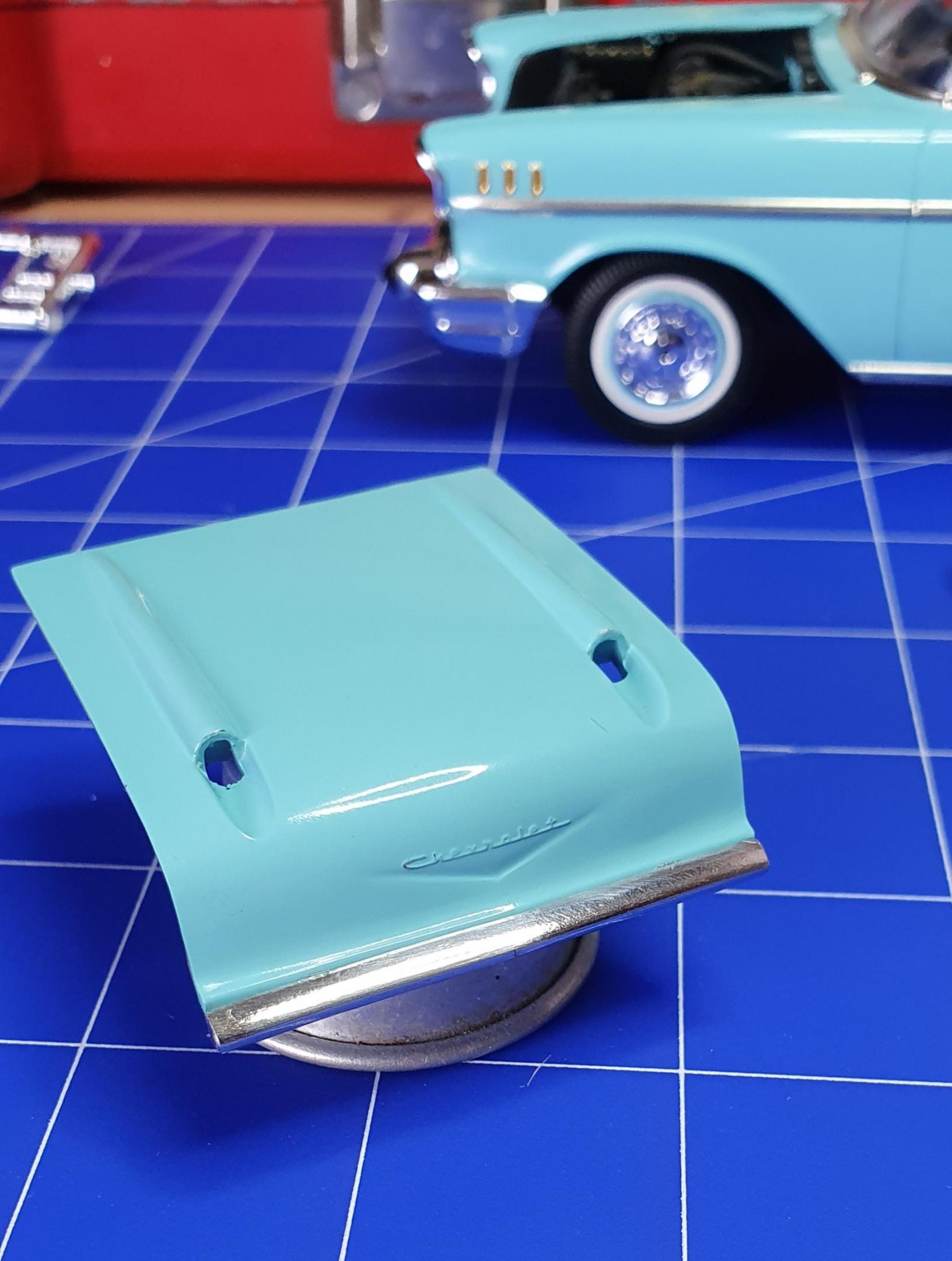 I had to drill out the mounting holes on the trim, nothing too major, the worst thing is that AMT put the cut off points on the parts tree on the top of the part, so the part was sanded smooth and covered in Bare Metal foil and then polished, and then fitted to the bonnet using 5 minute clear epoxy.