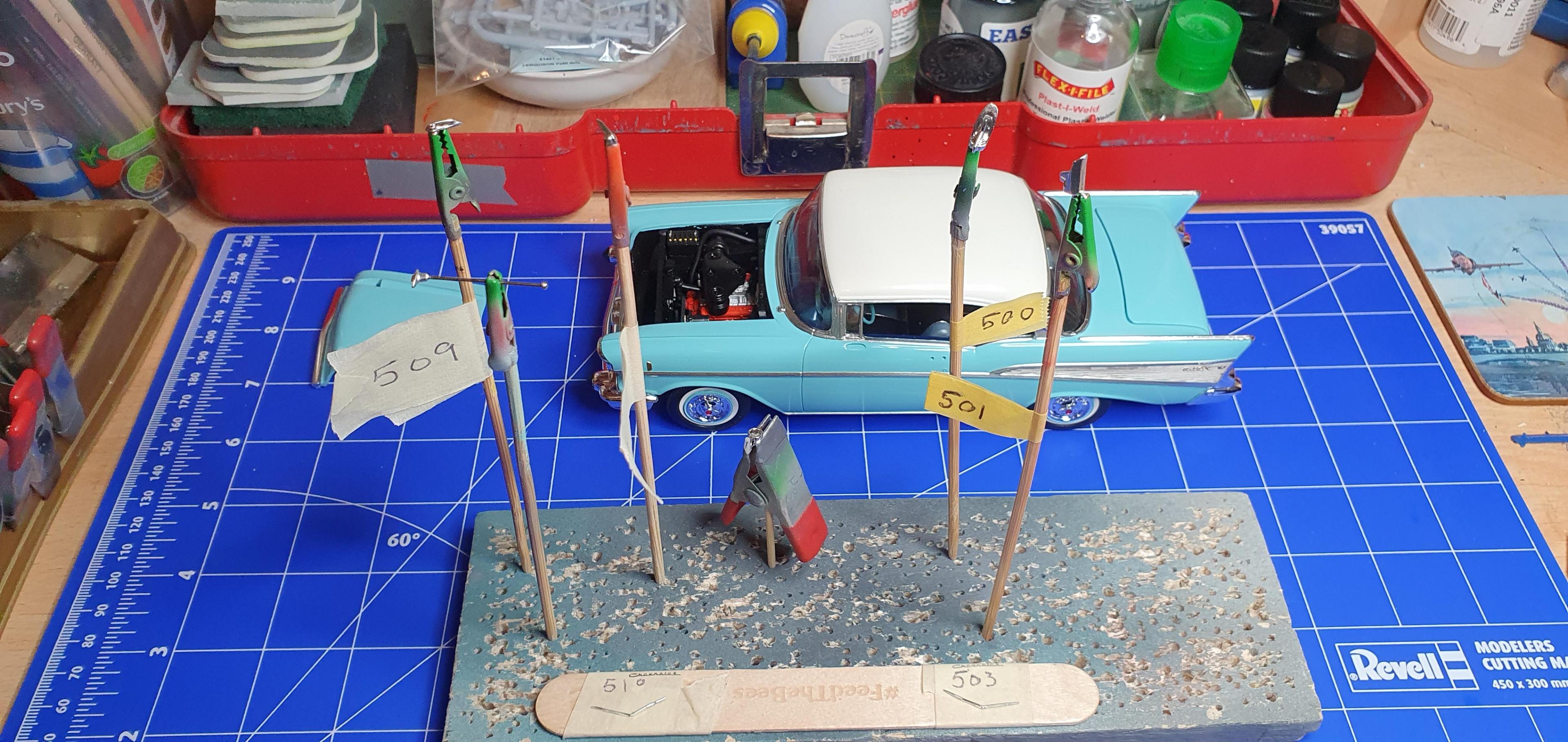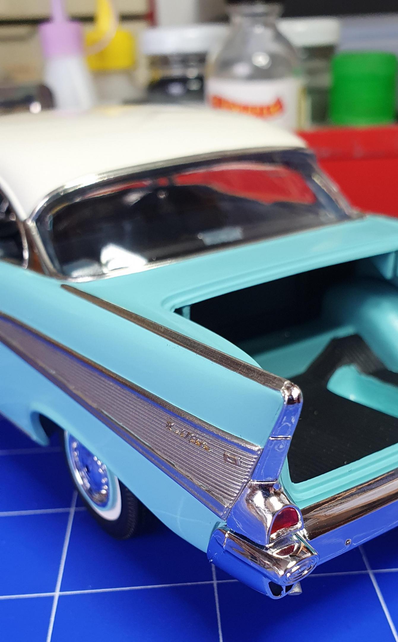 Business got in the way of modelling today, although I did get chance to fit the wheel centres, and prepared the rest of the small chrome parts and touched up the cut off points with Molotow liquid chrome, the Chevrolet V's and Chevrolet scripts need airbrushing in gold, I'll be using Mr Color gold paint, the radio aerial didn't look good, so I cut the mast off, drilled the base and inserted a cut down dressmaking pin.