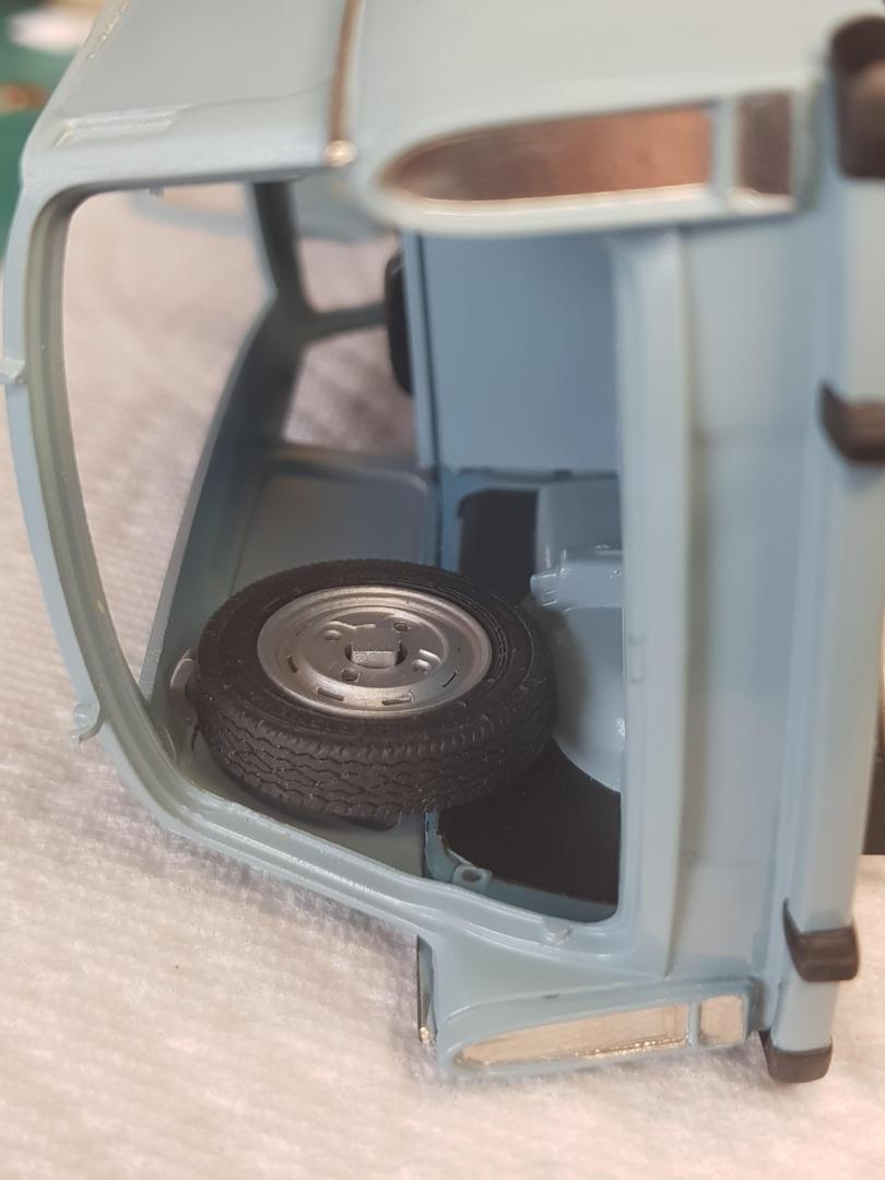 The wheel didn't have enough room between the wheel arch and roof to get it in like that, the wheel arch in the kit is totally different to this photo, probably because I was using the Universal, if I was to do it all over again I would scratch build some different wheel arches, I came up with something very close.