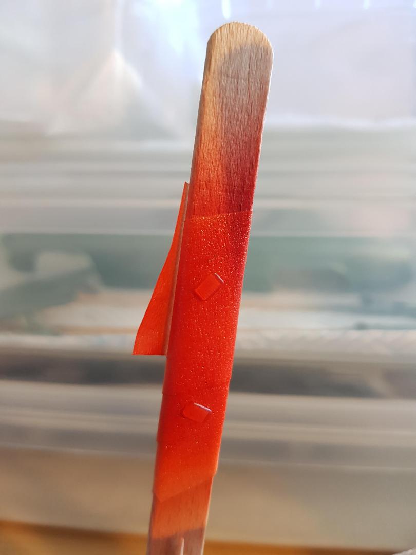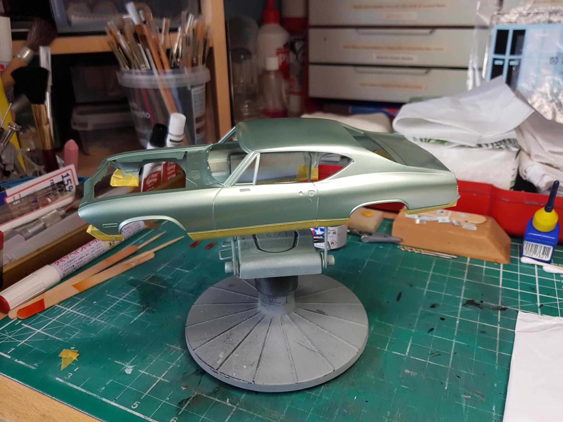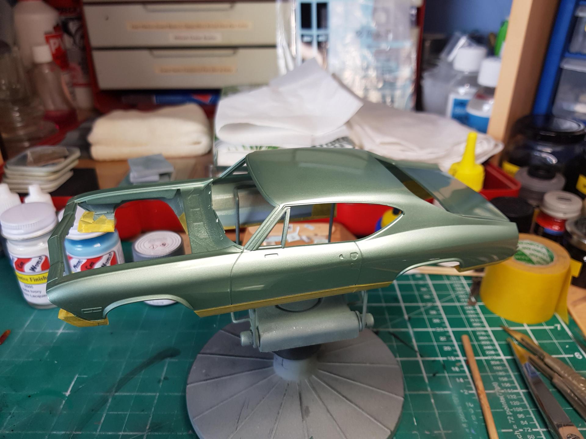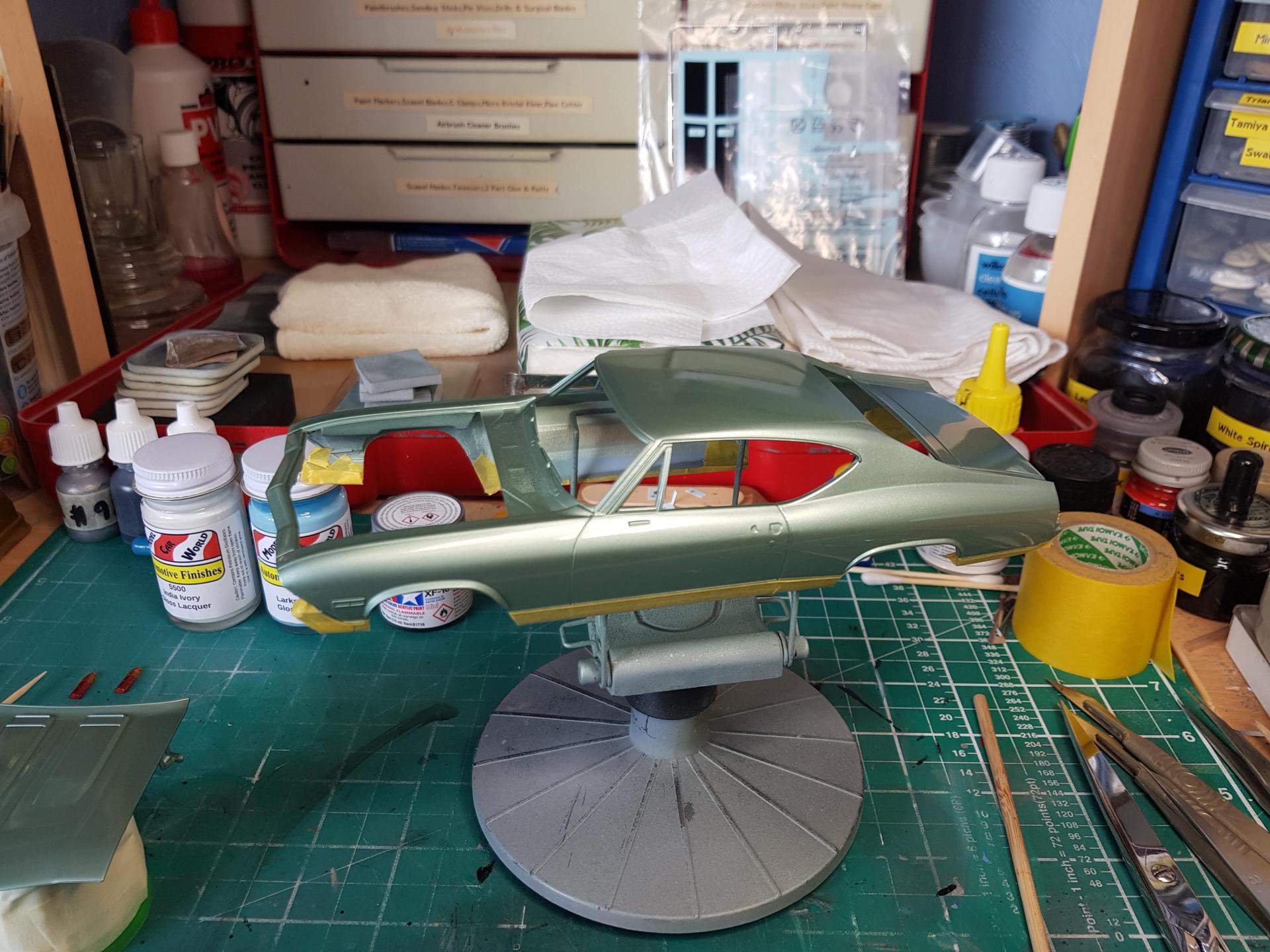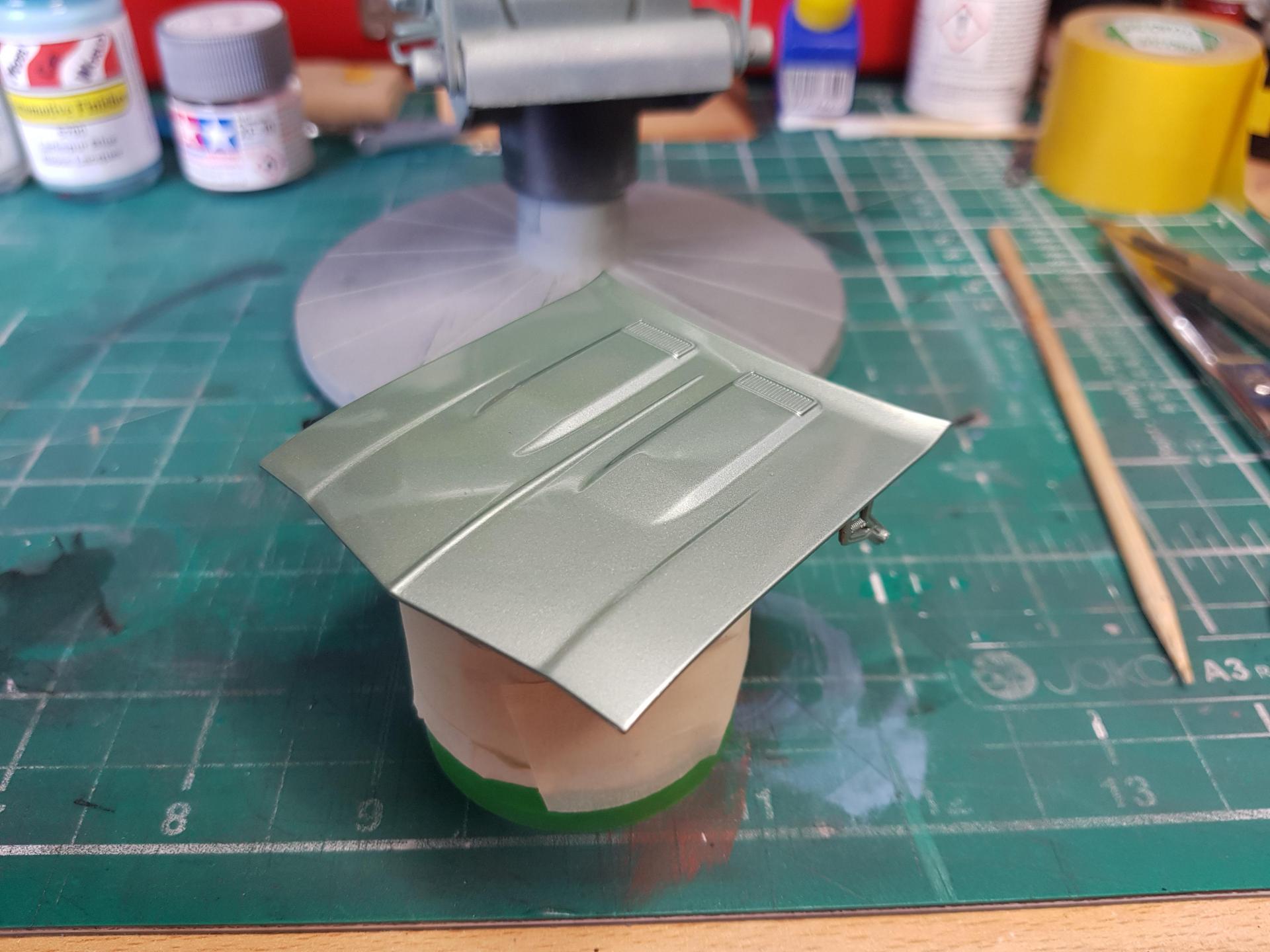 I was going to polish the paint on this one, but I've just got way too much work on at the moment, so I took the easy way out and clear clearcoated it, one small dust nib to remove from the bonnet, and a good polish will be all it needs, then I need to airbrush the bottom part in black, I masked it off so the clear didn't make the paint too thick.