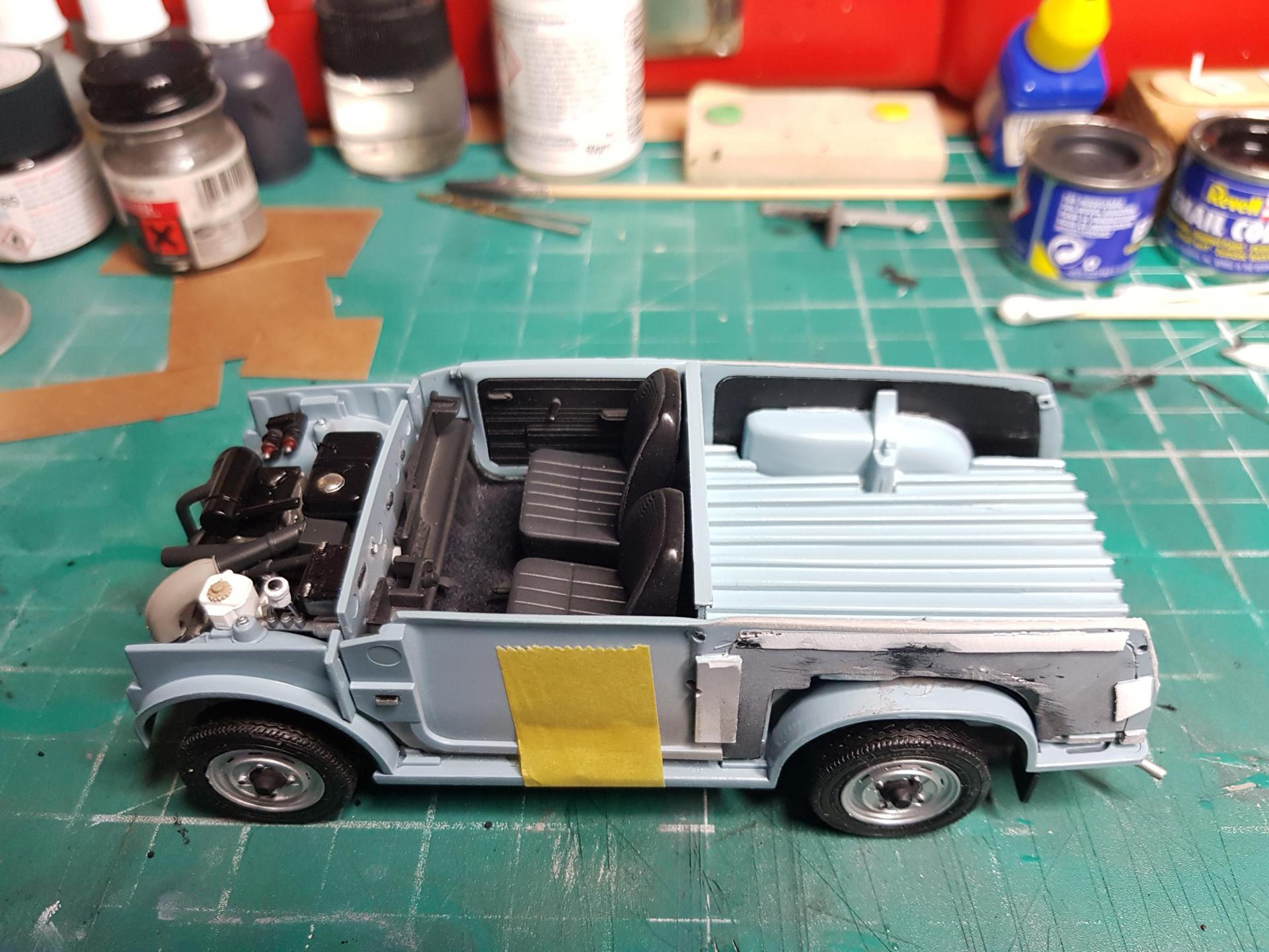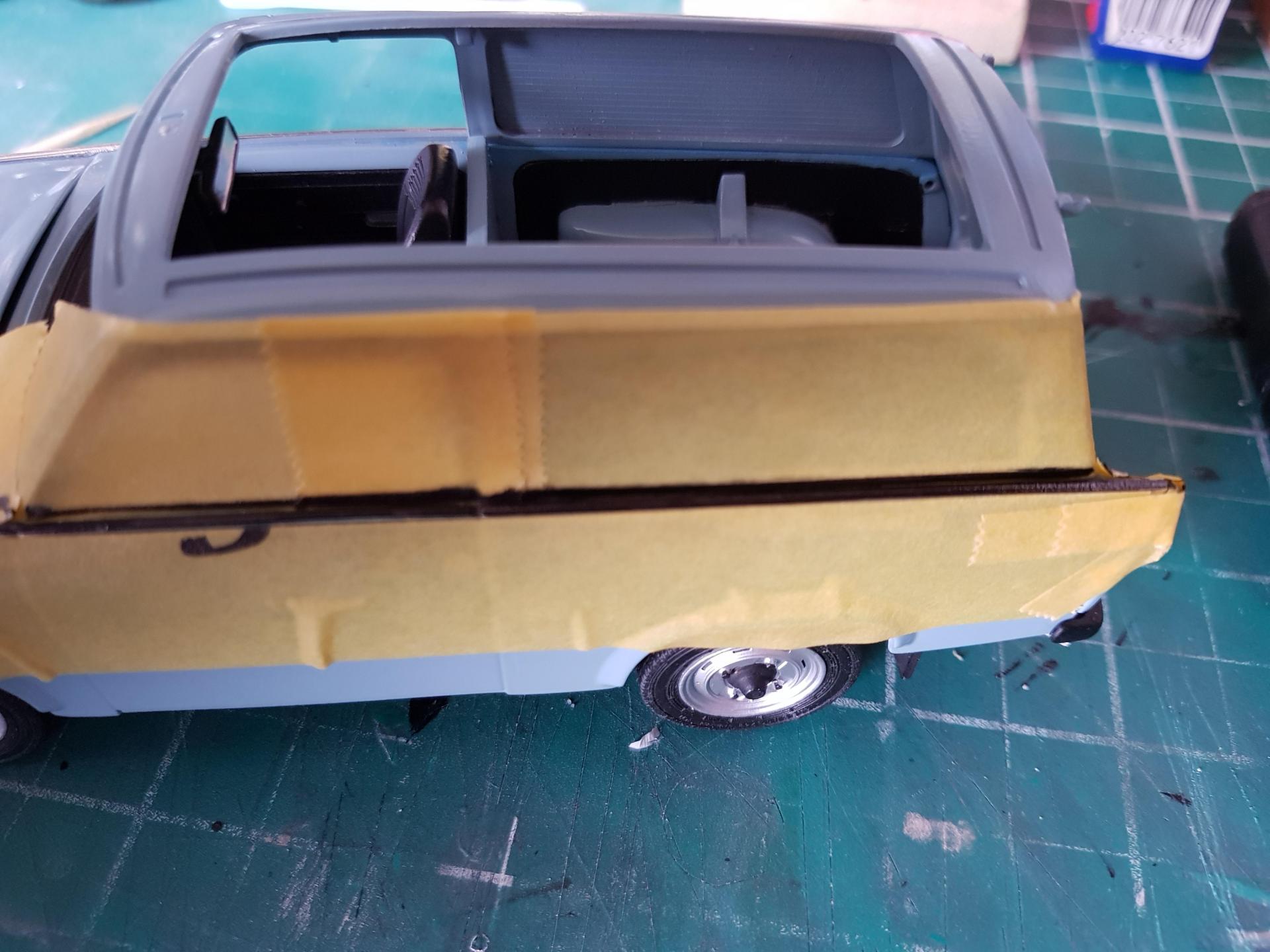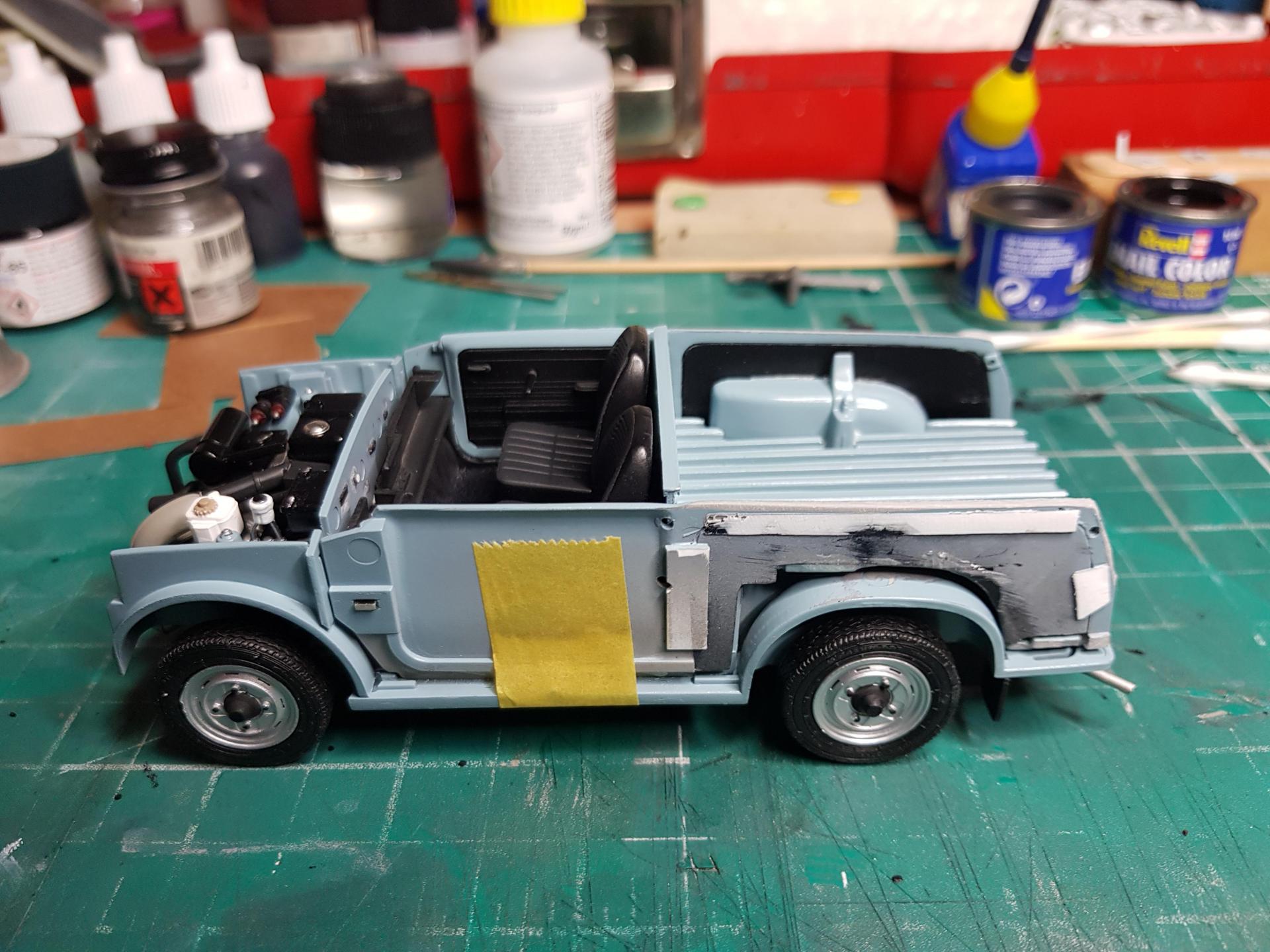 Nearing the finish line, because of the difference between the kit wheel arches and the few photos I've got of the 1:1, it wasn't possible to fit the spare wheel on top of wheel arch, so it will go as close to it as I can get, a spare wheel mount was scratch built from a square of styrene sheet and a few modified parts from the spares box.