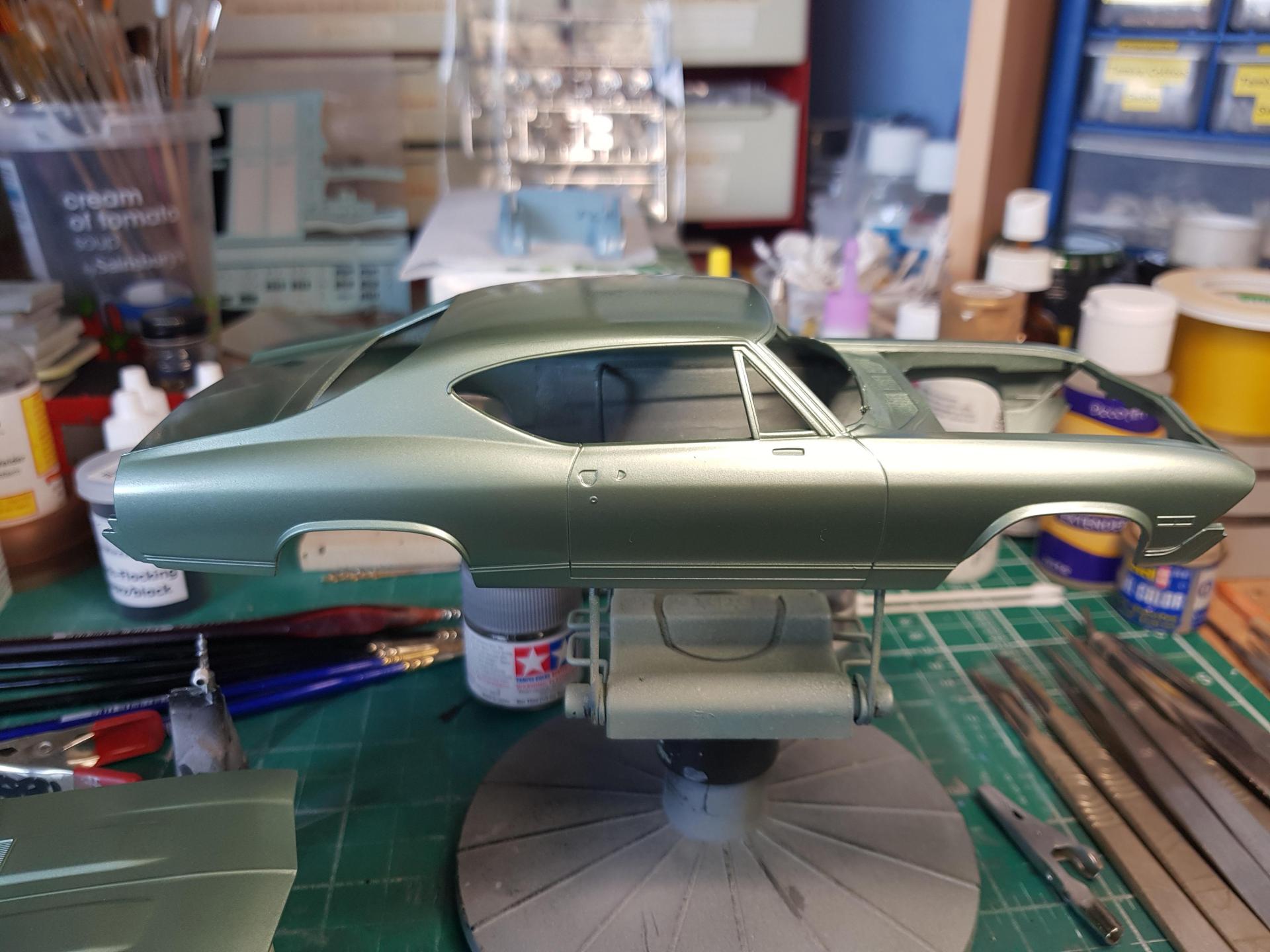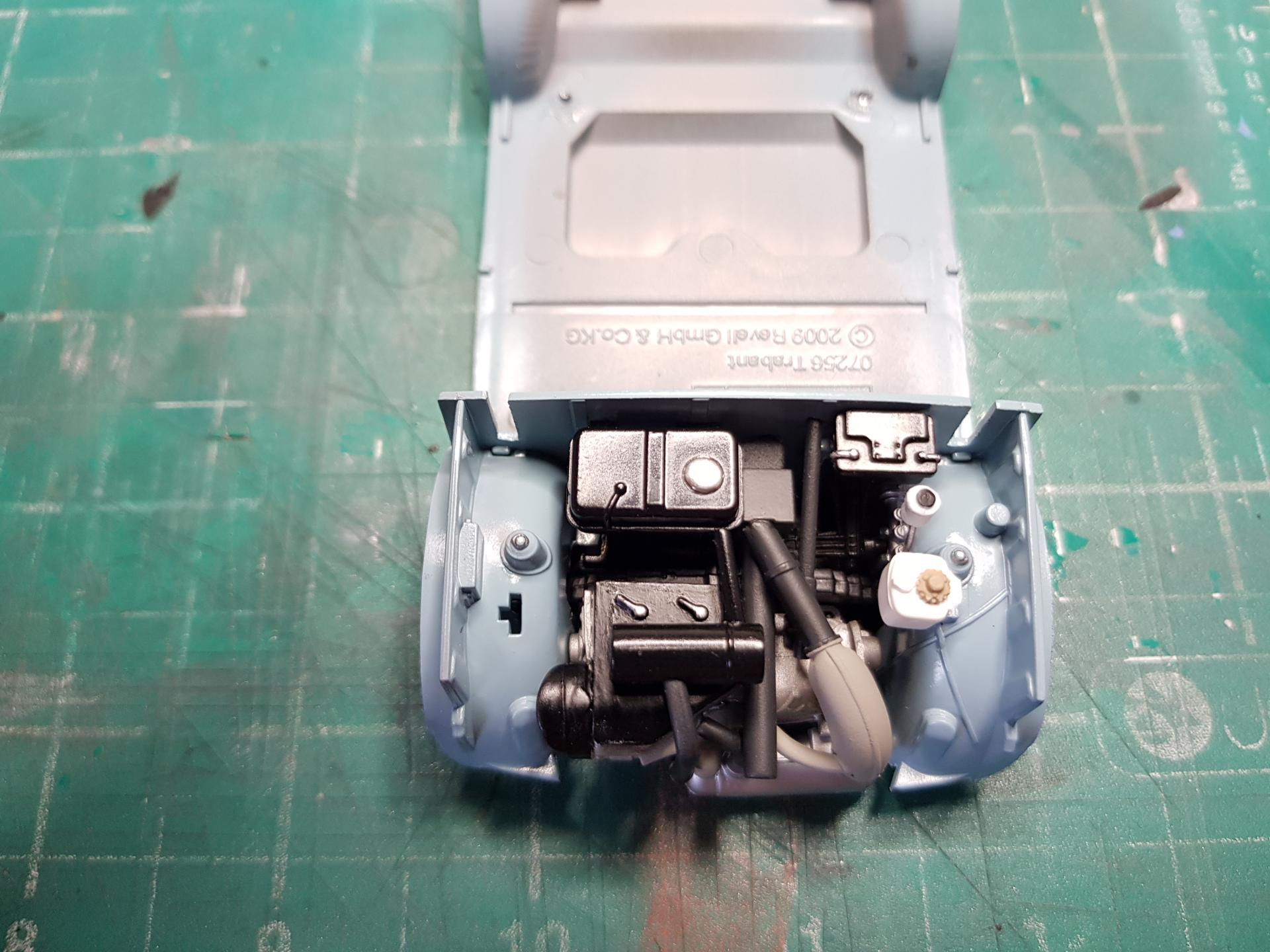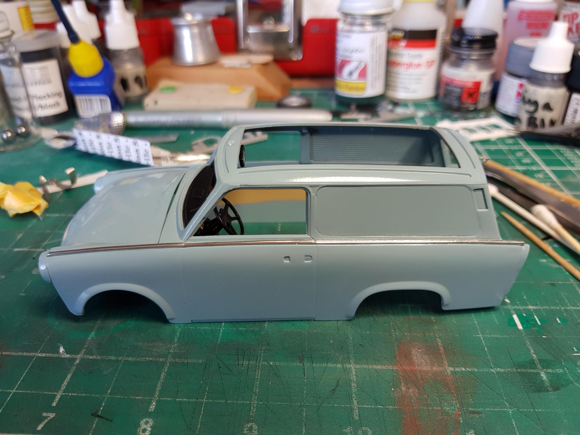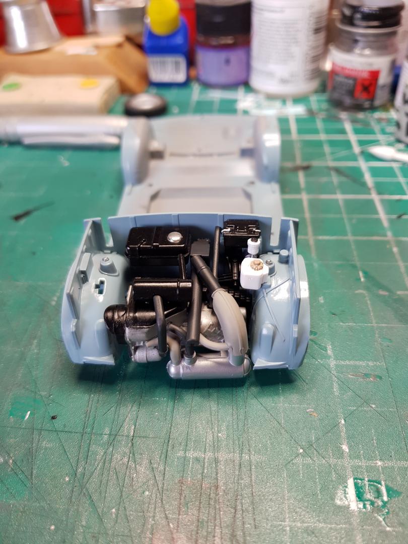 As I'm waiting for the paint on the Chevelle to harden so I can wet sand a few dust nibs out of it, I've made a little more progress on the Trabant, engine was airbrushed in Testors steel, other parts were airbrushed in various shades of grey,rear suspension was airbrushed in satin black with the fixing points picked out in Tamiya Titanium silver