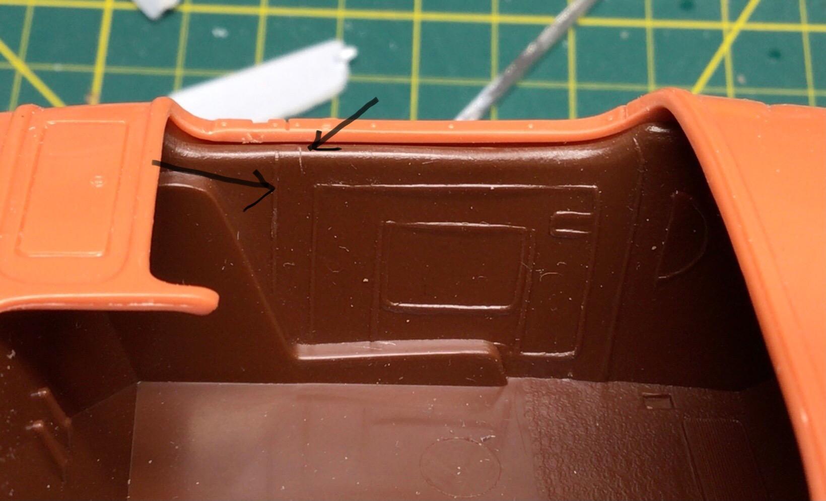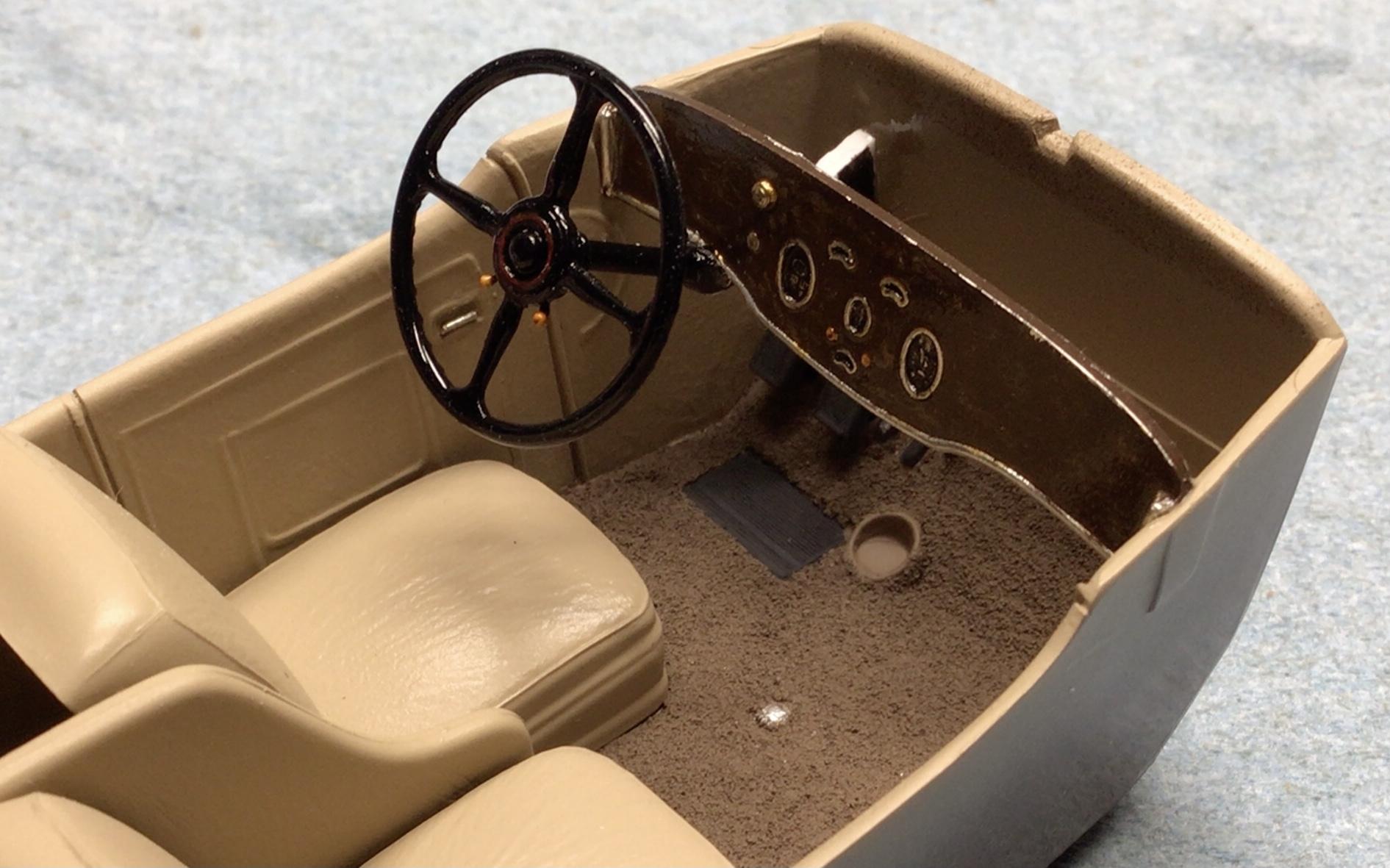 The interior is pretty much done except for the shifter and brake lever. They are awaiting the Crome treatment after getting the flash removed.? I scraped off the faint welting around the non existent door opening…which wasn’t in the correct place, scribed in some new door lines and added new welting. I made new controls (timing advance?) for the steering wheel by melting a ball on the end of some .020” Evergreen. The door handles are a piece of wire.