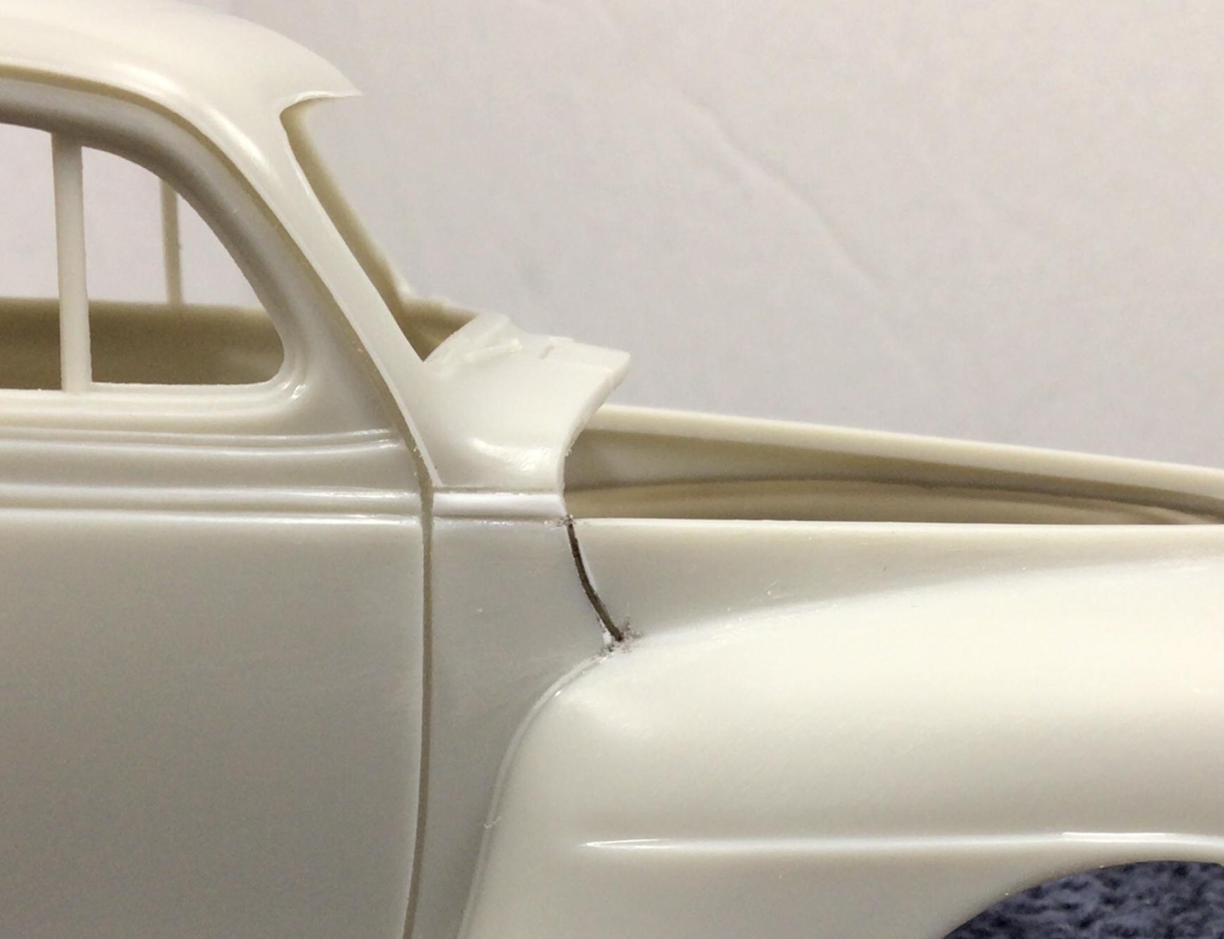 8. On a positive note, I filled the seams between the hood and fenders and re-scribed them with the proper curve more or less. I also added a piece of 0.30” half round to the molding just ahead of the passenger door, and I think I’ll do the drivers side too. The hood is just a tad wide at this point and those moldings being recessed like that make it seem worse. I’ve sanded off the original fender welting and when I get back on this I will try to scribe the line for the new welting which will be 0.020” Evergreen rod. I will likely just paint it body color.