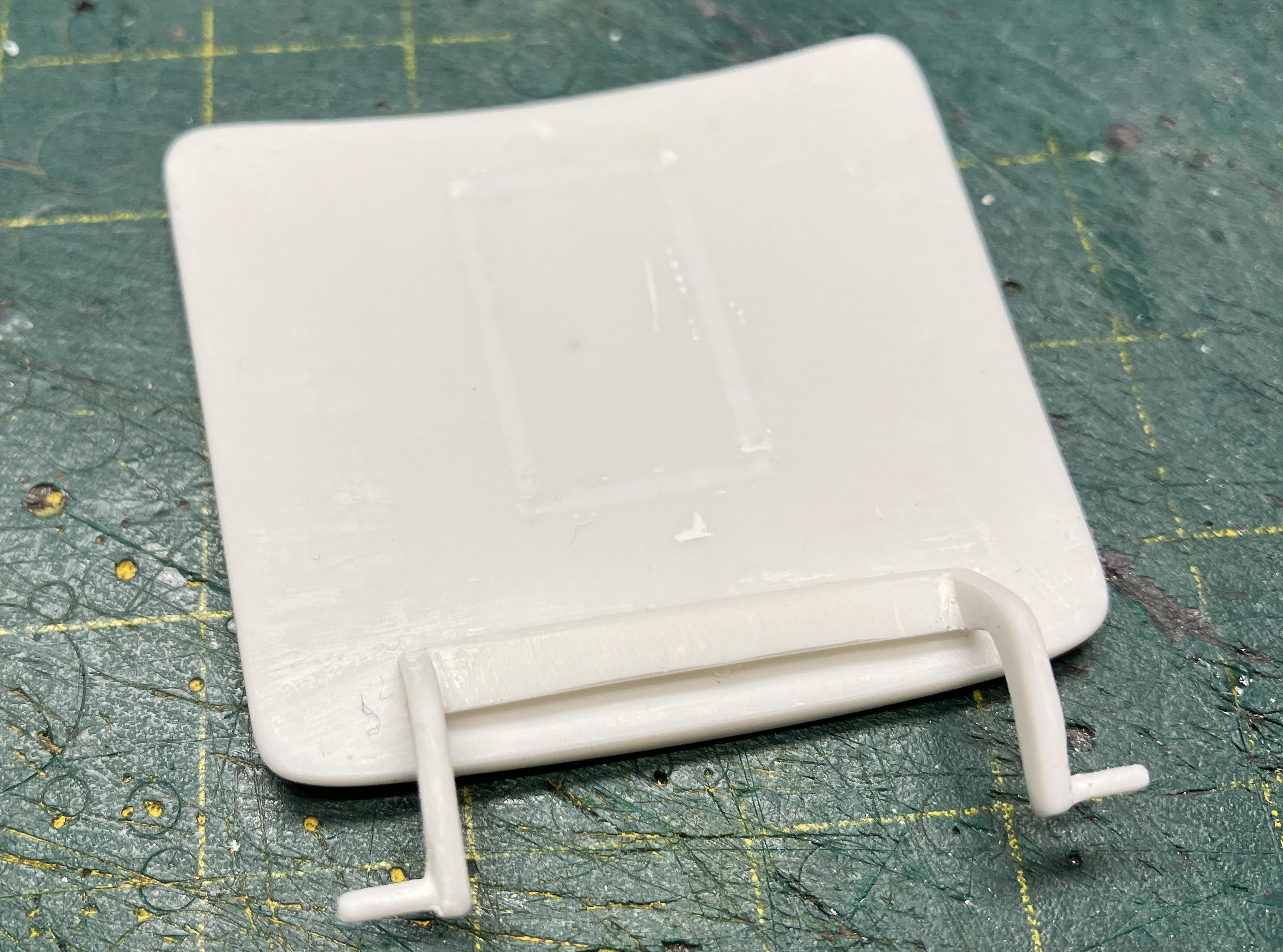 I decided that I didn’t like the chrome headlights and decided to drill them out. I came across this idea while fiddling with them. The O.D. Of the bezels is a hair more than 5/16” so I drilled a shallow 1/4” “reflector” hole in some .040” styrene, foiled it, and punched a 5/16” disc with the divet in the center. These fit perfectly into the recesses in the fenders. To my surprise, the drill left a raised point dead center which I decided looked a bit like a bulb or filament.? Then I trimmed .040” off the back of the bezels and hollowed them out. They slide in snugly and hold the reflectors in with no glue required. And a couple of lens from the parts box fit inside the hollowed out bezels which I painted SG black on the inside. On to the screens?. I wound up ordering some #20 s/s mesh on Amazon. I tried a number of ways to cut an oblong/oval disc that wouldn’t come apart.? I even tried CA gluing the intersections. It made a bit of a mess, but I figured I could clean them up after they were in place.? Then I had the idea to flatten the mesh between two flat plates in my big bench vise. I domed it a bit with the butt end of a paint brush and a 5/16 washer, made a tracing of the opening on some tape, fastened it to the screen and cut it out with my snips. They hold together a lot better than the un-flattened mesh, and a little tweeking with my favourite pointy tweezers and it wedges in place fairly nicely.? I gave them a couple spots of CA as insurance. They don’t have the proper chrome surround like the 1:1s, but I can live with this look…much better than the clear kit pieces with the molded in wires I think.? Now…I just have to be careful not to touch them while assembling the remainder of the kit.??