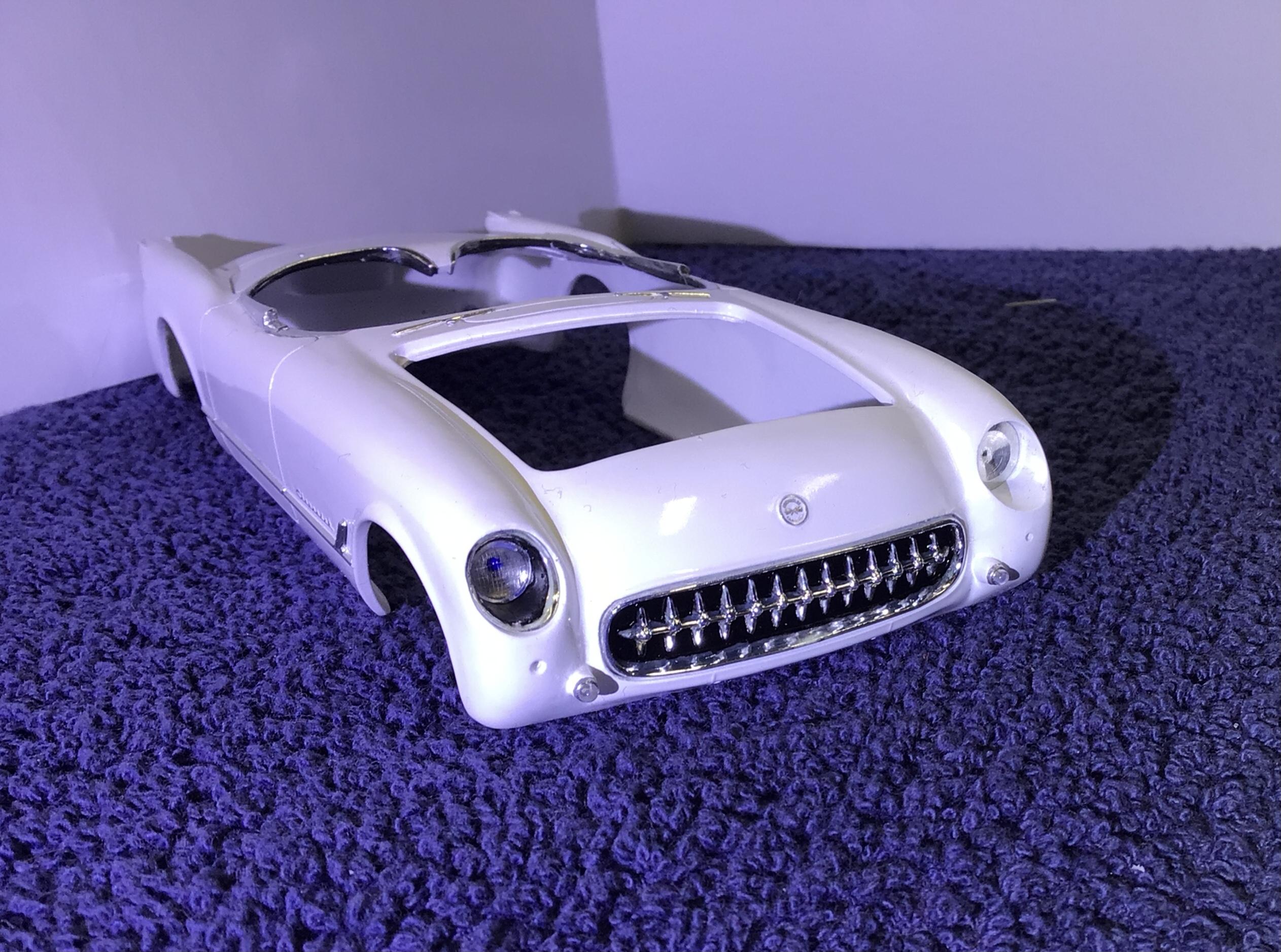 When deciding where to mount the side mirror, I discovered that the front door seam contour and the windscreen profile are nowhere near correct on this AMT version. This screenshot from Jay Lenos Garage shows quite a difference.? However, I have no desire to correct it (not easy?) at this point. Also, according to this interview, Chevrolet intentionally gave it the “squatted” stance, so that it would look like it was “taking off”….Okaaay.?