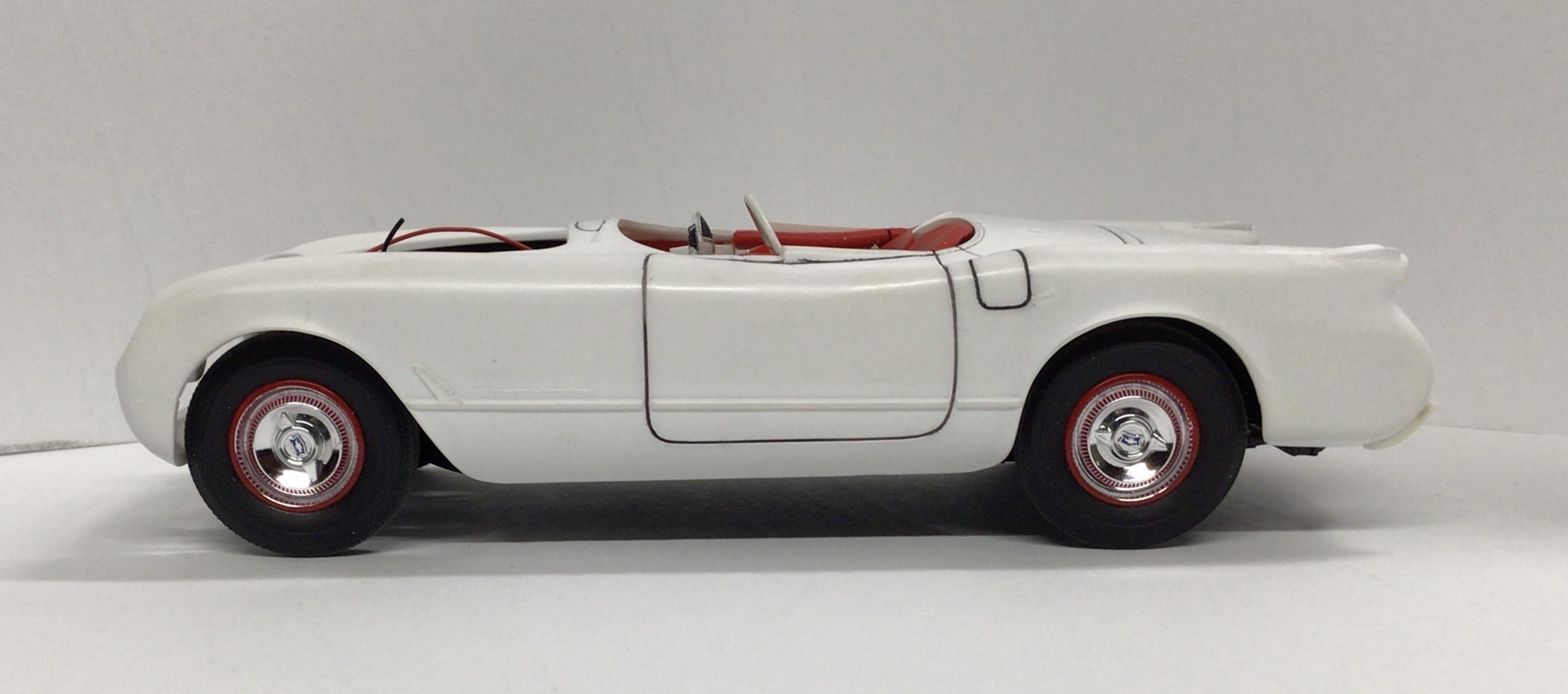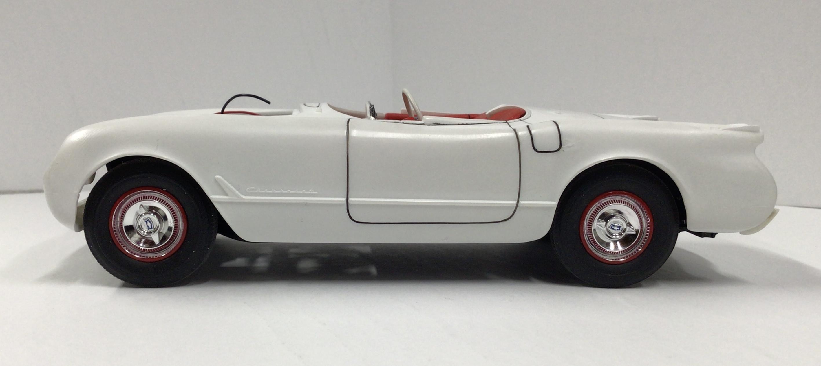 A lot of kits have ugly, lumpy mirrors.? I decided to scratch build one for The AMT Corvette I am working on. I wish I could find the kit piece to compare, which had a big ejection pin mark right on the face…but it somehow disappeared.? I started wth a piece of .030”x.100” evergreen strip 1/4” long. This makes a 2-1/2”x 6-1/4” mirror which should be close to the correct size? Chamfer the back edges and round the corners a bit and drill a shallow .050” hole to receive a chunk of evergreen rod. Then drill a hole in the .050” stub to accept a piece of .020” beading wire. A pin or brass would work as well, but I figure the soft beading wire can be tweaked slightly after installation for angle adjustment if needed. The wire will also double as a mounting pin. Next, drill a .0225”(#74) hole in a piece of styrene for the base. Cut and file the base to shape. The farther away you get, the better it looks.? Add some foil candy wrapper to the face with CA, and carefully trim to size with a sharp blade. A touch of Molotow and it’s finished. I ran a sharpie around the edge to give some contrast and it sorta looks like a mounting gasket.? This could easily be a side mirror too by adjusting the size of the mirror, or using a round slug for the mirror. If anyone has any alternate tips or techniques, or just pics of your scratch built mirrors…please post ‘em up.?