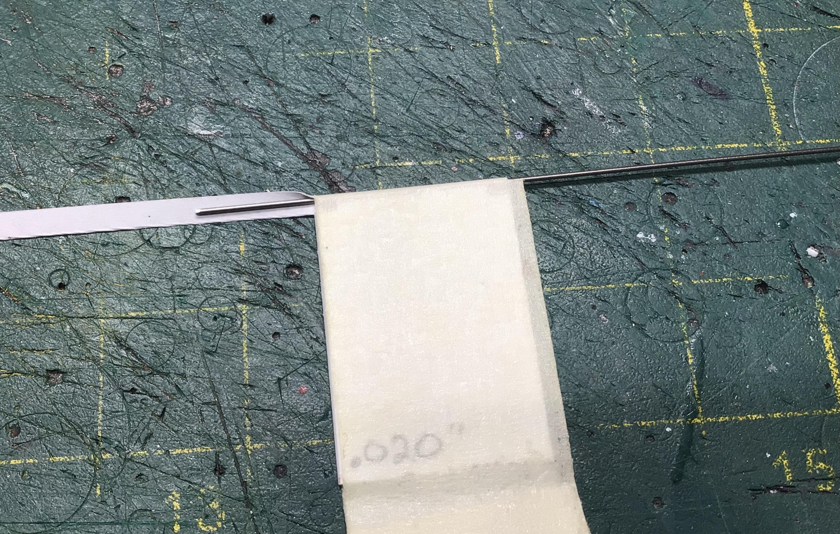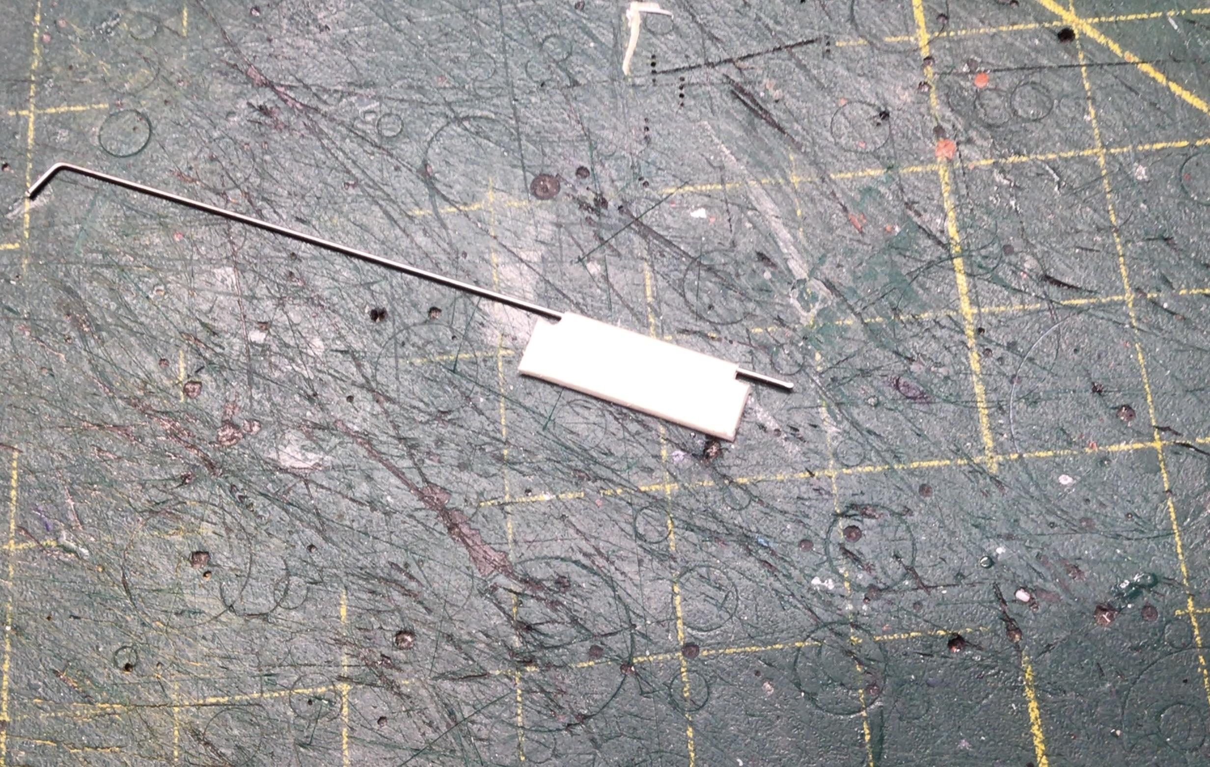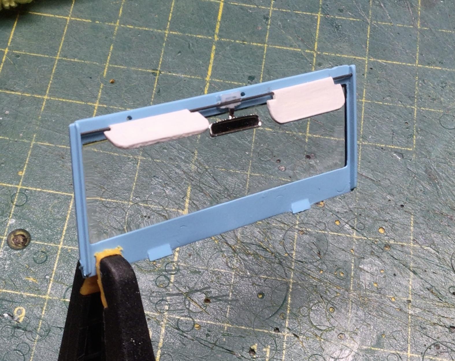 Some kits have inadequate or no sunvisors, like this Revell Bronco. They should be attached to the windshield frame and not the removable hardtop.? So,I made some with masking tape and styrene. I am using .020” music wire and .020” styrene sheet. I put a narrow strip of paper across the sticky side of the tape, so the pin won’t be stuck, laid the wire and styrene down and wrapped the tape around it. A little trimming and shaping later.? The pin can be removed and replaced and the visor position adjusted. I coated the edges with some thin CA before paint in hopes that the tape will never let loose.