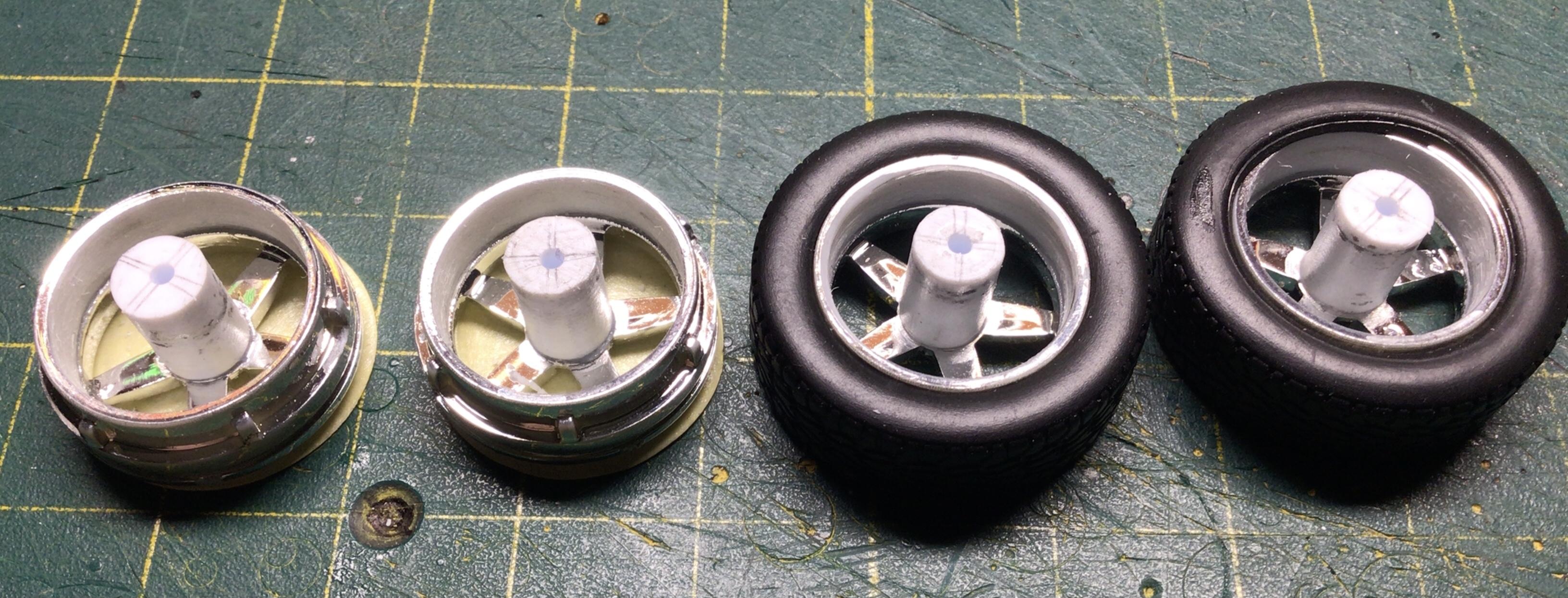 I don’t remember what kit the wheels are from. They had solid backs and decals for brake rotors. I decided to open up the backs and add my resin cast brake rotors. I first had to add styrene stubs to the outer rims so I would have something to connect to the knuckles and differential. I may need to trim them slightly yet to get the track width right.? The original kit rims and brakes are at the top and the ones I am using are at the bottom. Thats it for now.?