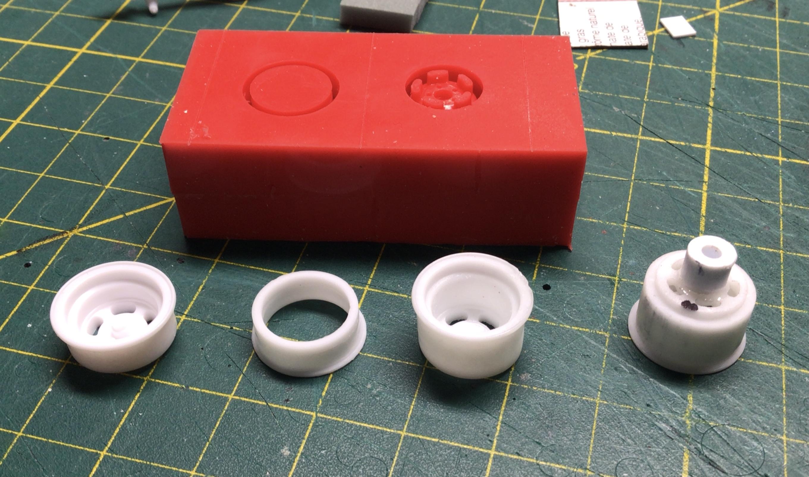Since this suspension is taking longer than I figured, I mixed up some sprue glue to fill the seams on the chop. It should have plenty of time to set.? I am trying to use the rear tires I cast from the AMT ‘67 Chevelle. They are a little big but…I have nothing else close.? I don’t like those rims though, so I widened the ones from the MPC ‘34 Slammer kit and cast them too. I figured I would need a very narrow center section because of the tubbing, so I scratch built a quick-change rear for it. It looks a lot bigger under the vehicle (I scaled it down off of a schematic) than when I was building it? Due to the channeling, I have to lower the entire rear end with the body and it looks too high in the back I think, so I may wind up radiusing the rear wheel arches.