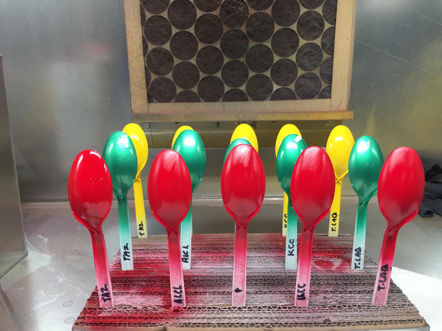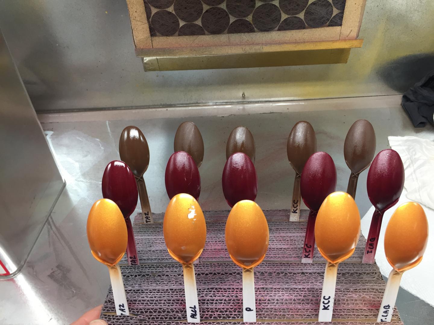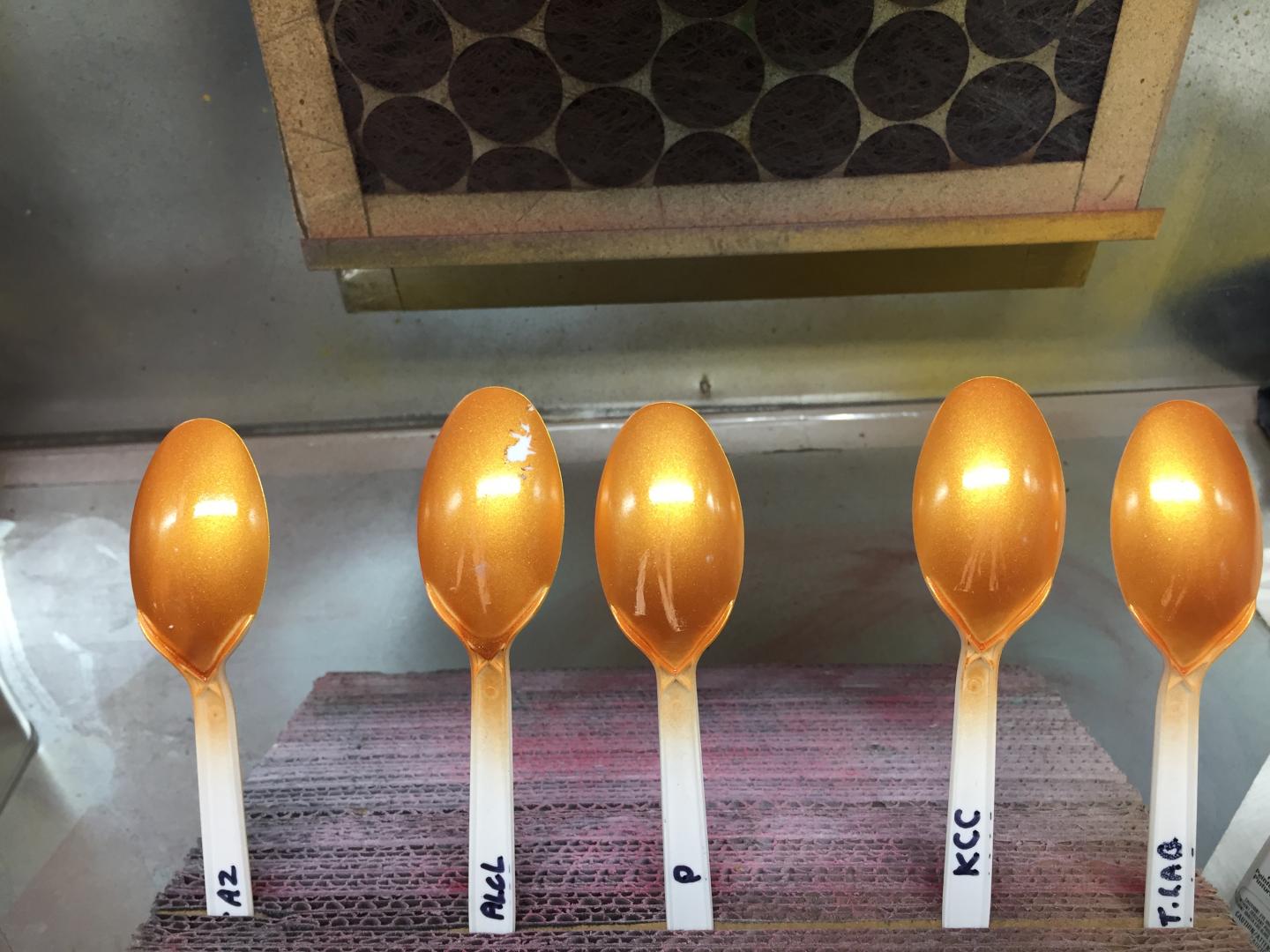 I did a little durability test by scraping the back of the spoons with an Olfa knife. You can see how each of these faired. Once again the Testors Aztec seems to be the toughest. I am currently trying some Tamiya Pearl Clear. No pics yet, but it sure is purty!