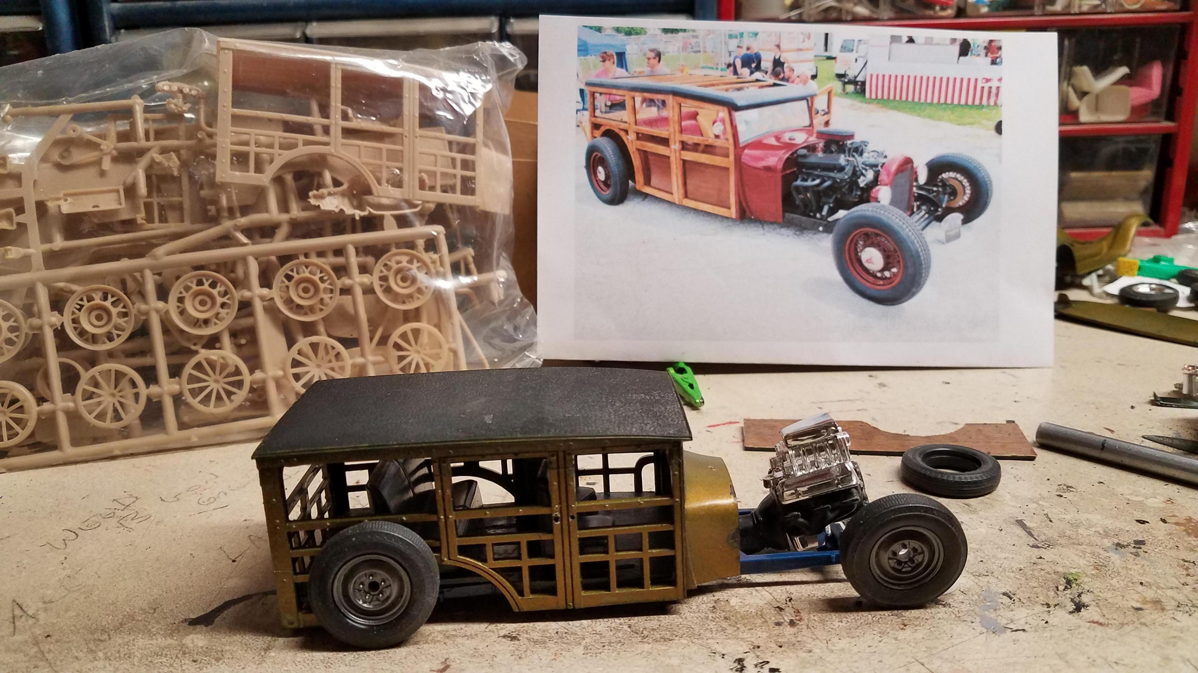 13. this was a built kit molded in black and painted lime when i got it. after a purple bath, the paint didnt really come off. any body that knows of me, i like different. had a pic i came across for some insparation. chopped it, moved the rearend back so more of the back door was there for getting in back seat. used cut off pieces from opposite sides to reconstruct woody framing and cast a small piece of curve to finish the curve. first thought fenderless but back wells were so huge, tire gets lost, fenders big too, but not as big. was going to go black walls but tried some white walls and had my interest, then, the modelhause big n littles white walls and i smiled. thanx, enjoy built 6/20/20