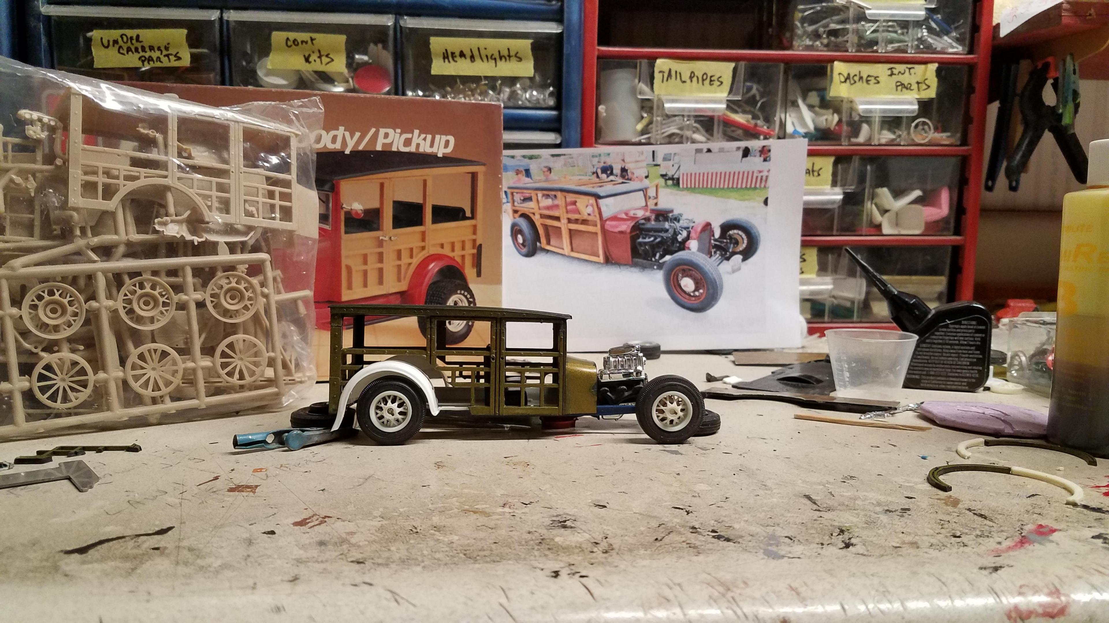 14. this was a built kit molded in black and painted lime. in a purple bath the paint didnt really come off. any body that knows of me, i like different. had a pic i came across for some insparation. chopped it, moved the rear back so more of the back door was there for getting in back seat. used cut off pieces from opposite sides to reconstruct woody framing. first thought fenderless but back wells were so huge, tire gets lost, fenders big too.