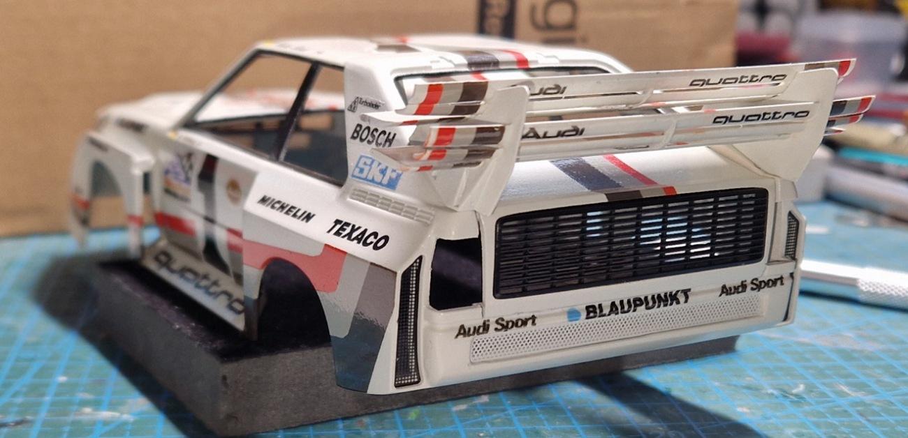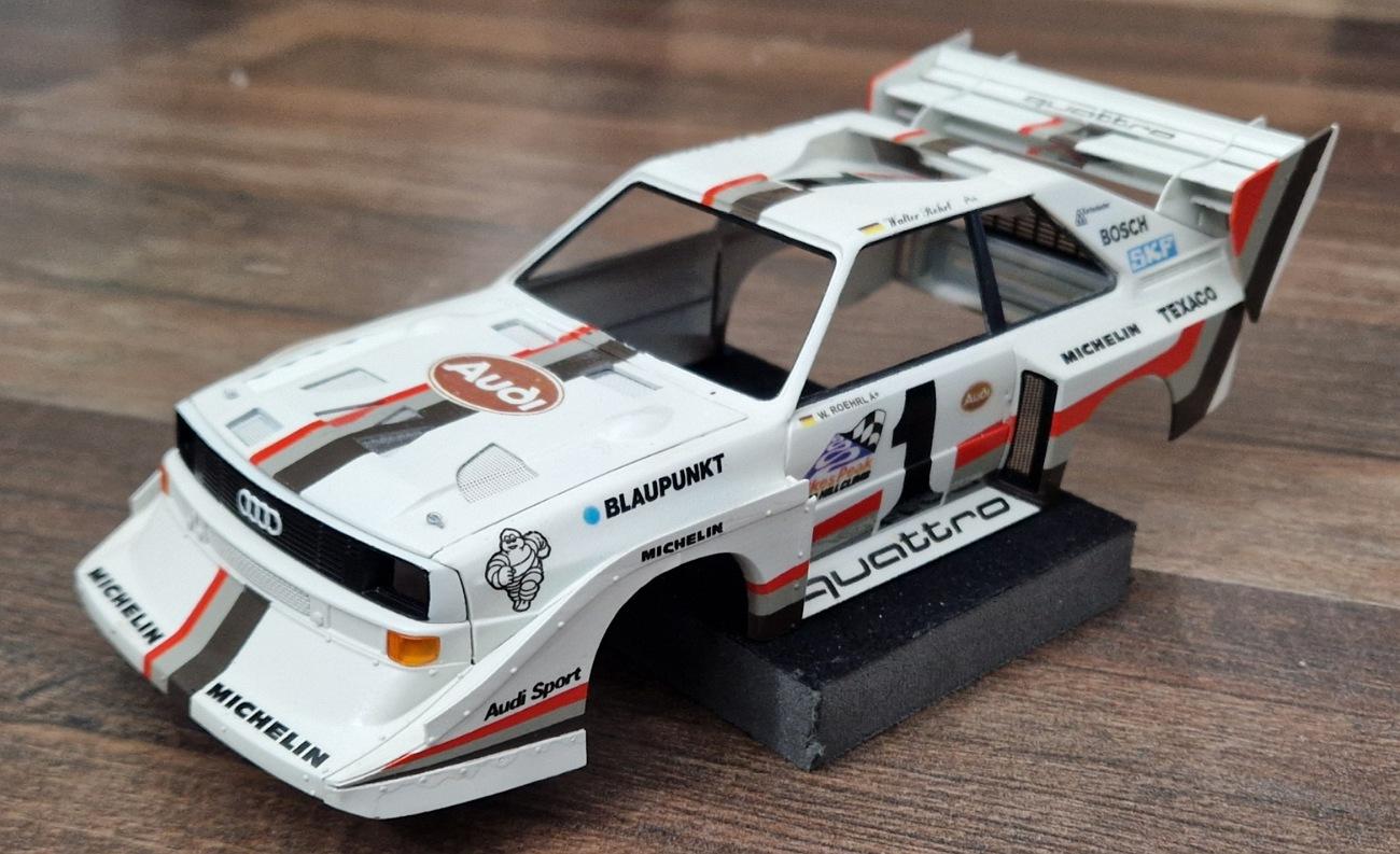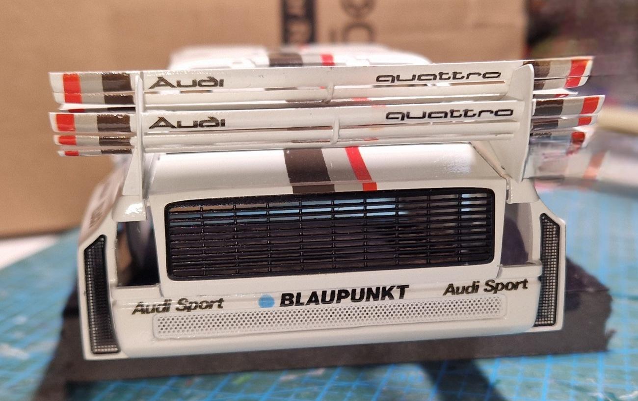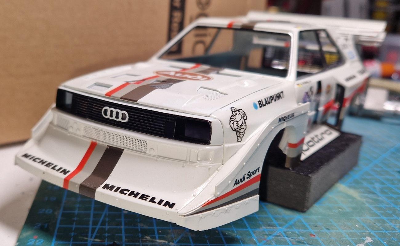 Hello everyone, it's been a while. Now I have a little update for you. I removed the windows. It had plastic panes without sliding hatches. Then I painted the stripes. Of course, I made a mistake. The stripes are interrupted on the hood, where the Audi logo will be placed later. But that was fixed and repainted with the base coat. Hopefully, the decal will cover it up later. I'm still looking for a reasonable solution for the stripes on the sides. The widening makes it almost impossible to mask everything off exactly. Here I created and printed a few decals. I hope you'll stick with me? -