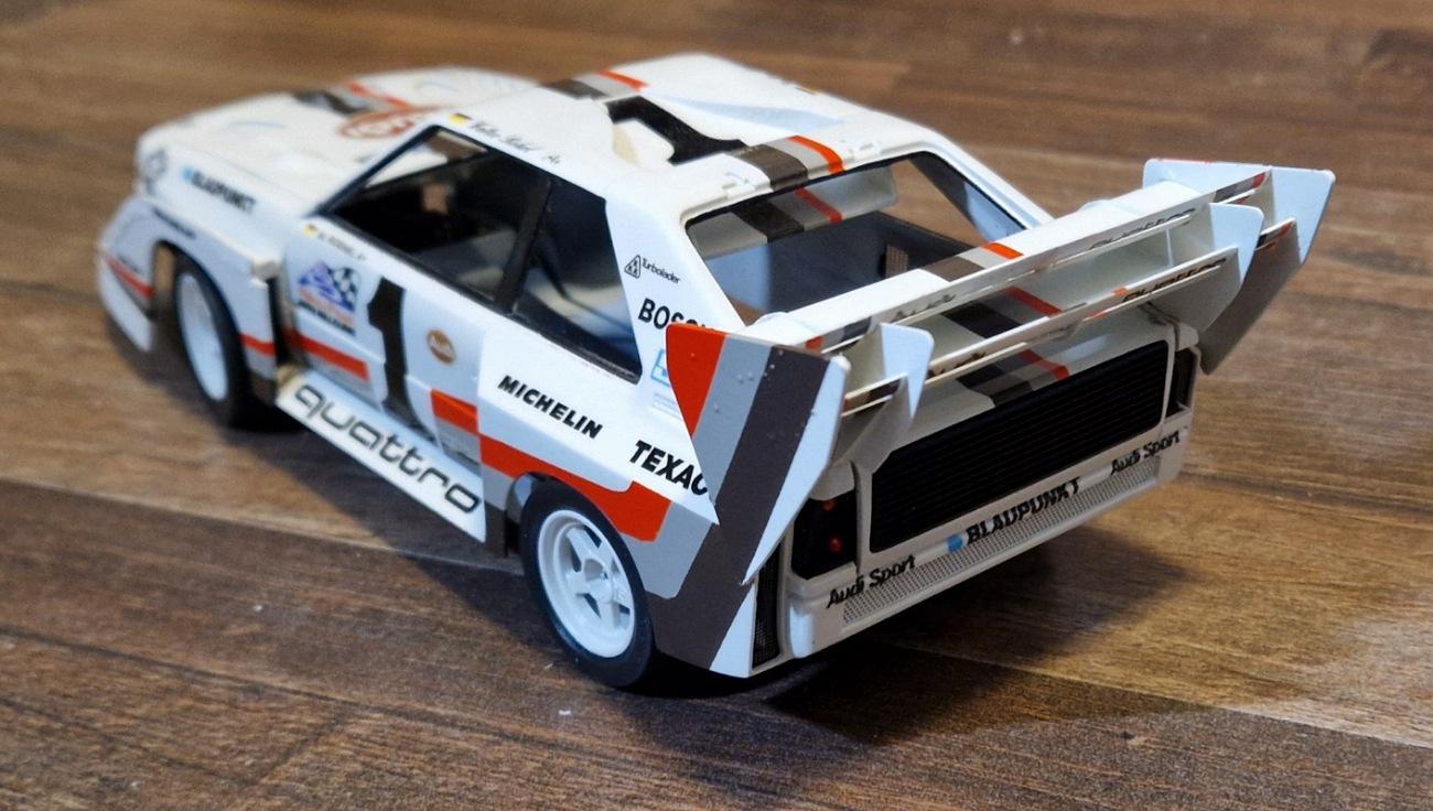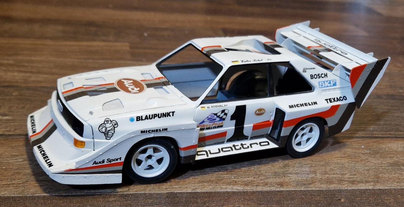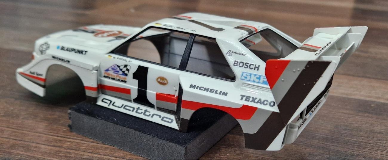 Hello, it went a little further. Unfortunately, I didn't have that much time because I had to work all the time. I put on the front and inserted the radiator grille loosely. Etched parts were also inserted. Then everything was painted. Then I printed the tires. Walter wasn't on slicks at Pikes Peak, he had Michelin Pilot Sport Cup tires. Then it was time for the underbody... ...with brake disk from the etched parts set. Here I put the front spoiler on loosely. Unfortunately not too much, but I didn't manage more in 2 days. -
