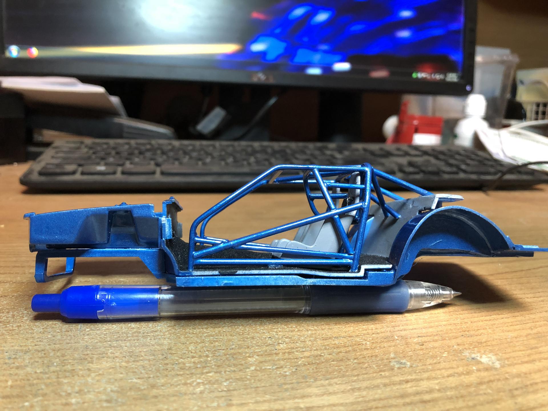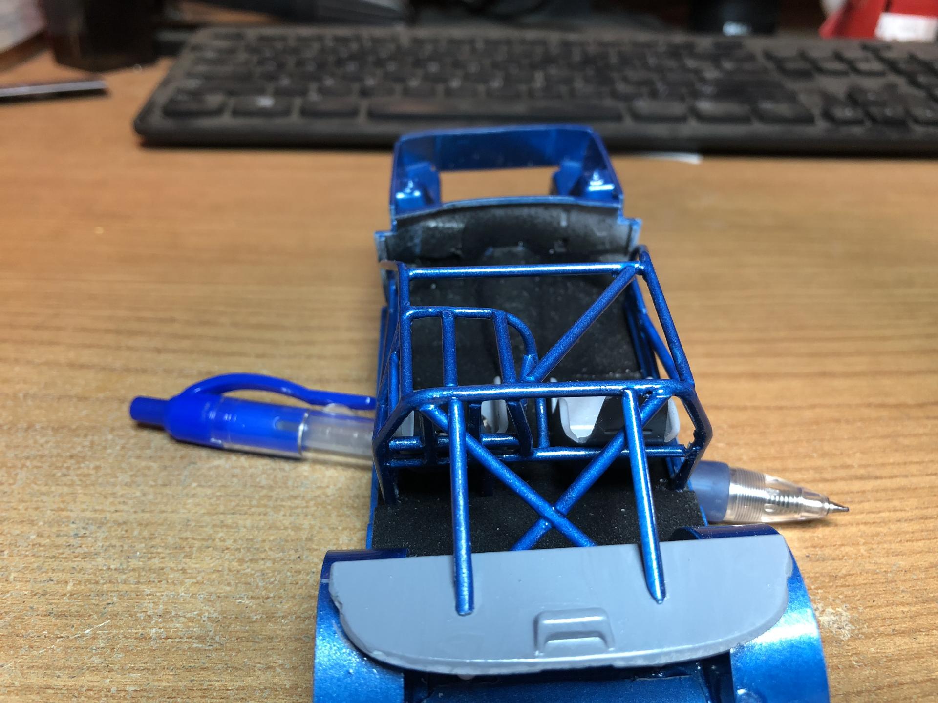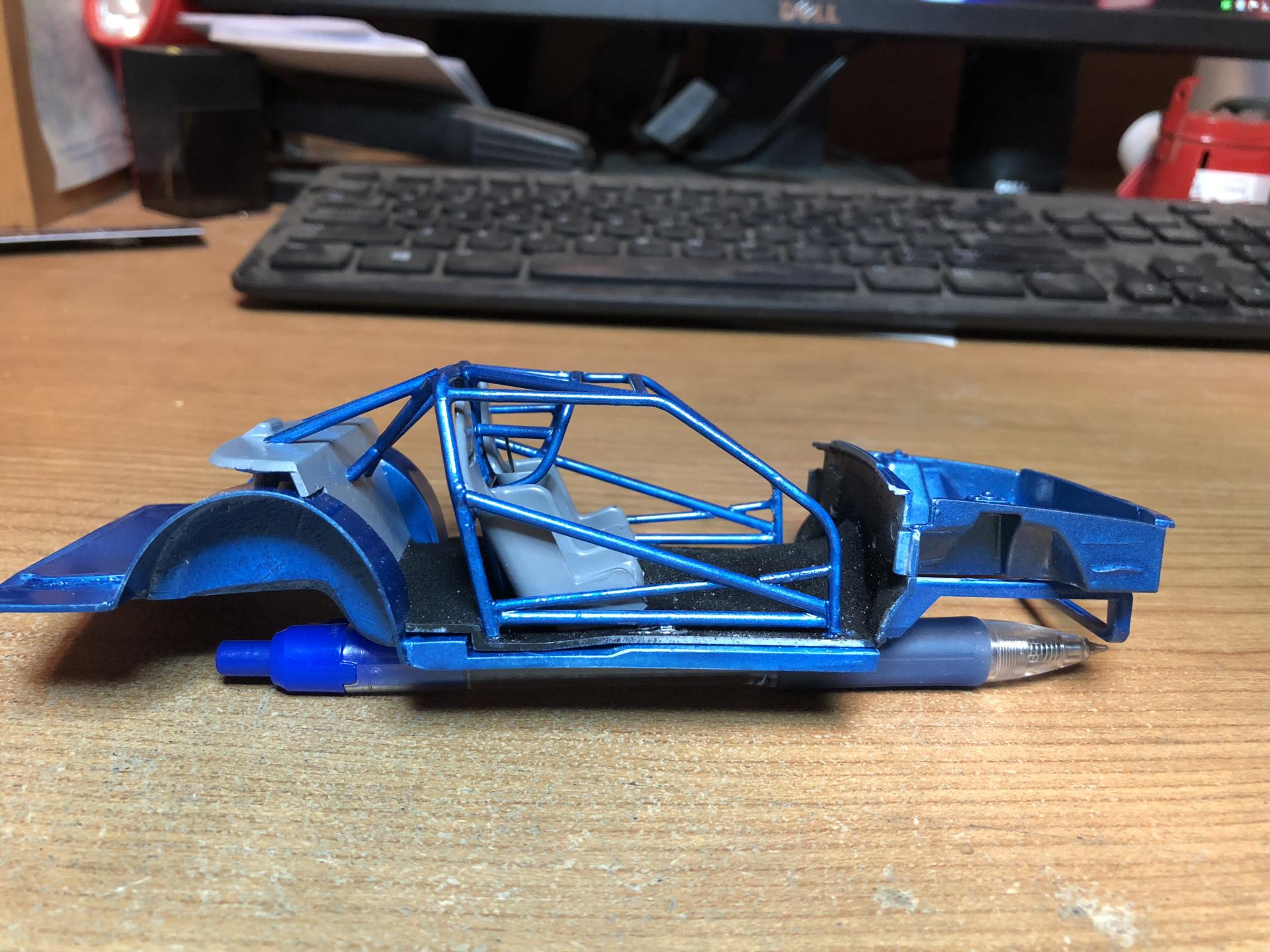 not much progress, mini tubs finished, 25.5 cage need to finish door bars. Too busy working on full size stuff. Sold motor out of 1.1 car, putting a turbo Coyote in it, so I have to start on a Coyote for the model too.
