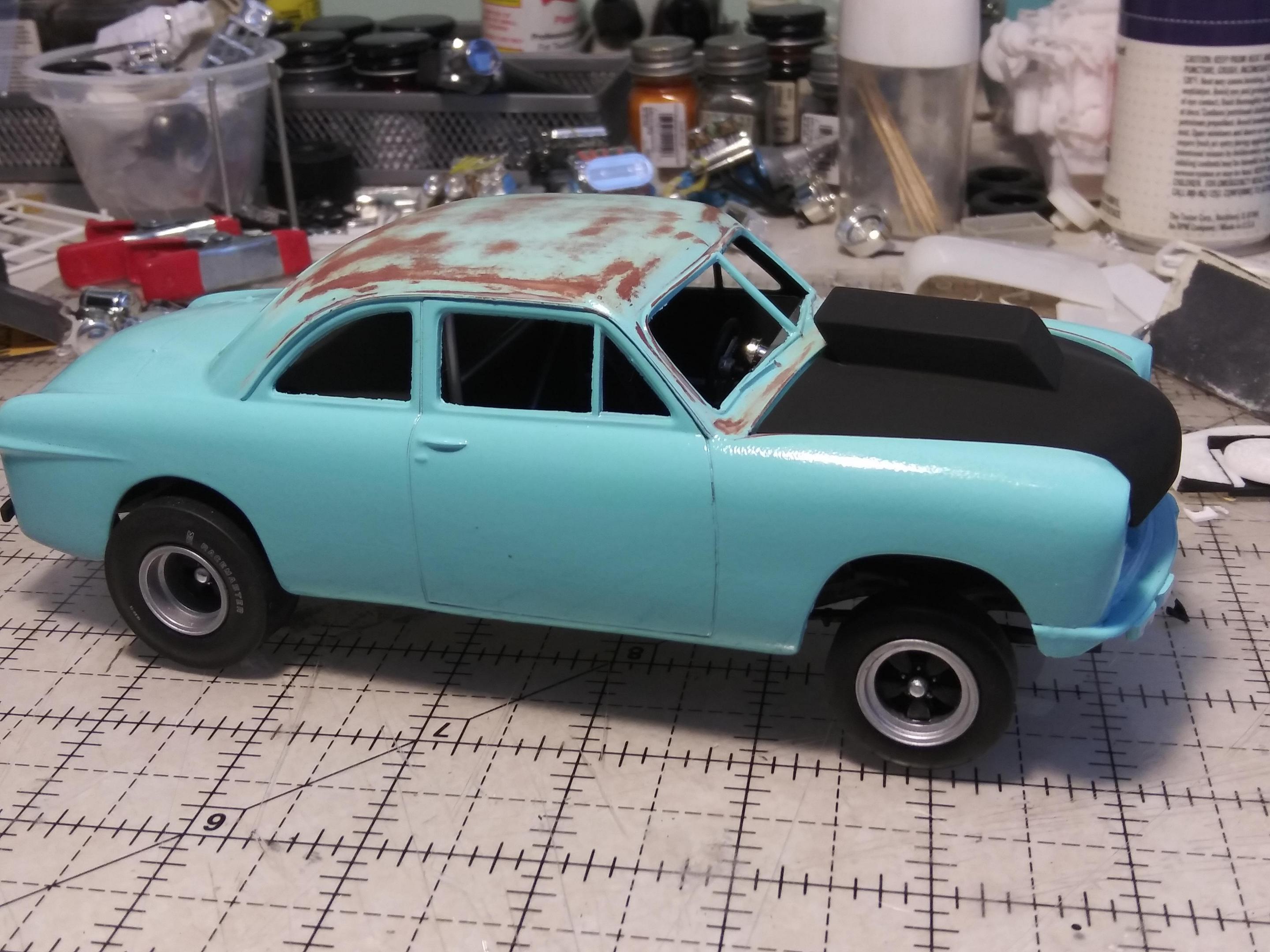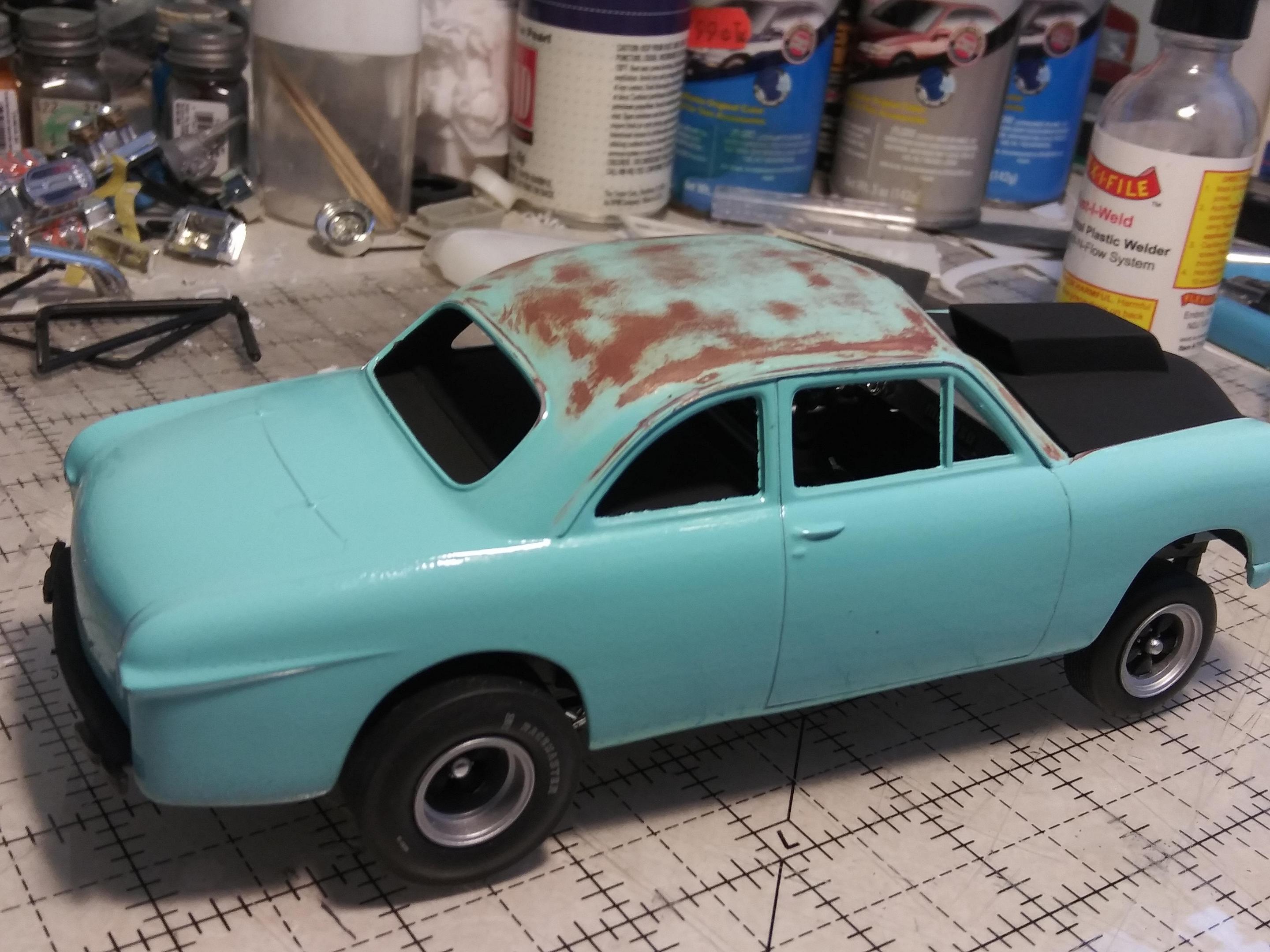 Making progress on the 49 gasser. This is my first attempt at a patina paint job. (Not done yet.) Looks OK I think. Hope to have it done in time. -