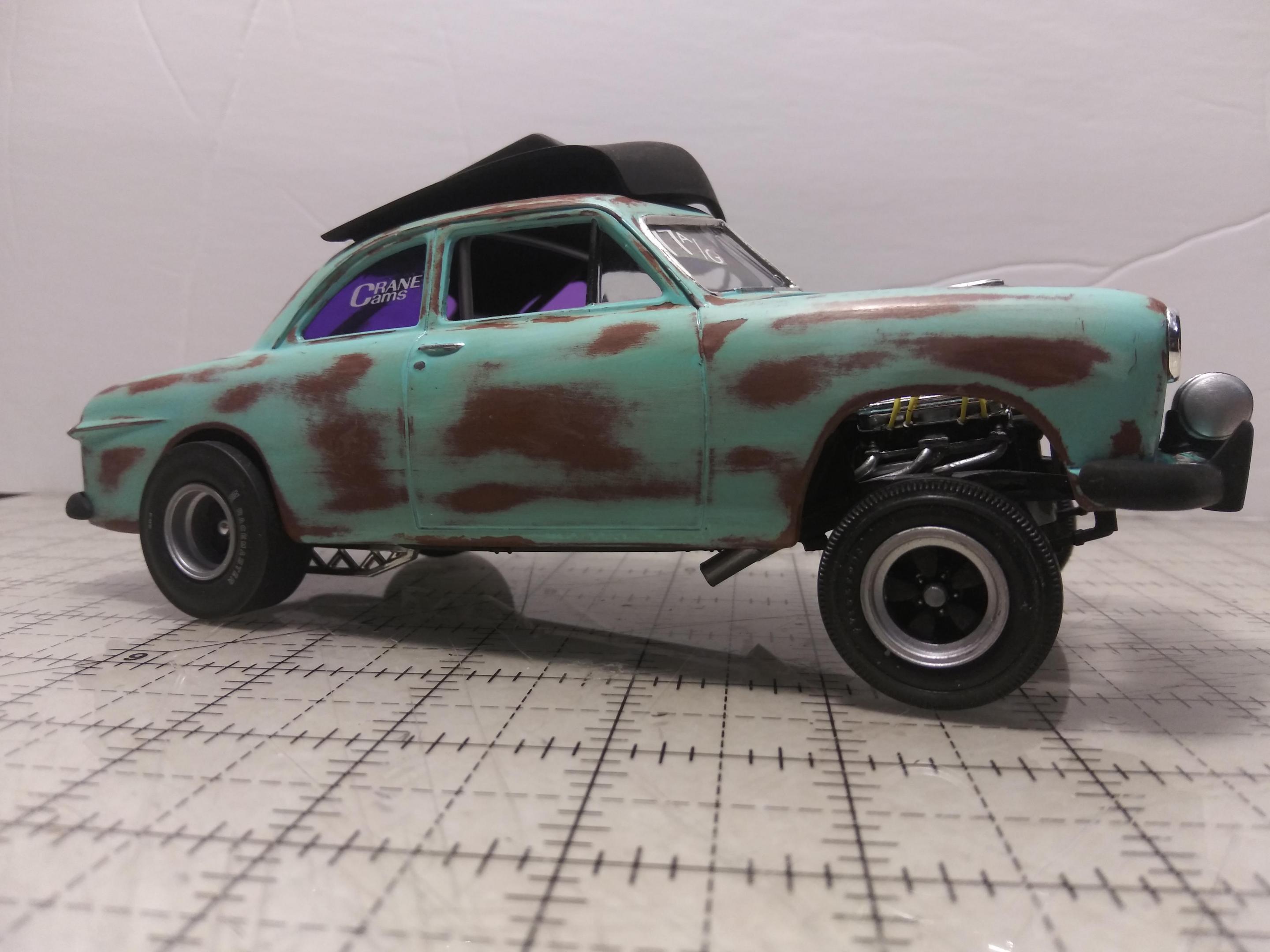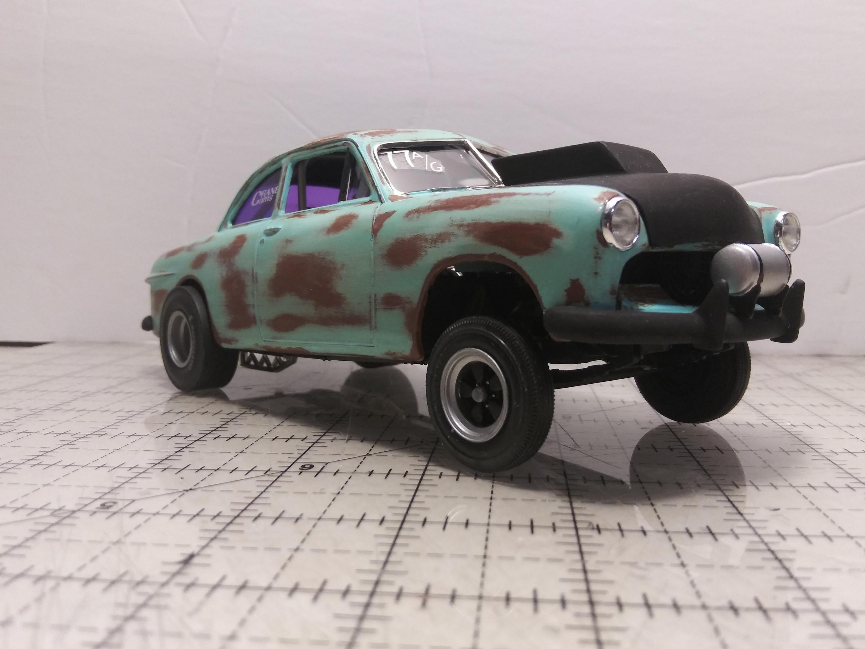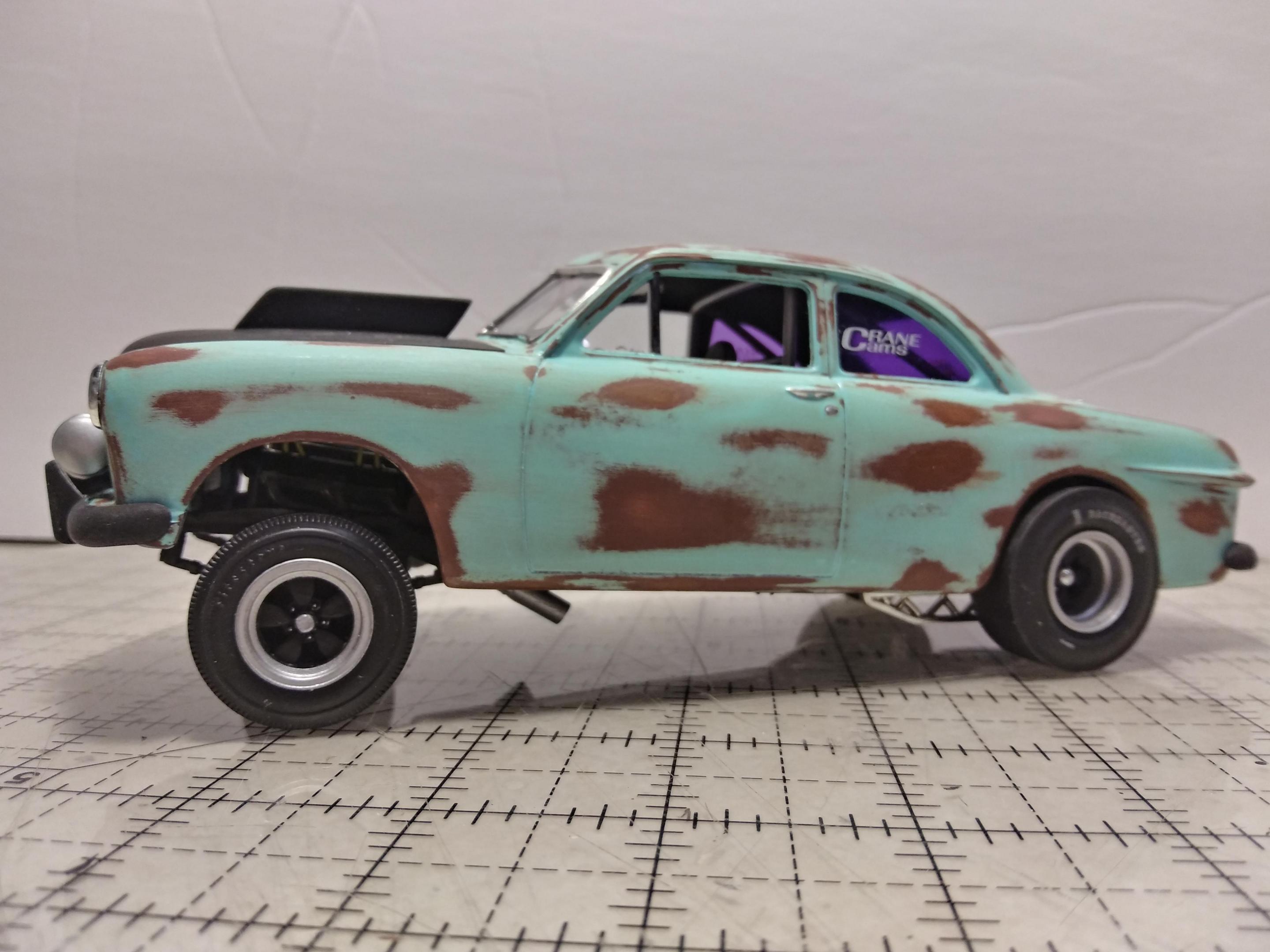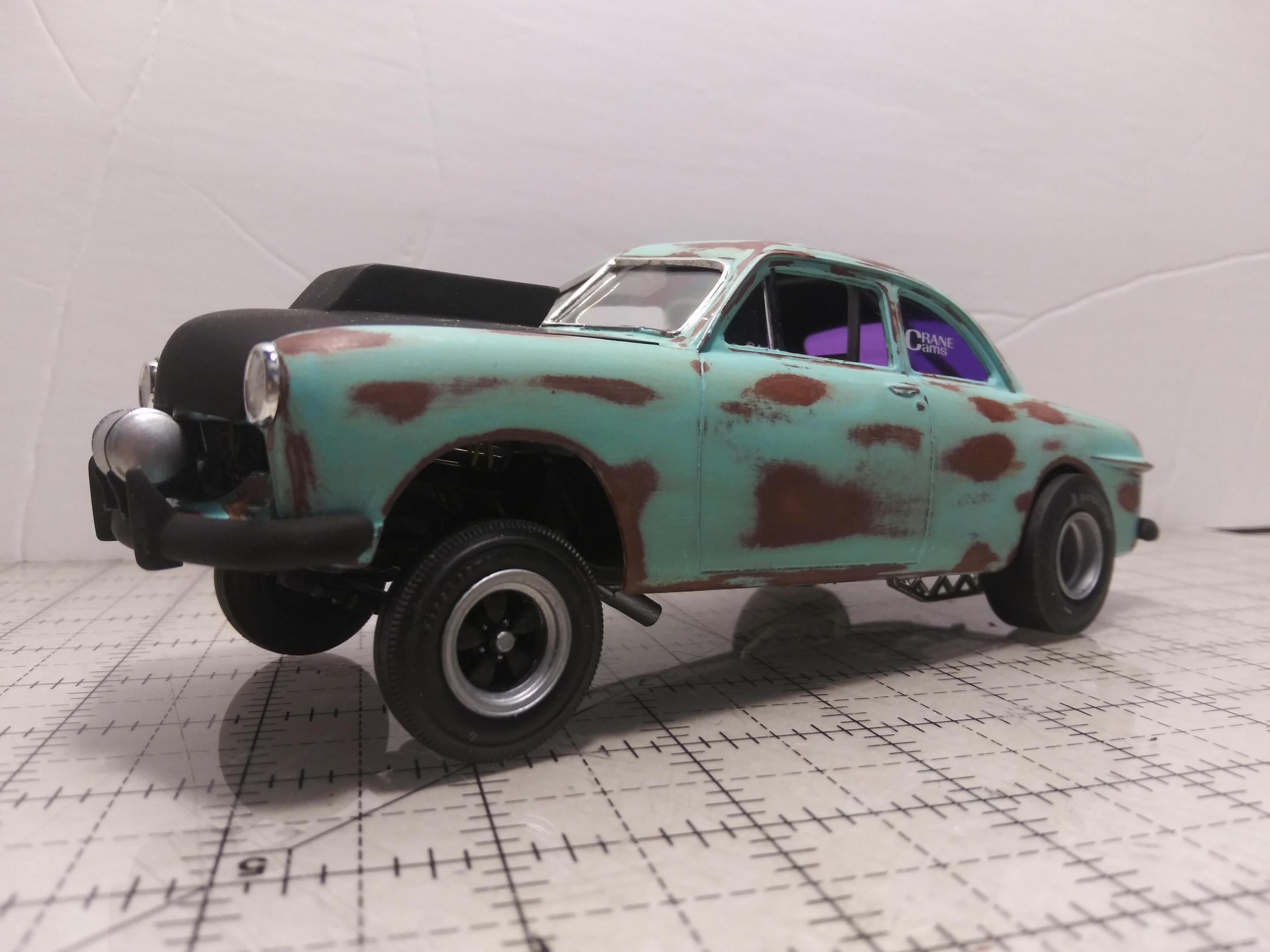 So this is in the BOYD but thought i would share here to. 49 Ford gasser. Removed interior panels replaced with flat styrene ,built flat dash, built roll cage. Built cadillac engine for it. Headers are scratch built styrene rod, injection set up is from an outlaw. This is my first attempt at doing patina paint job. ( NOT DONE YET). Lookin OK I think. As always input is greatly appreciated.?