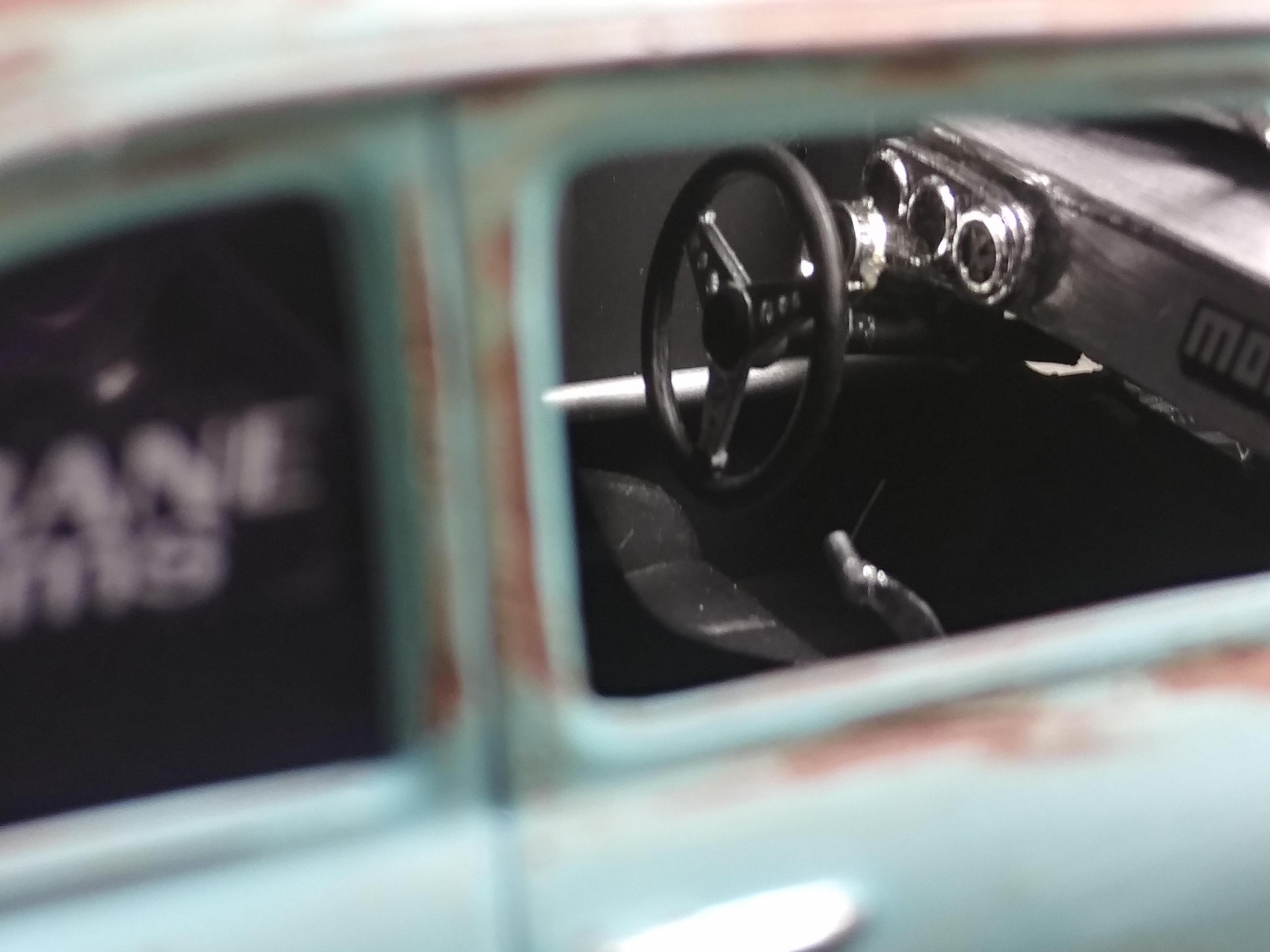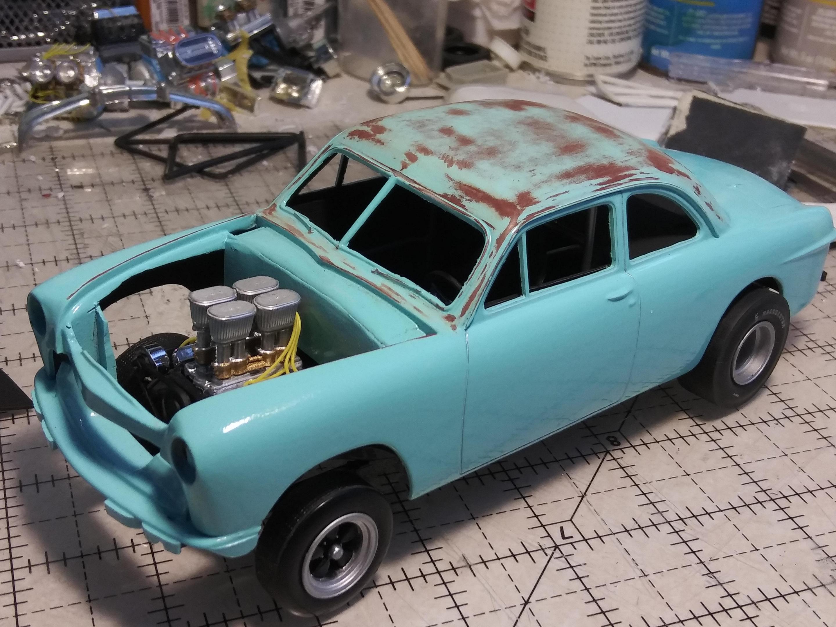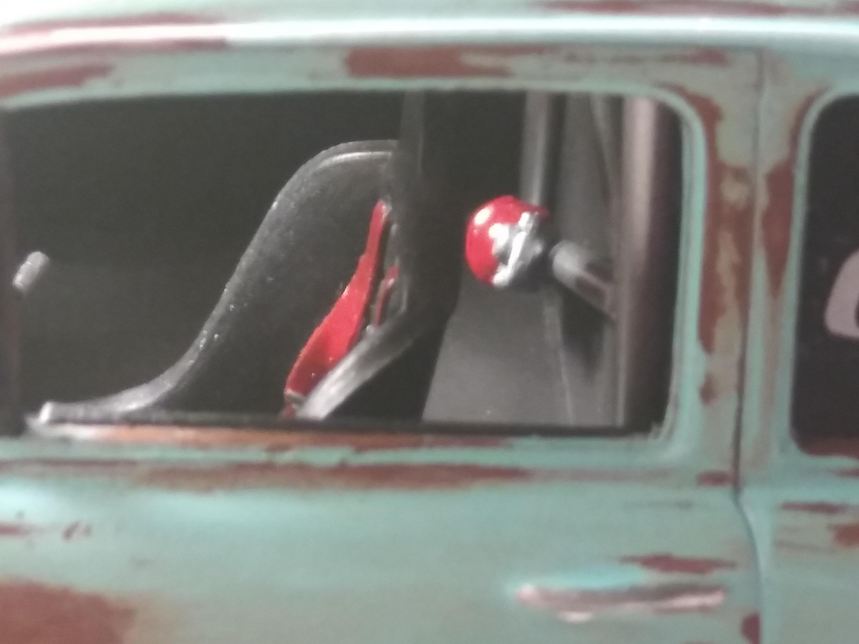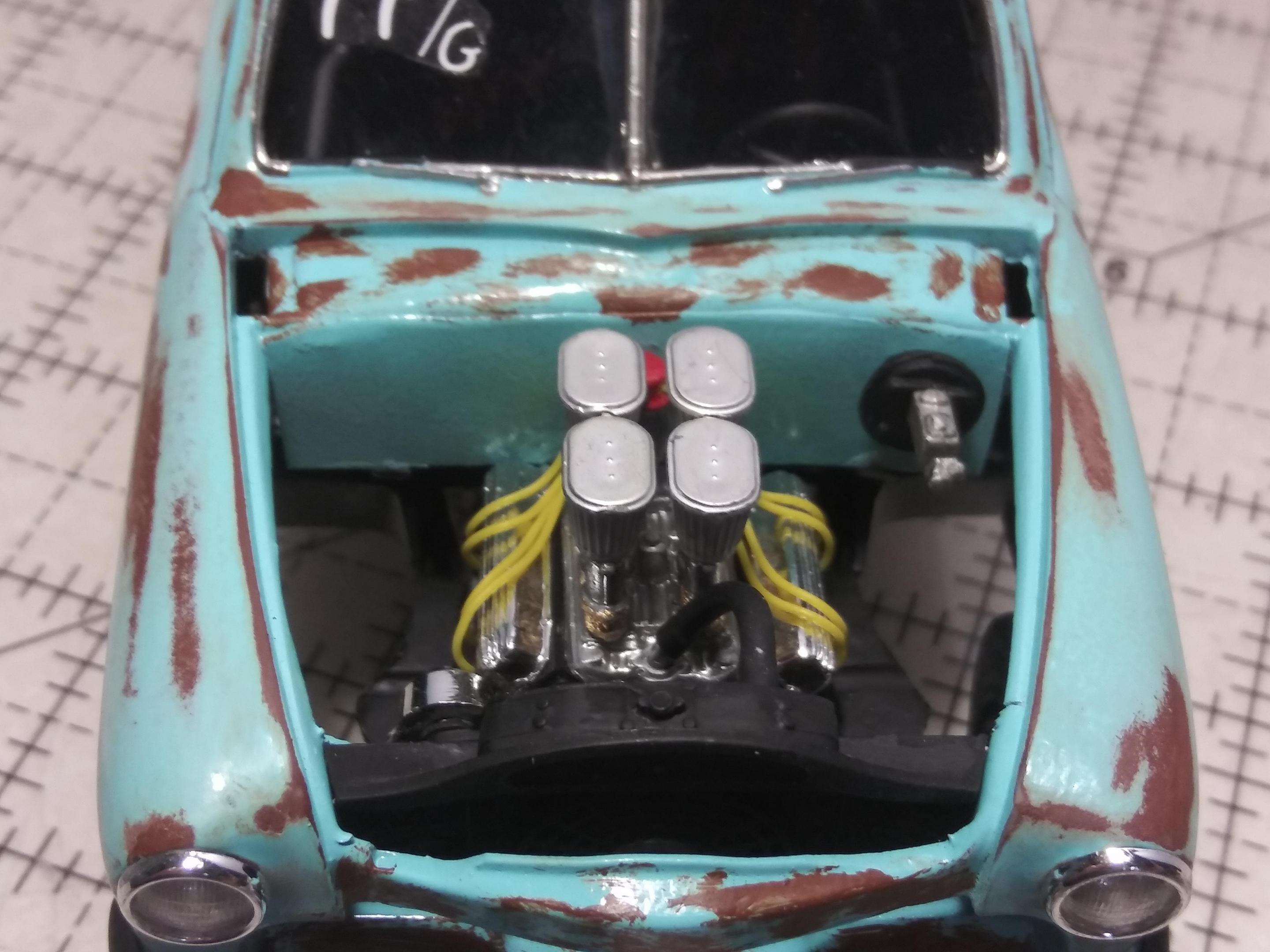 So this is in the BOYD but thought i would share here to. 49 Ford gasser. Removed interior panels replaced with flat styrene ,built flat dash, built roll cage. Built cadillac engine for it. Headers are scratch built styrene rod, injection set up is from an outlaw. This is my first attempt at doing patina paint job. ( NOT DONE YET). Lookin OK I think. As always input is greatly appreciated.?