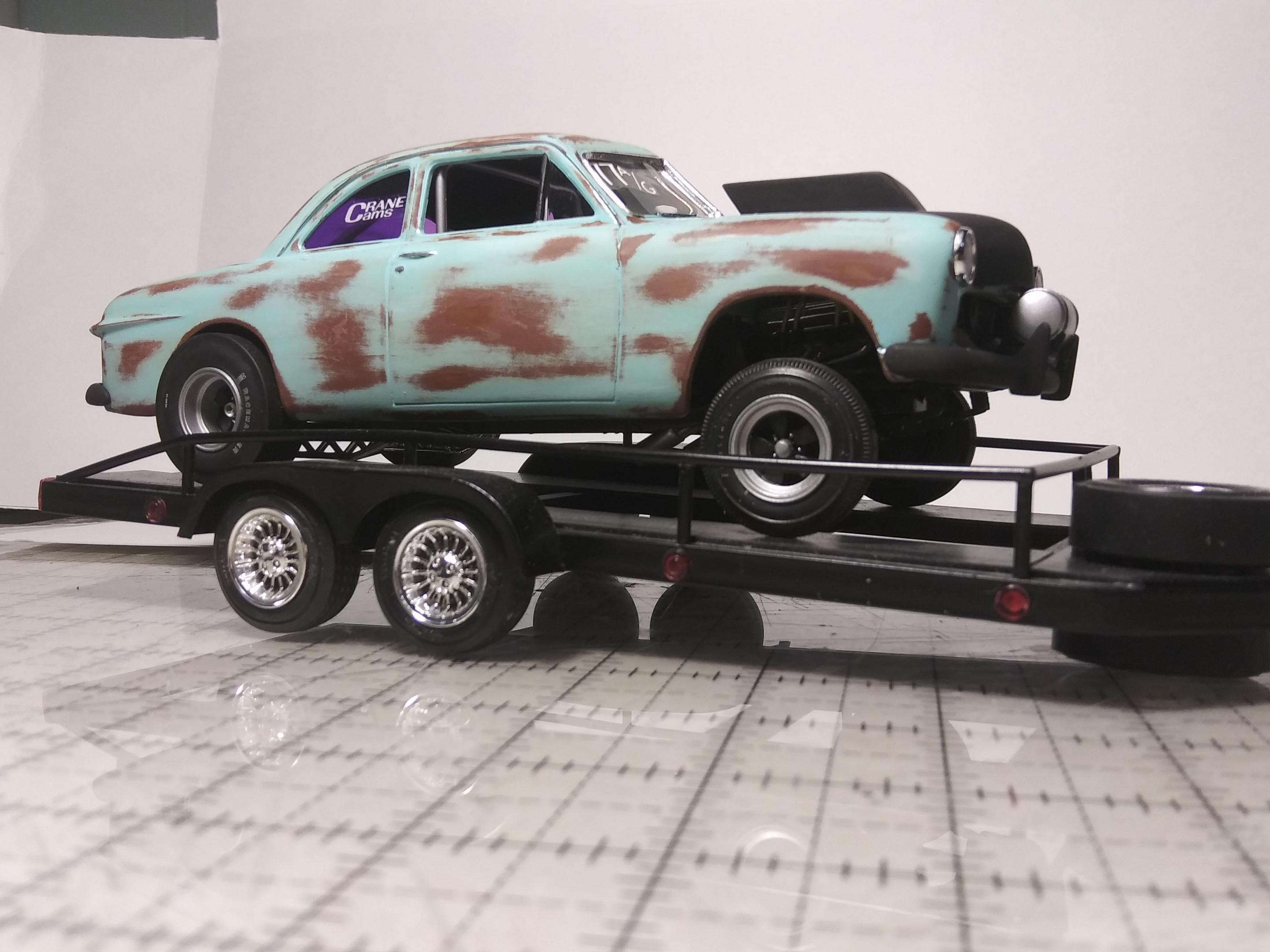 Finished up the gasser. Did some more diggin in the tire box and managed to find some front tires that are a little taller and skinnier. Had fun with this one. The trailer is one I scratch built a couple years ago. Thanks for lookin. -