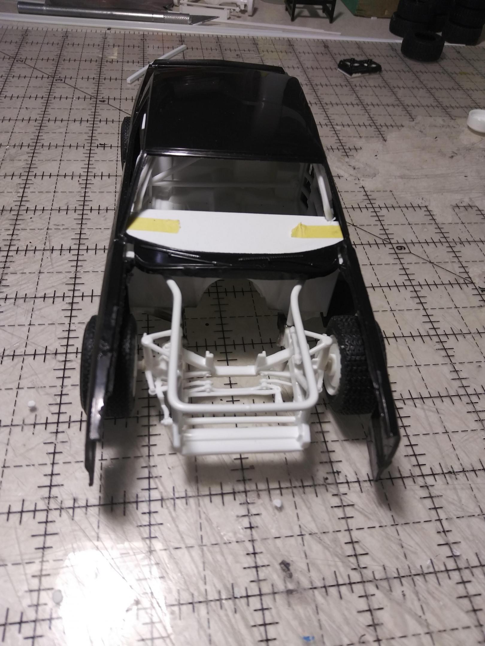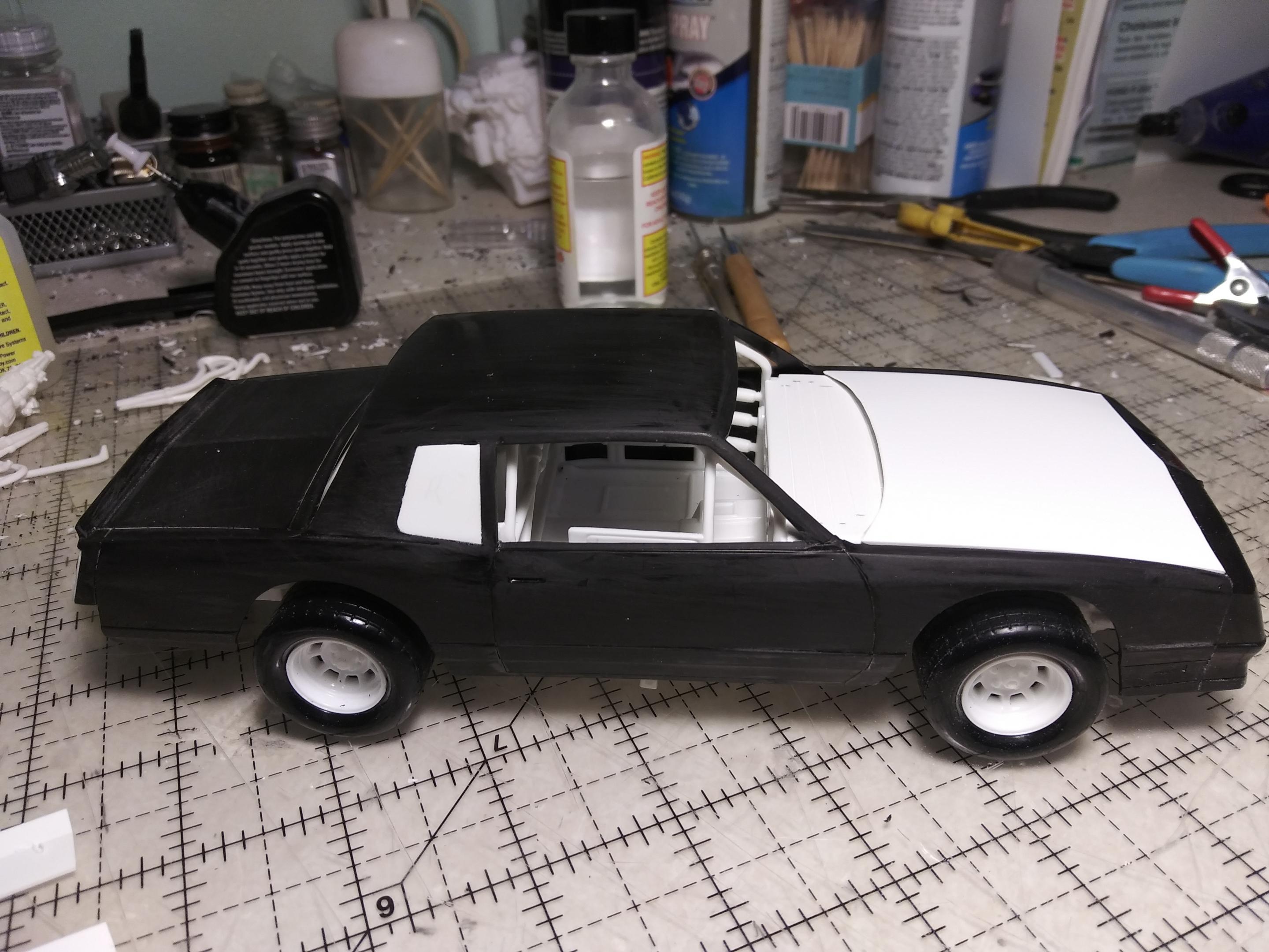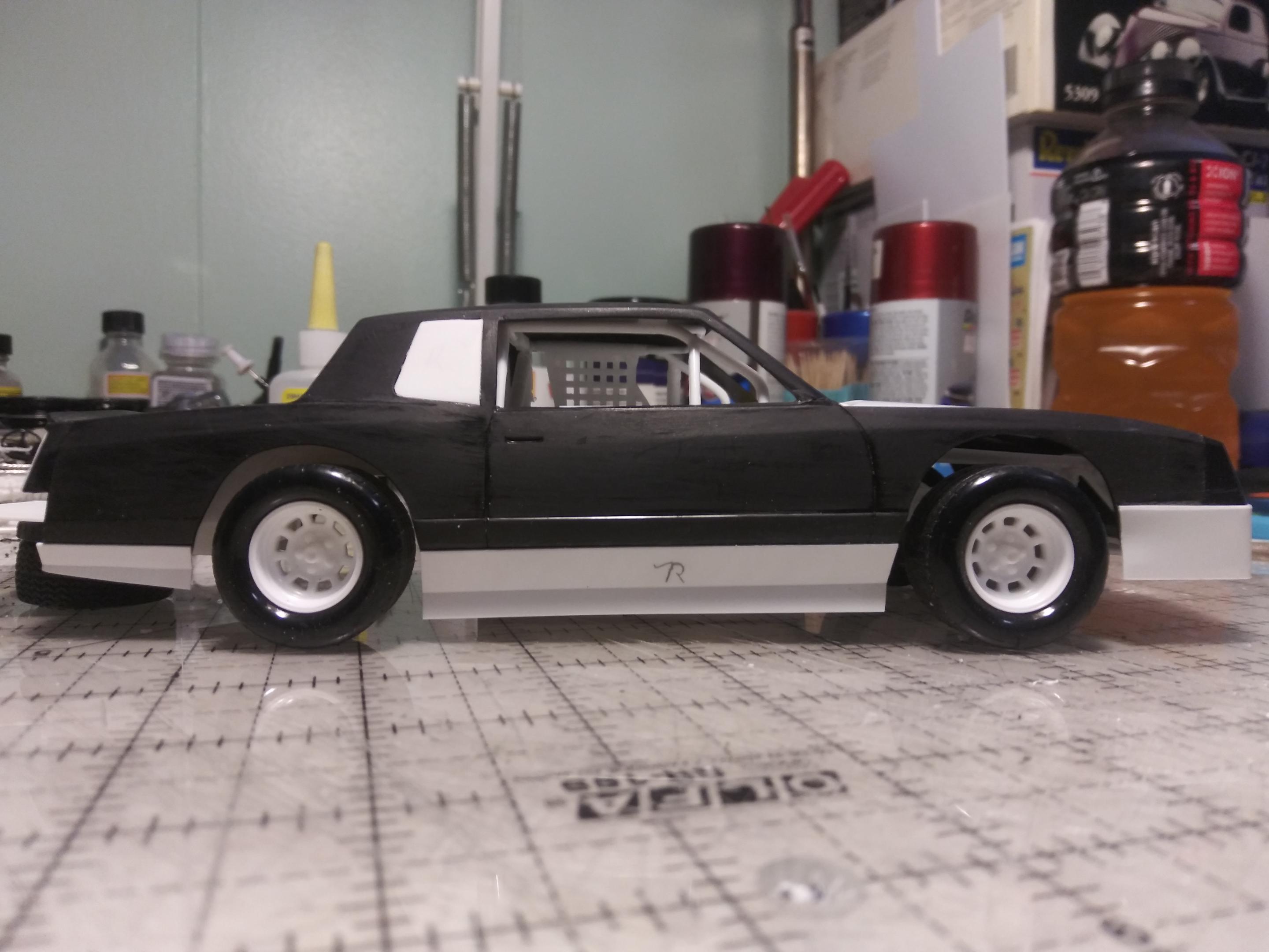 Made a little more progress on the stocker. Got the filler panels done. Made some side skirts, didn't take pics of them. The tires are dirt track tires that I narrowed. The hood is scratched from 0.040 styrene. As always comments welcomed. -