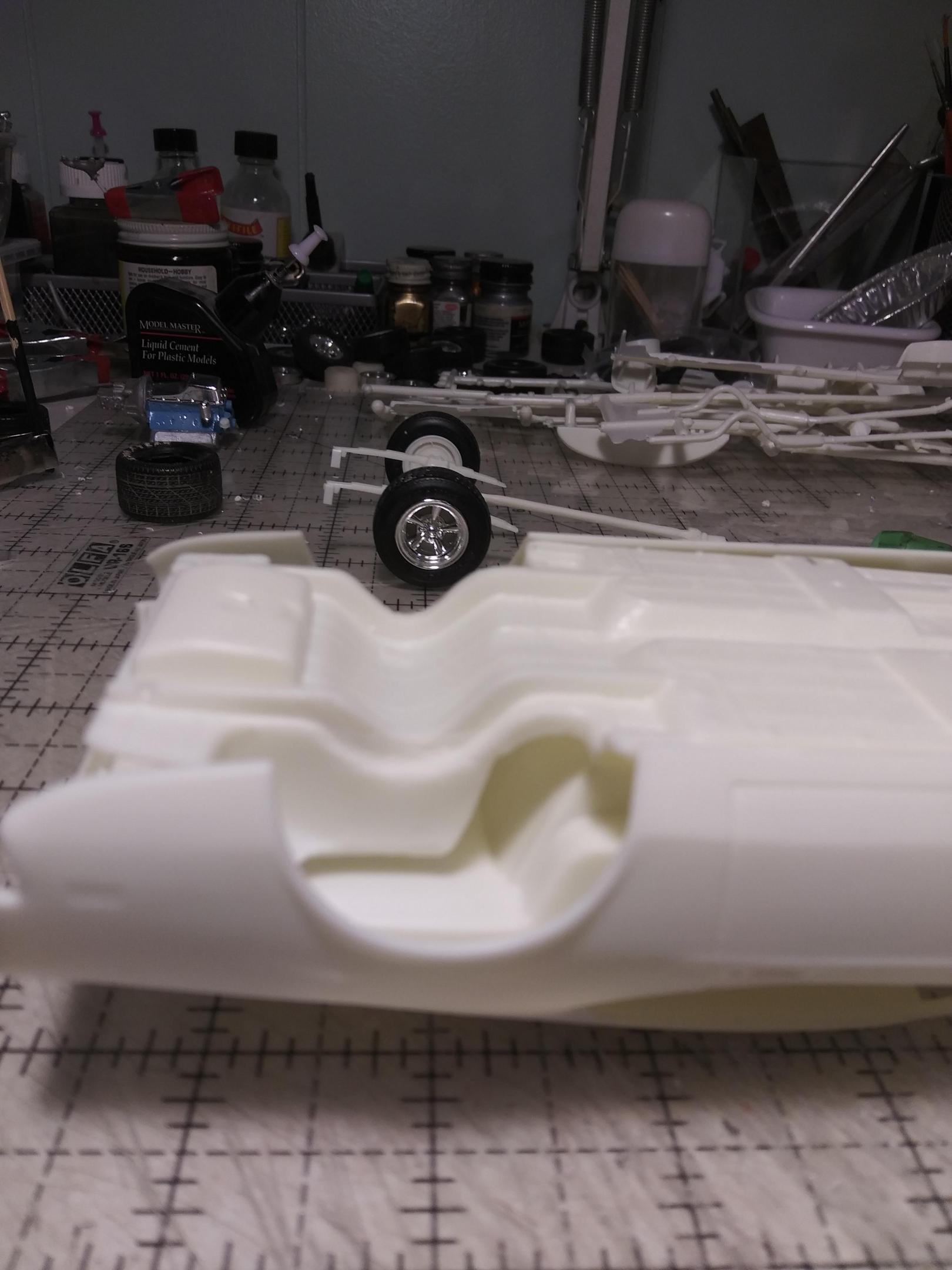 Finally!! got everything on the chasis lined up and glued. Got wheels painted. Is there a kit out there anywhere with a decent looking 351? The one in this kit is ?!!