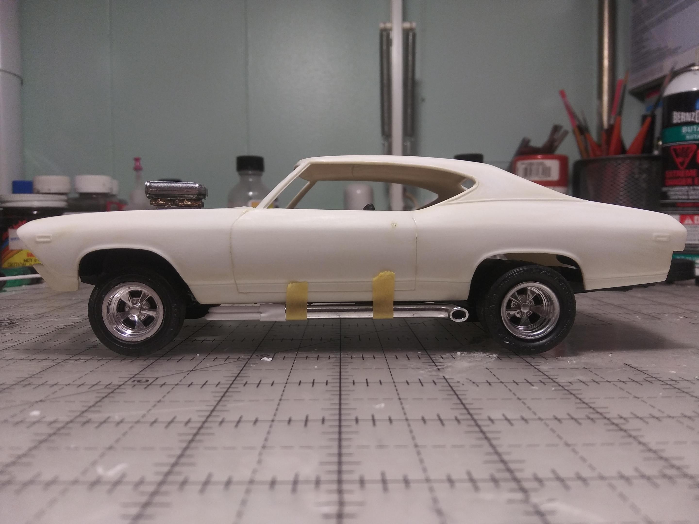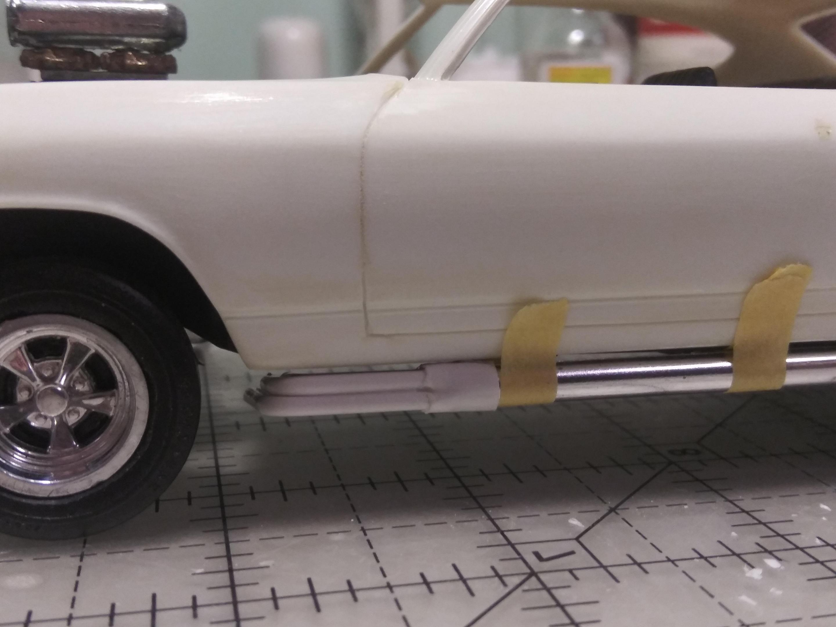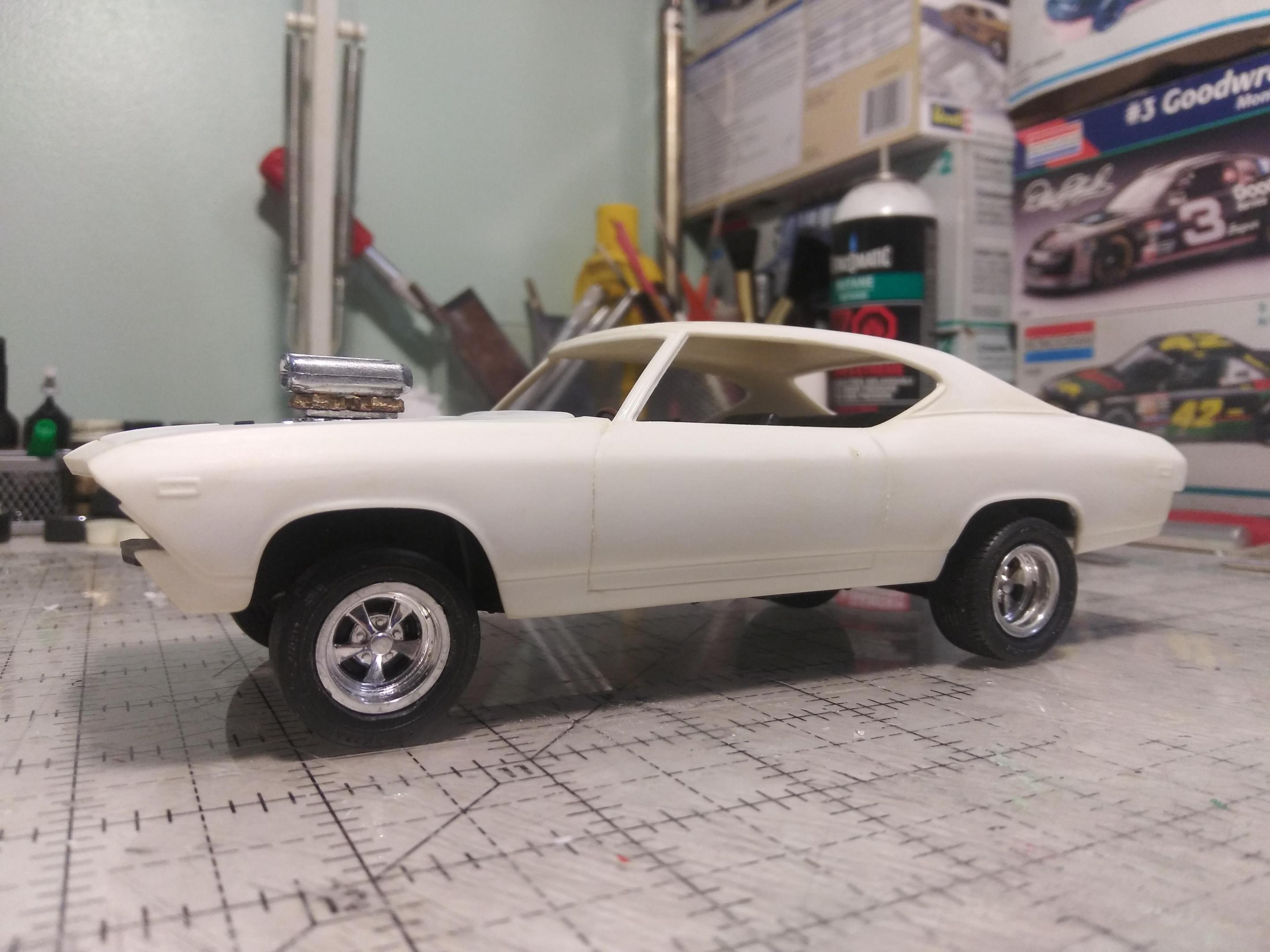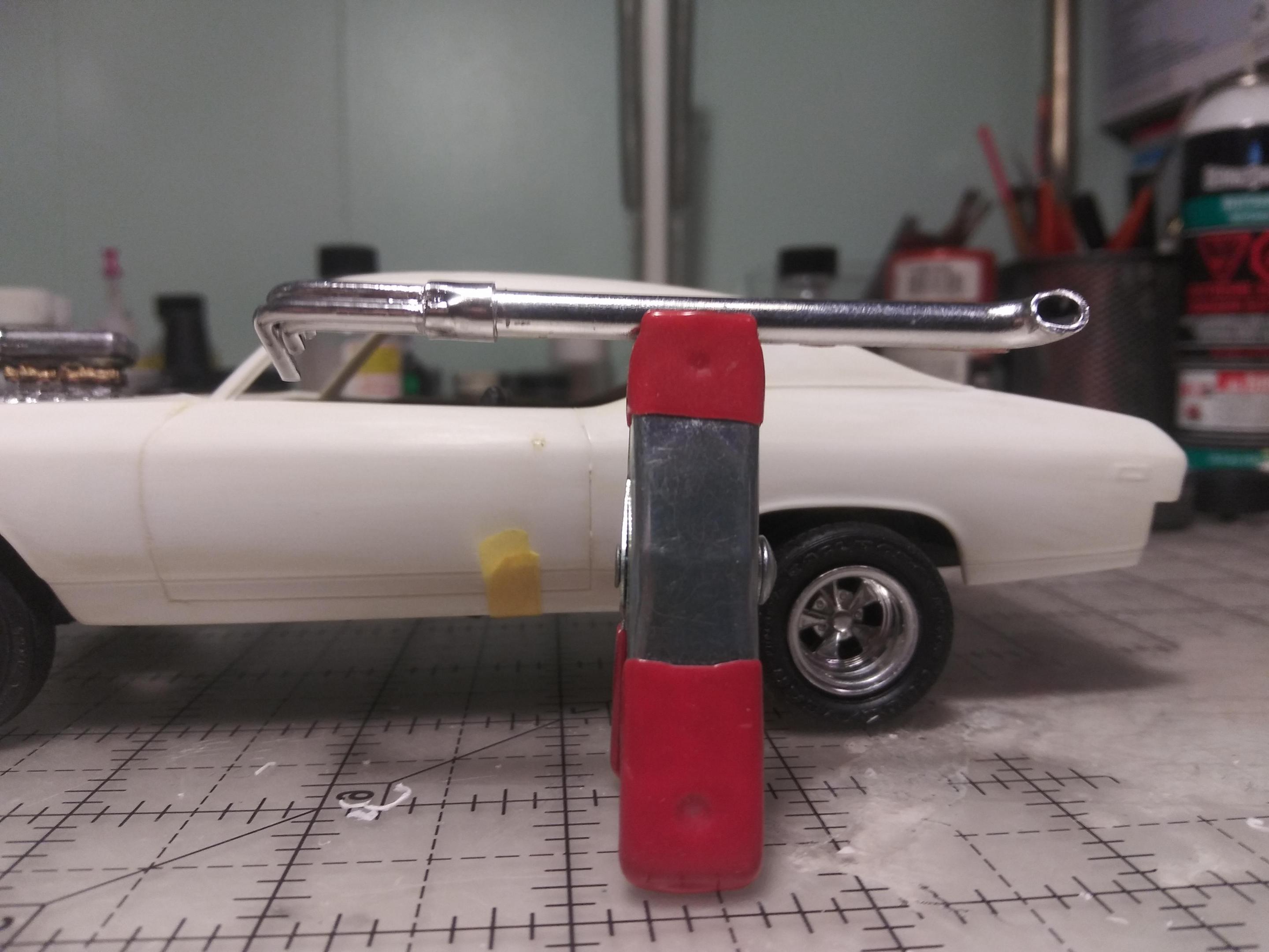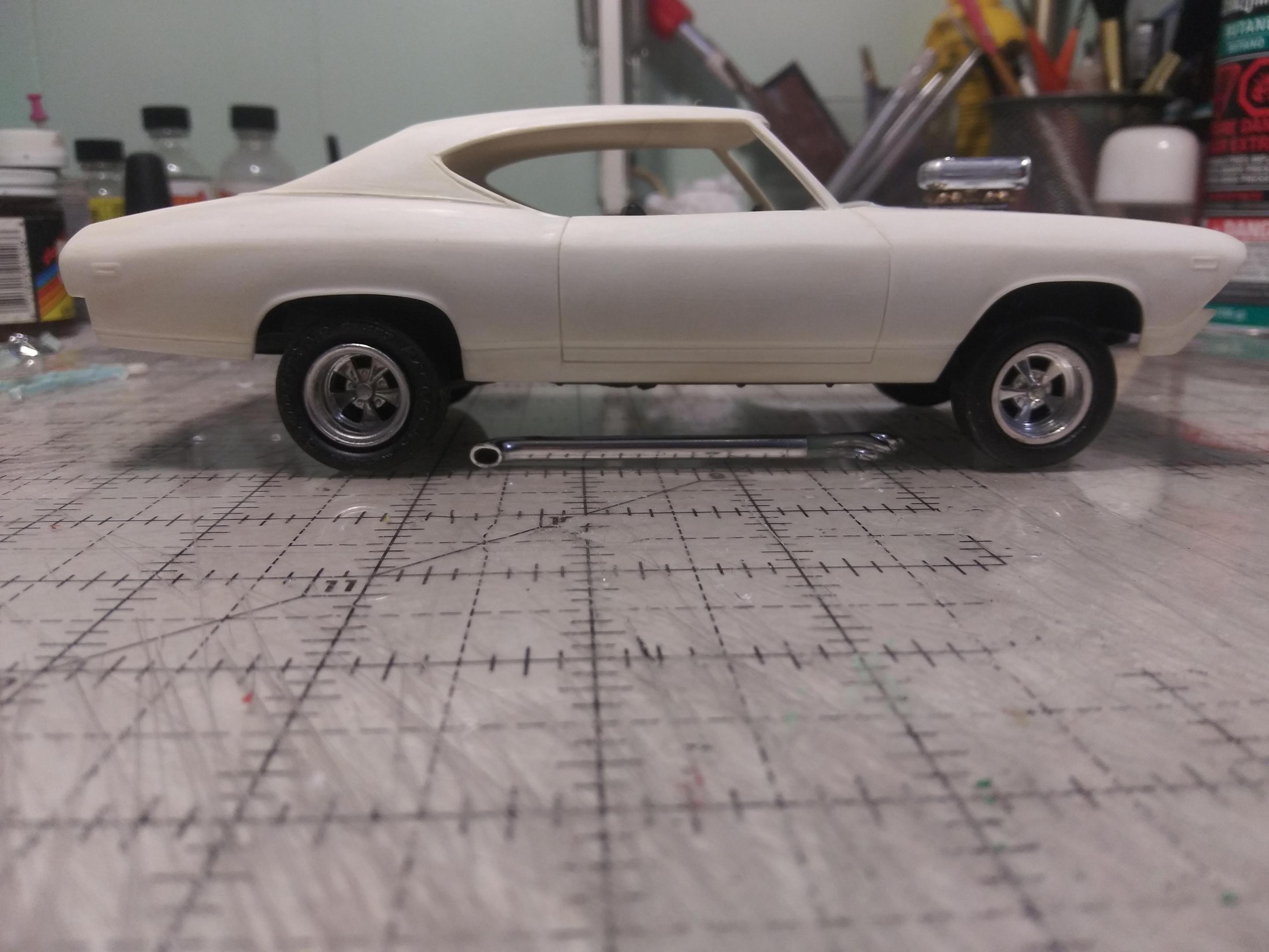Got a little more done on the malibu/chevelle. Scratch built header style inlets for the side pipes, and dropped the carbs down a little on the blower. Any input or comments always welcome. Also removed emblems.